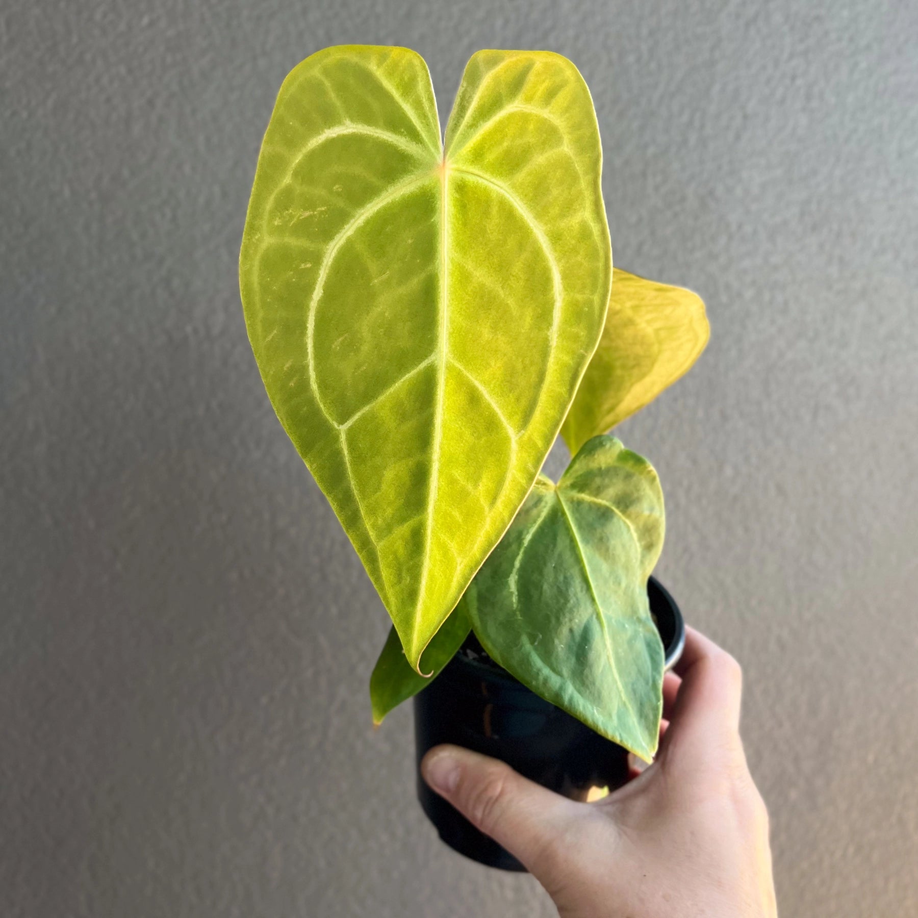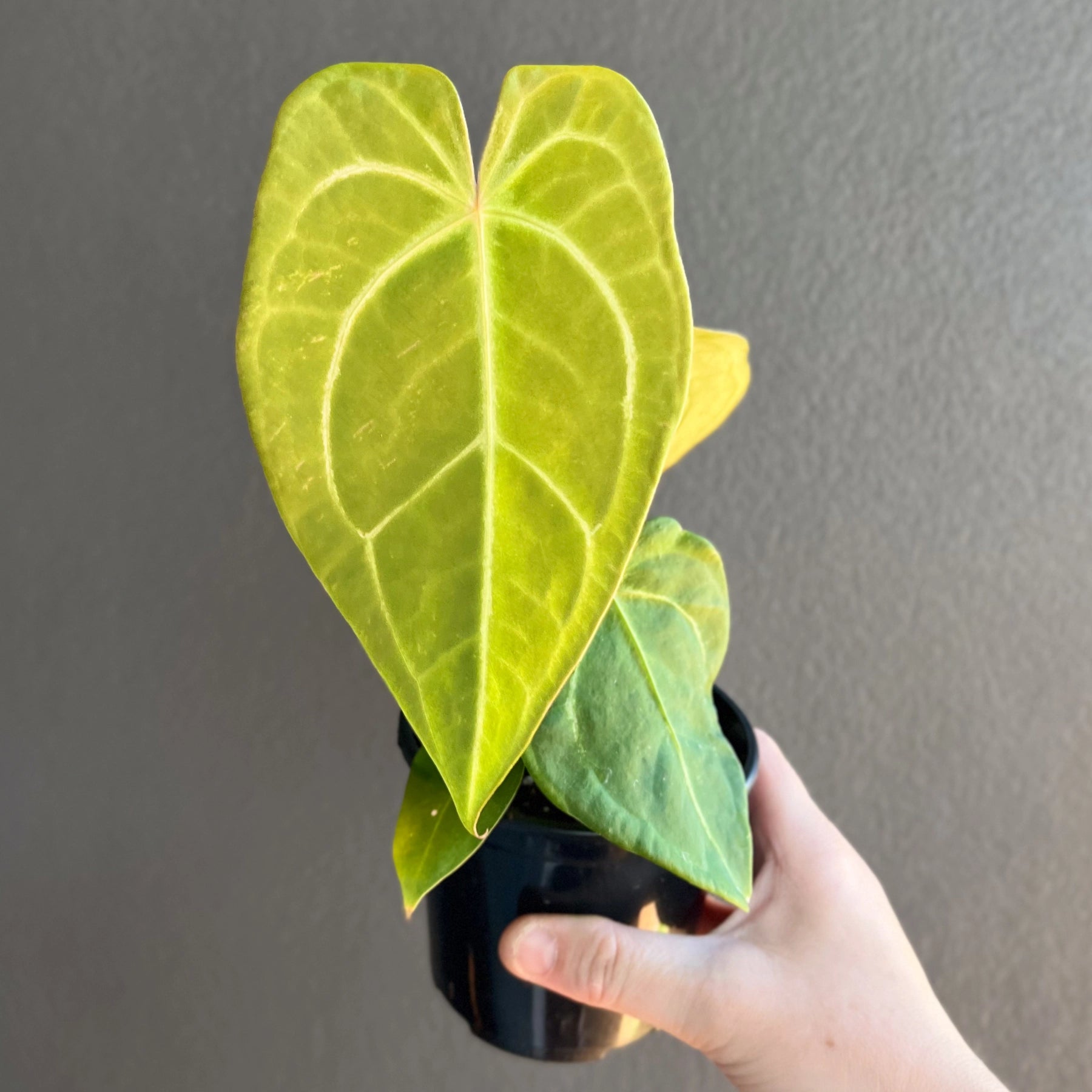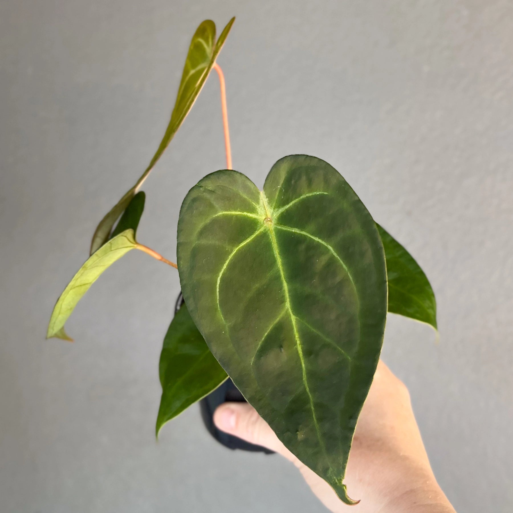 Anthurium papillilaminum x is a seed grown plant with a softer, more sculpted look compared to the heavier velvets. New leaves emerge a deep olive tone and slowly darken as the surface builds a fine suede texture. The shape stays narrow and elegant with a slight curl along the edges that gives it a refined, mature feel. It grows happily in bright filtered light with steady humidity and a loose aroid mix that dries slightly between waterings. The final photo shows the parent plant so you can see the line this seedling comes from and the traits it is likely to carry forward.