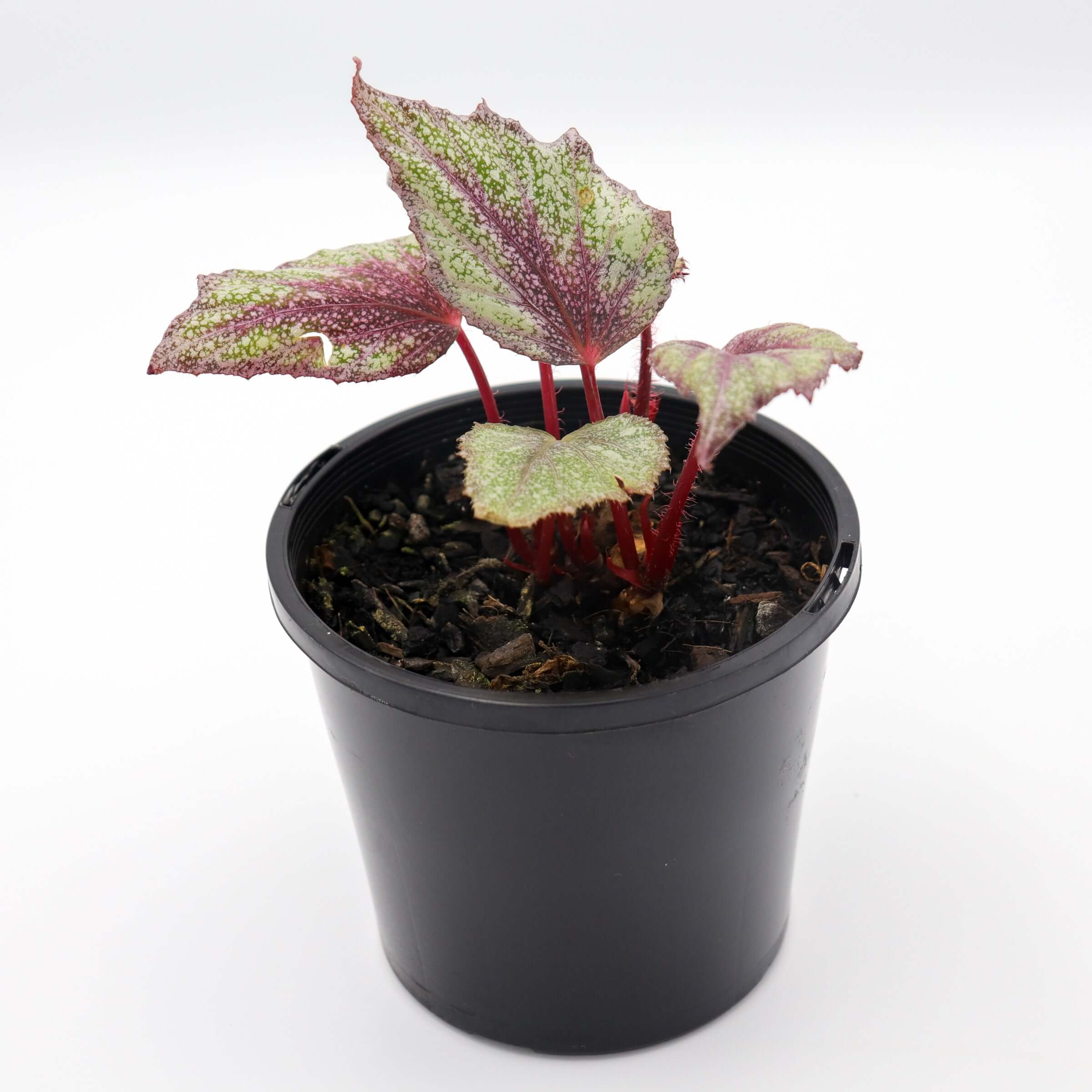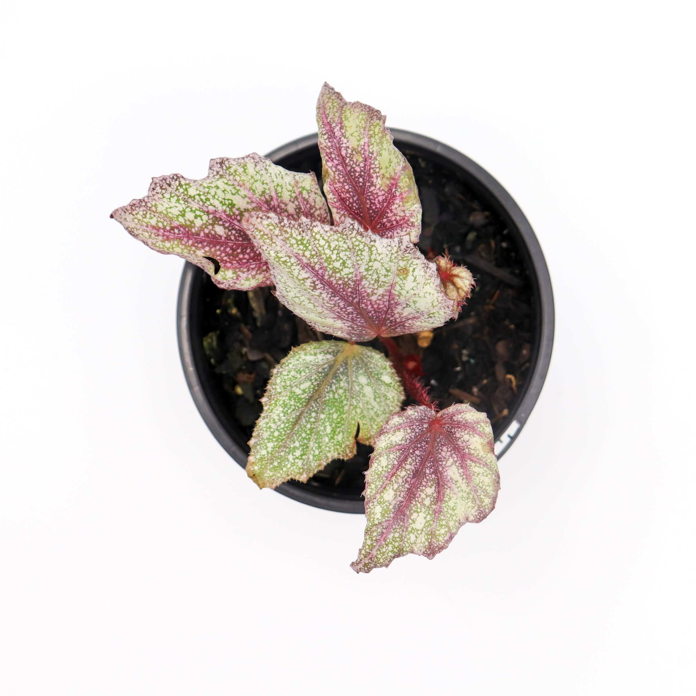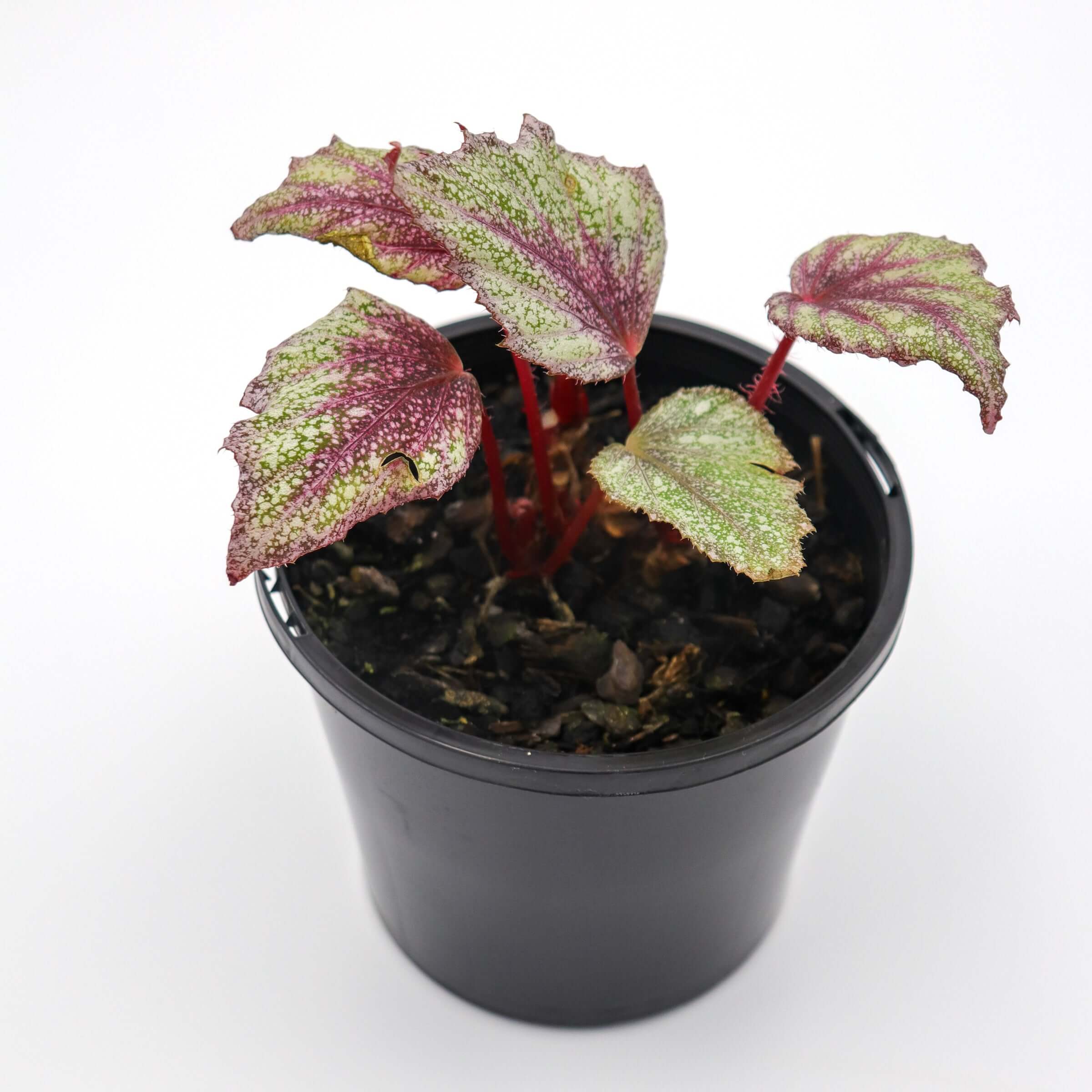 The Begonia Rex Freckles is an eye-catching plant with burgundy-green leaves speckled with white dots! It is a bold, textural plant with soft, fuzzy stems and leaves.