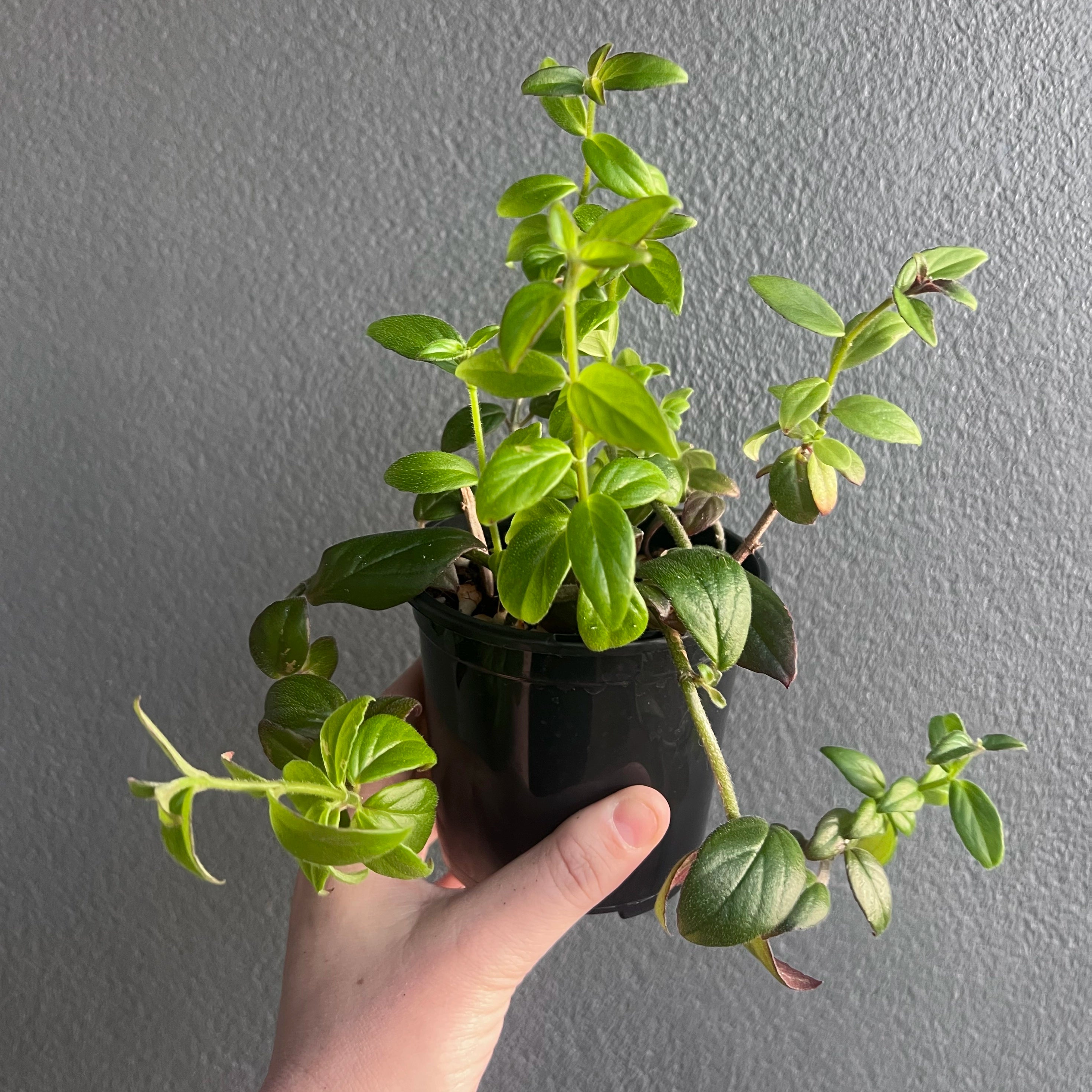 Columnea crassifolia 'Hunter Red' is a trailing indoor plant featuring thick, succulent-like foliage and bright red, tubular flowers. The leaves are small, fleshy, dark green, and slightly glossy. It grows well in bright, indirect light and prefers moderate humidity. Ideal for hanging pots or shelves, this variety produces vivid red flowers that emerge along the stems.