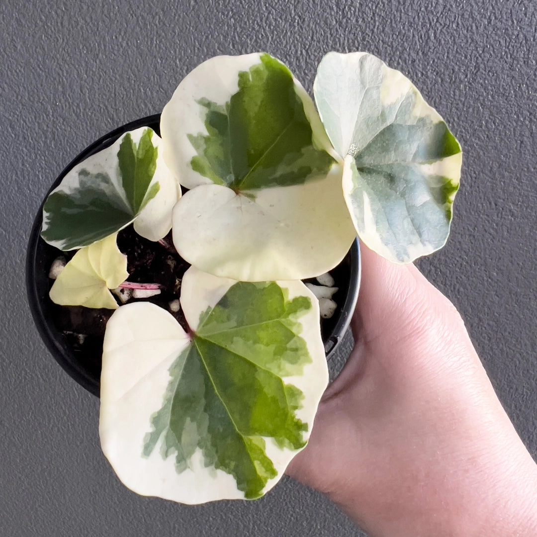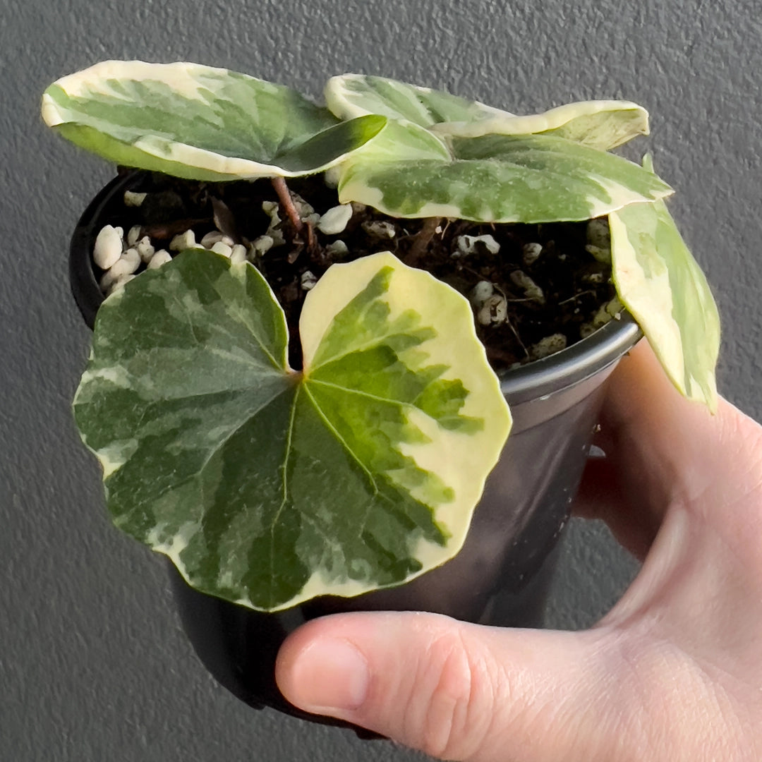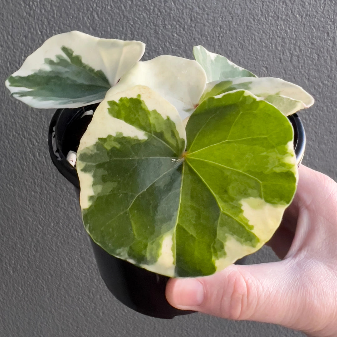 Introducing the Variegated Tractor Seat plant, known as Farfugium japonicum 'Argenteum' variegated and previously known as the Ligularia tussilaginea Albo Marginata.