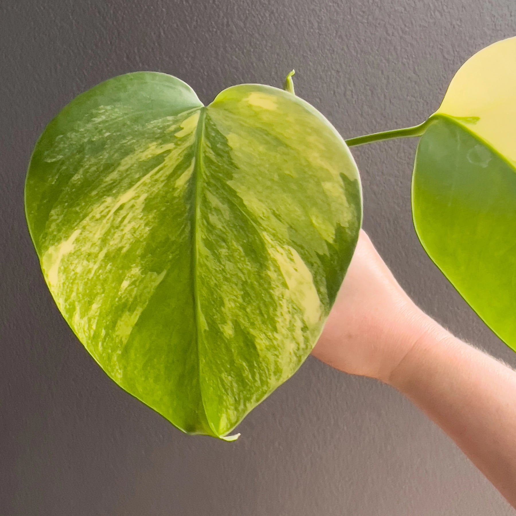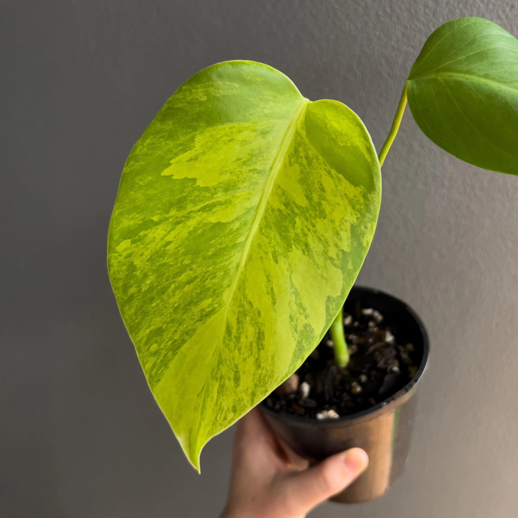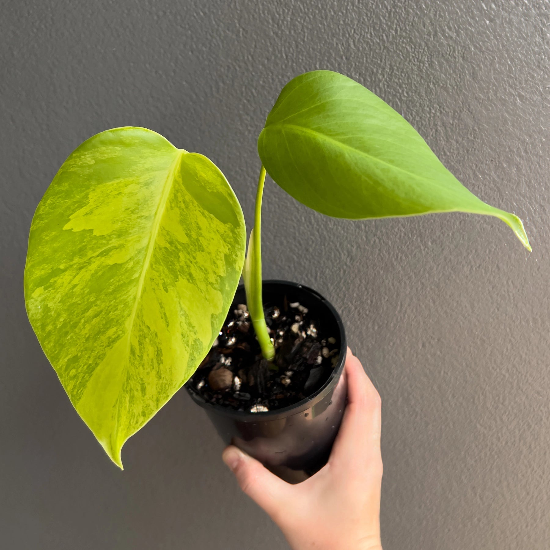 Due to the golden variegated leaves, the Monstera deliciosa borsigiana 'Aurea' Variegated is also known as the Golden Variegated Monstera. Compared to the Monstera deliciosa borsigiana 'Albo' variegated, 'Aureas' are known for their slightly slower growth rate and more delicate nature. This variety requires a higher level of care compared to the more common 'Albo' because its leaves are very prone to browning. They also require higher light to bring out the golden colouring on the leaves. When a new leaf unfurls, the initial variegation on the new leaves is a lighter green colour that gradually matures to a rich yellow or gold hue over approximately five to six weeks.