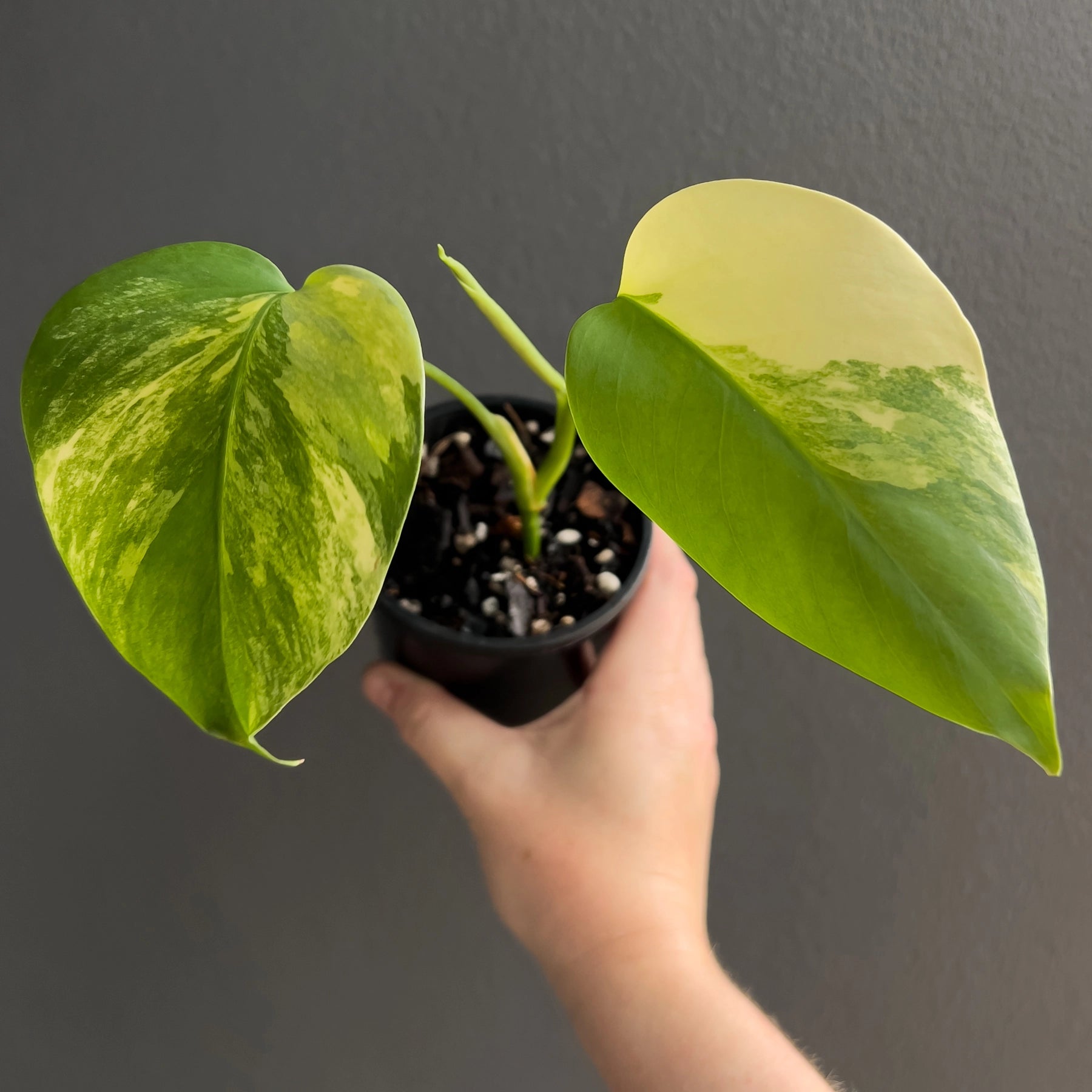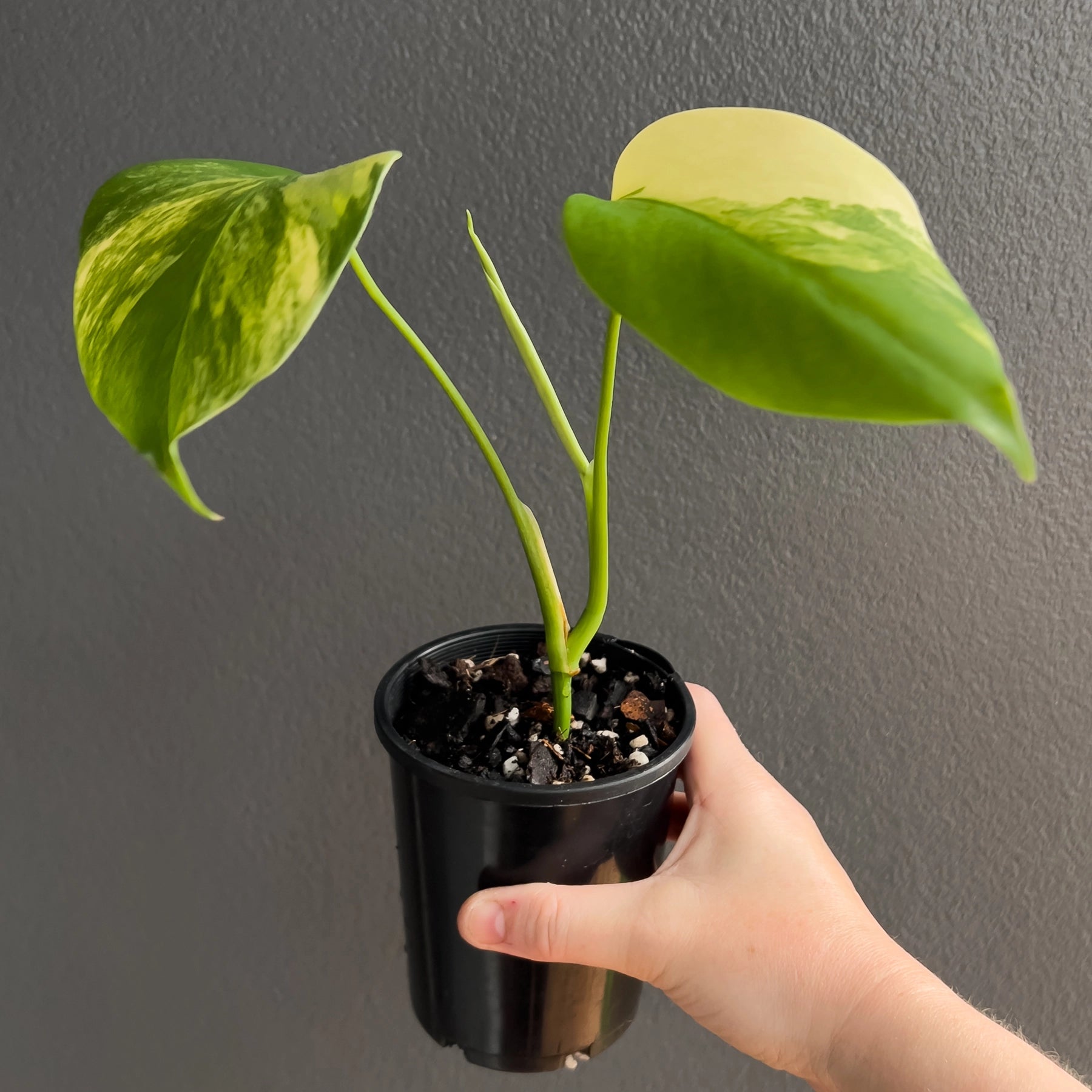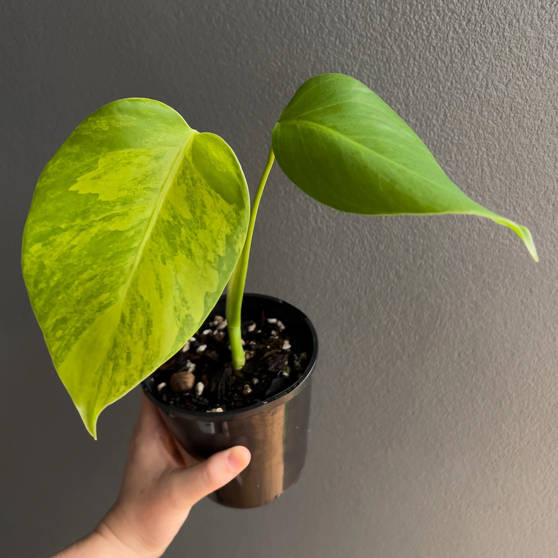 Due to the golden variegated leaves, the Monstera deliciosa borsigiana 'Aurea' Variegated is also known as the Golden Variegated Monstera. Compared to the Monstera deliciosa borsigiana 'Albo' variegated, 'Aureas' are known for their slightly slower growth rate and more delicate nature. This variety requires a higher level of care compared to the more common 'Albo' because its leaves are very prone to browning. They also require higher light to bring out the golden colouring on the leaves. When a new leaf unfurls, the initial variegation on the new leaves is a lighter green colour that gradually matures to a rich yellow or gold hue over approximately five to six weeks.