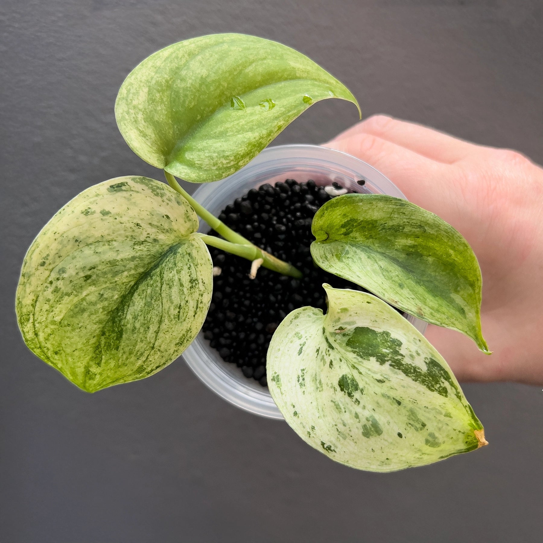 Scindapsus jade satin silver splash (Emerging Roots) has thick, satin-finish leaves with soft silver splash patterns across the surface. The newest growth shows clear silvery markings and the plant has fresh white roots beginning to appear through the perlite. It is a tidy young starter with an active node and will continue to root quickly with warm indoor conditions.