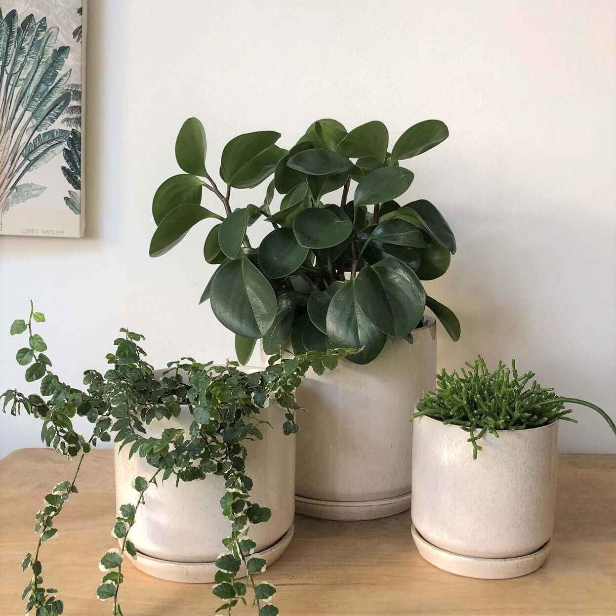 Our small Sandstorm stoneware pot has a stunning speckled finish. They are a classic combination of form and function. The base sits in a matching saucer which is perfect for potted plants as they have a draining hole. The simple design complements all interior styles from contemporary to federation homes.