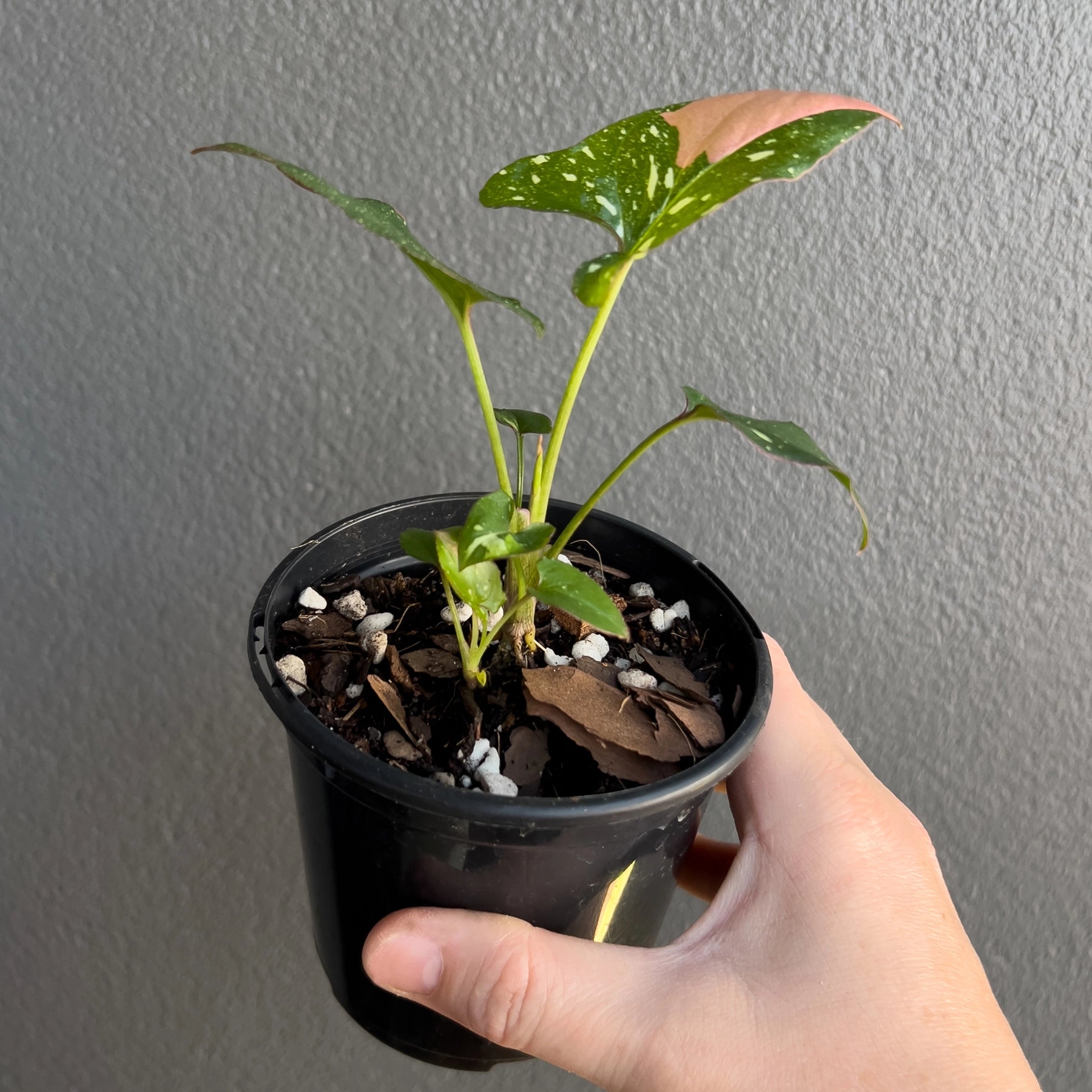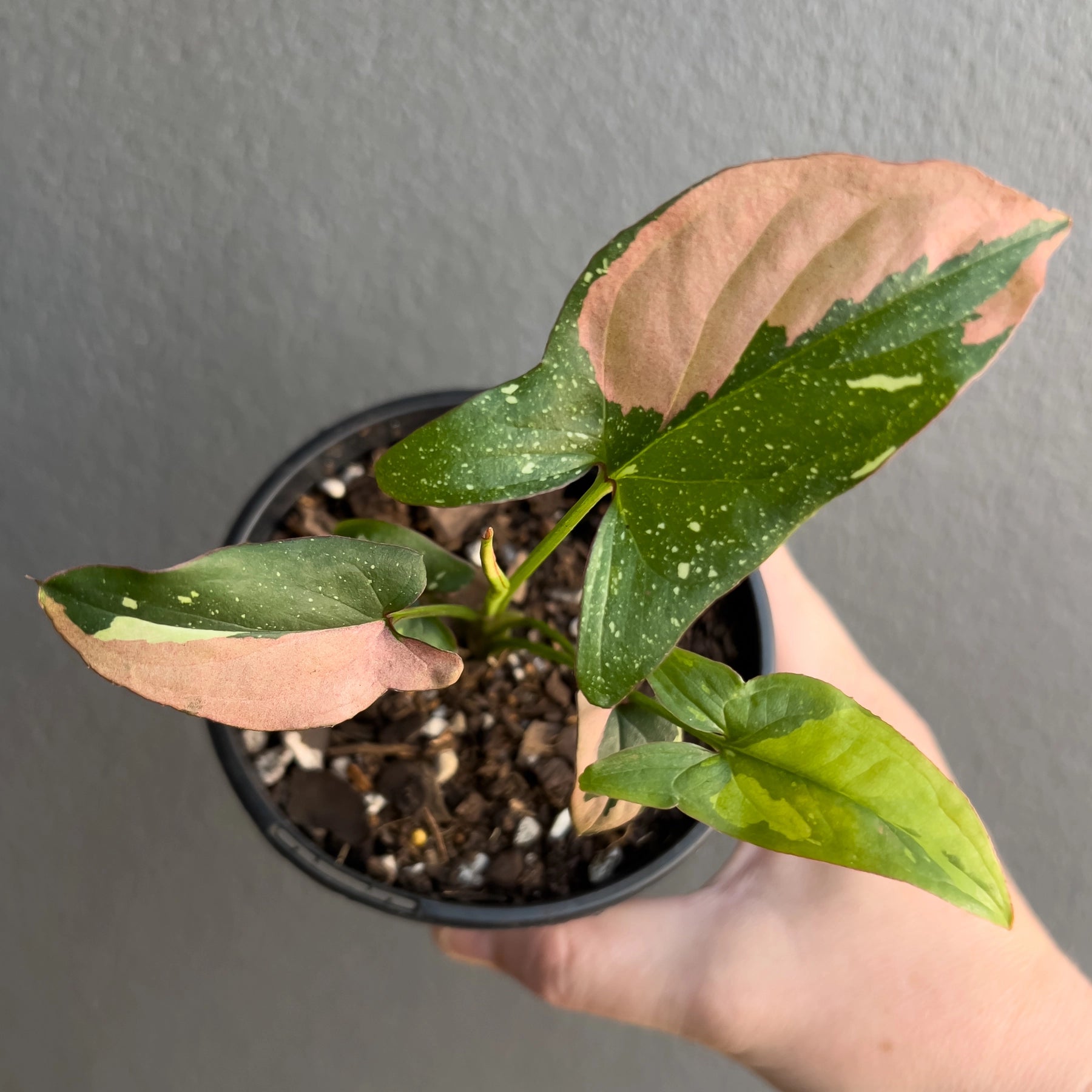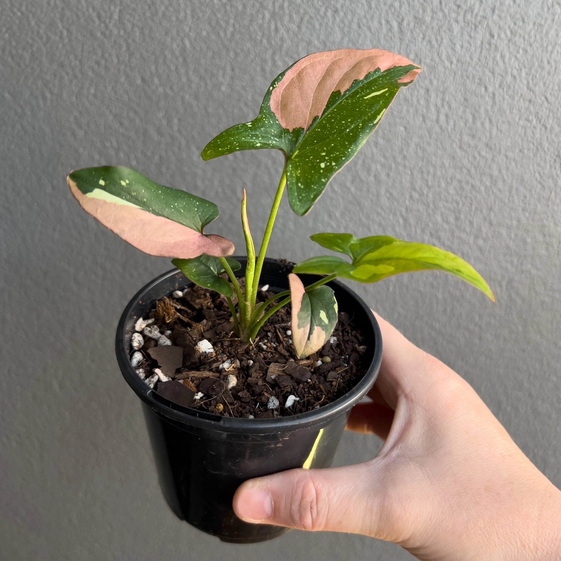 Syngonium Red Spot Tricolour is a highly sought after collector variety known for its unpredictable and expressive variegation. Each plant offered here is propagated from cuttings taken from our established mother plants, not tissue cultured. Foliage displays a mix of green and white with bold red to pink splashes, blocks and sectoring. Some leaves carry all three colours at once. In my experience growing many of these, they can produce fully pink leaves, green and white speckled leaves, pink and white combinations and everything in between. No two plants are the same, which is exactly why this variety remains so desirable among rare plant collectors.