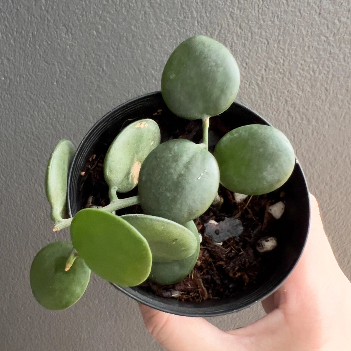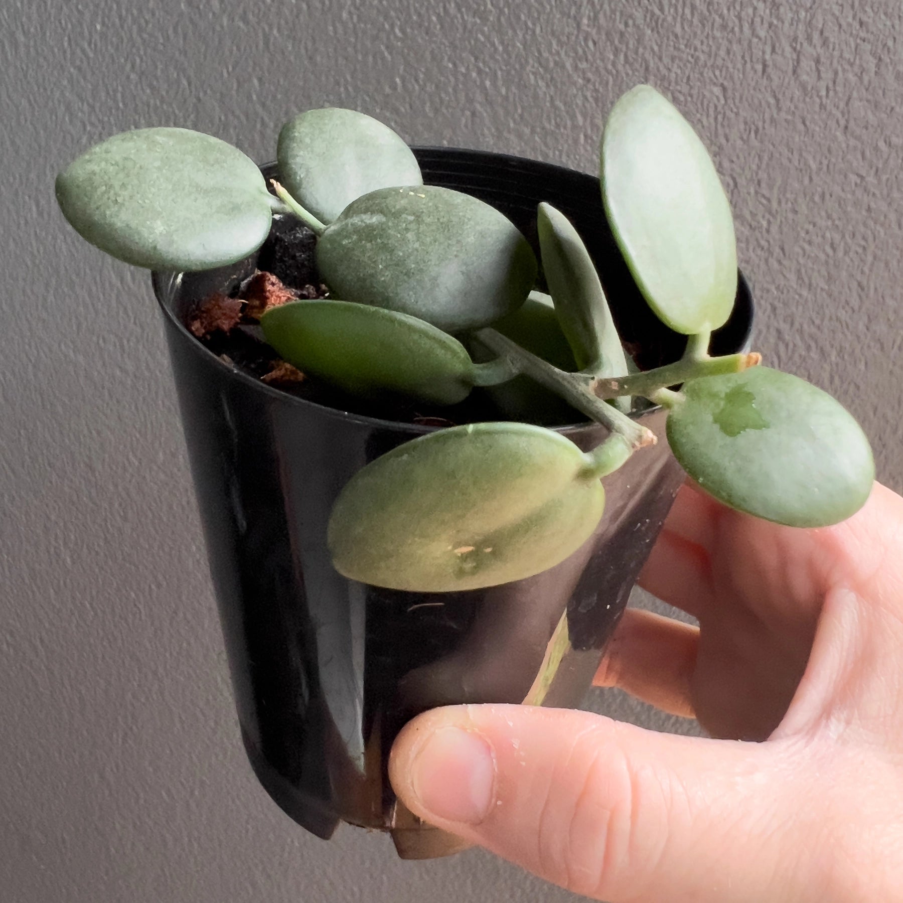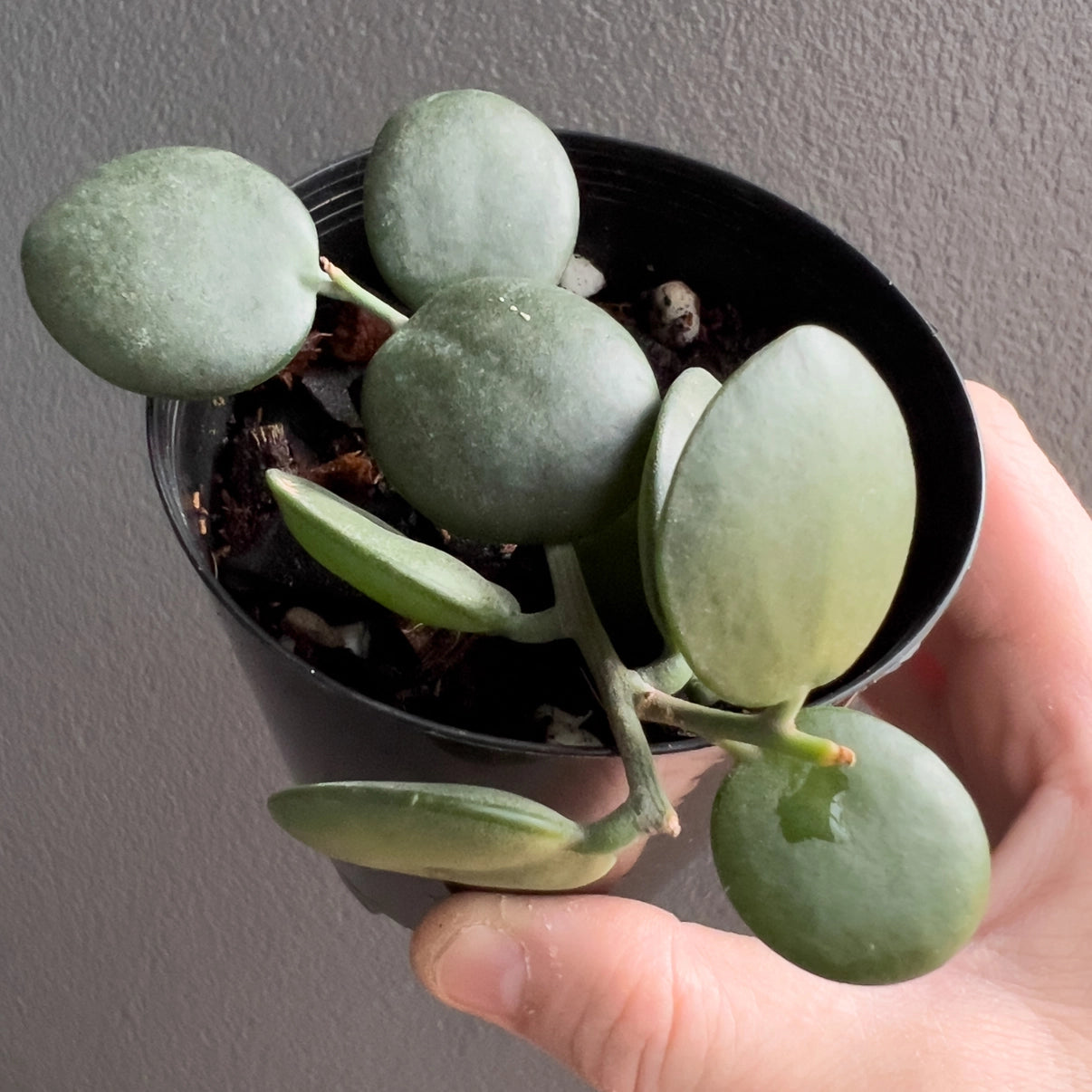 The Silver Dollar Vine thrives in bright light. During the growing season, water it frequently and deeply, but allow the soil to dry out a bit between watering sessions. Keep it relatively dry during the winter months. The Silver Dollar Vine does not require significant amounts of fertiliser, we use half-strength in the growing season.