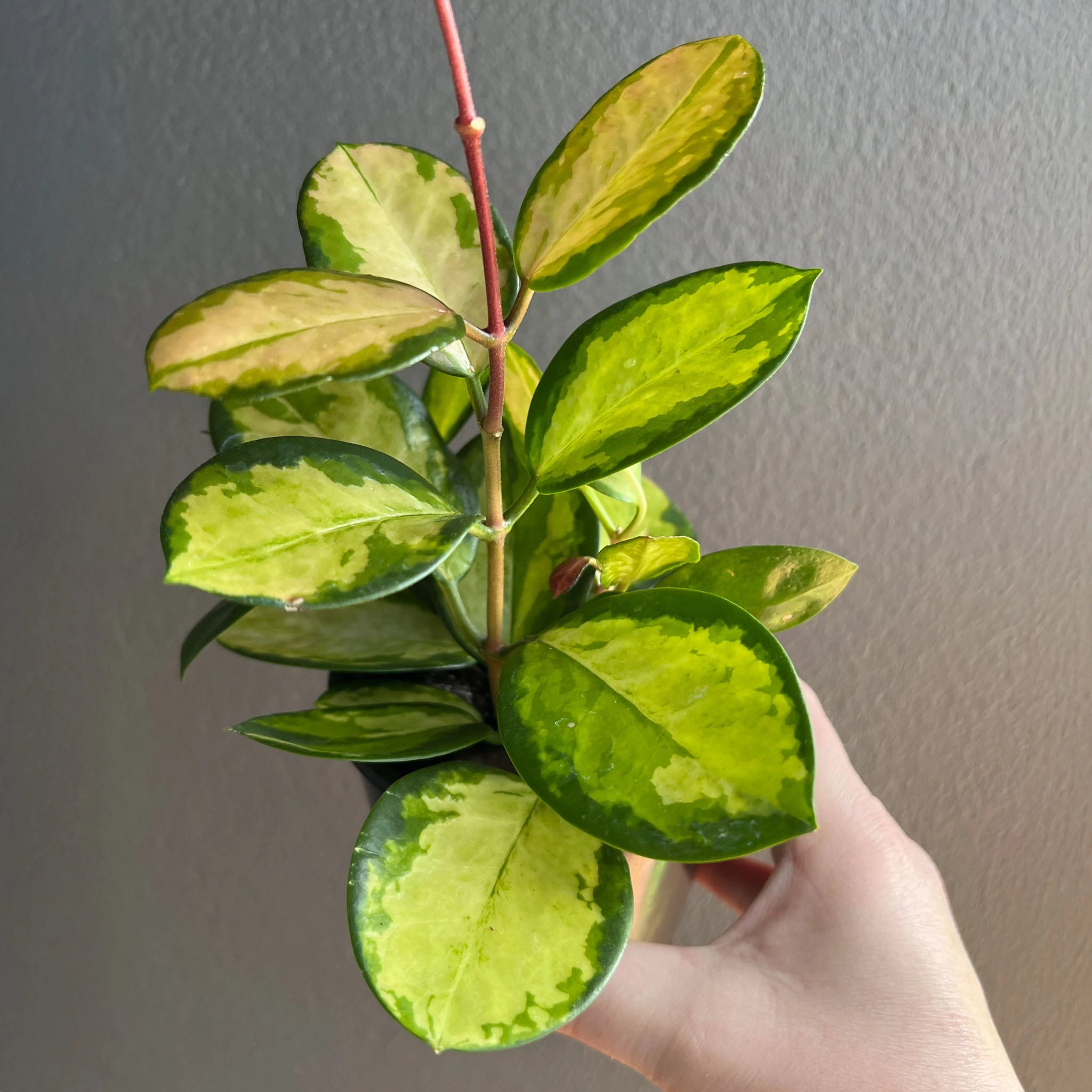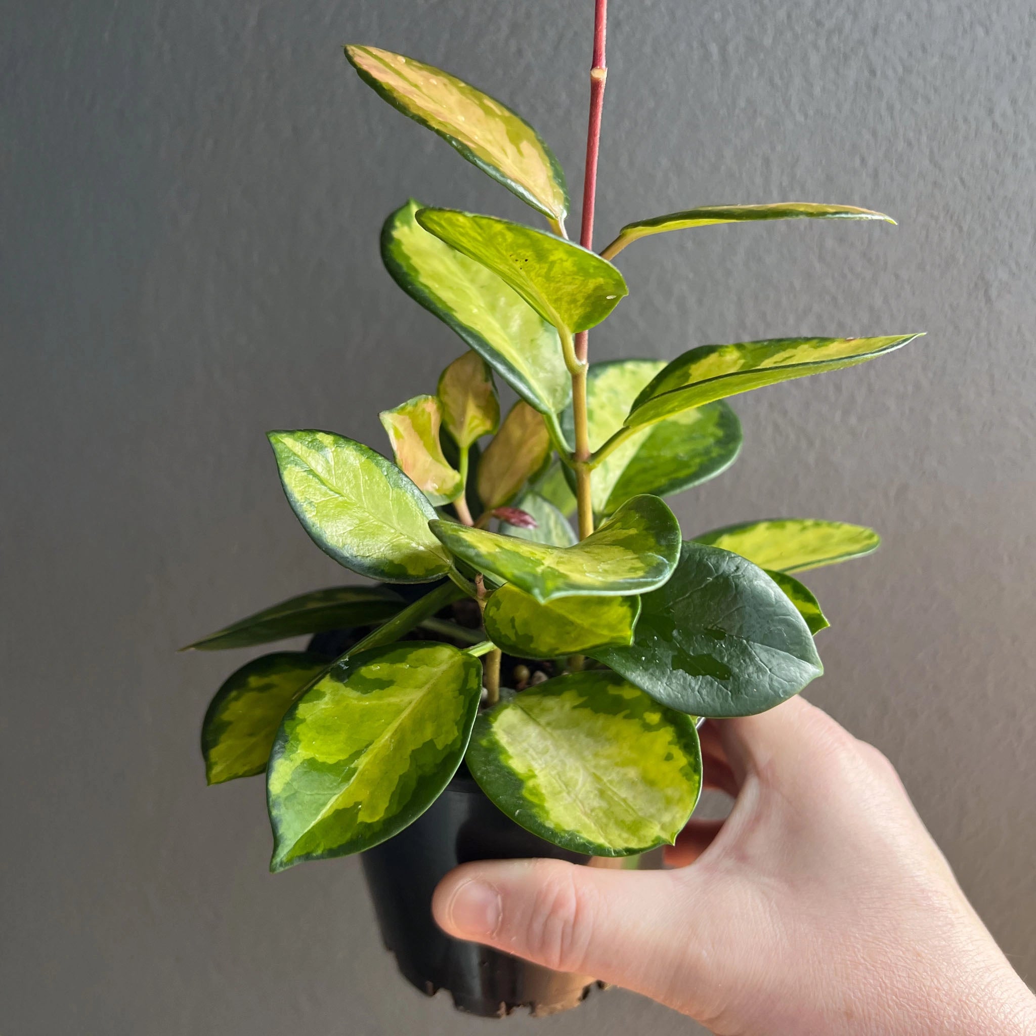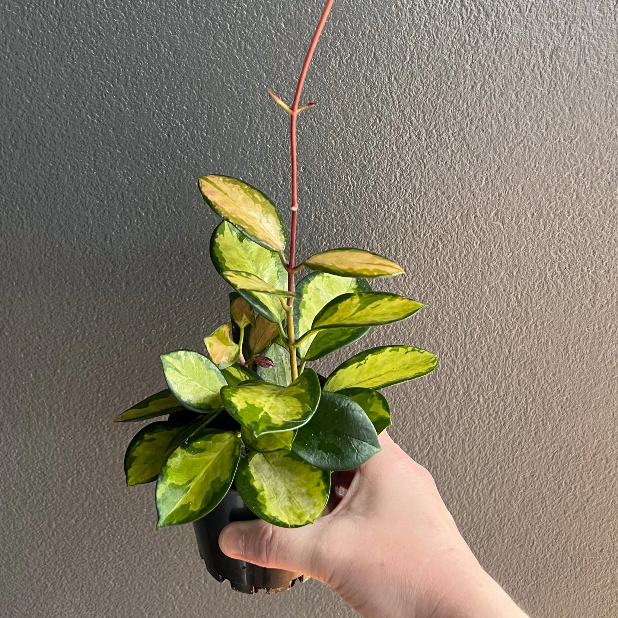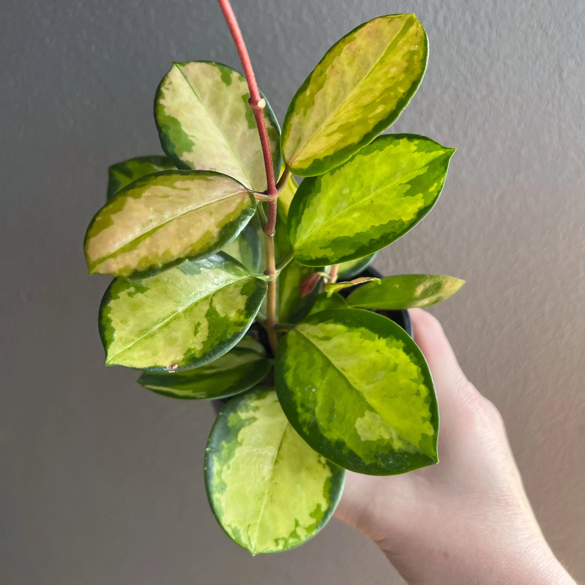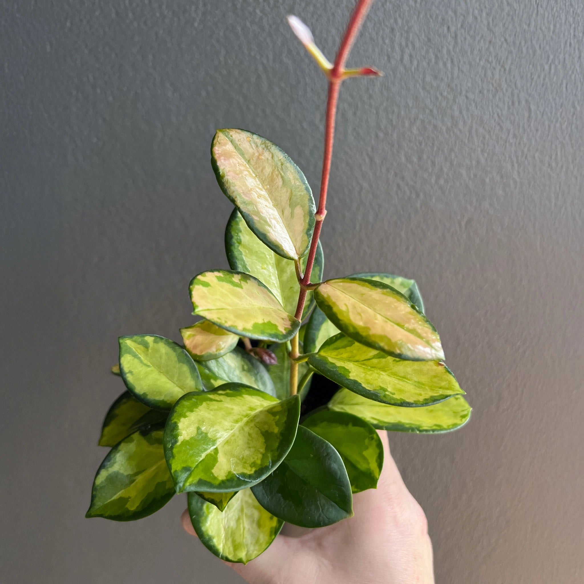 Hoya australis 'Lisa', commonly known as Hoya 'Lisa' is a striking variegated version of the Hoya australis. As a variegated plant, you may occasionally notice leaves that resemble the standard australis variety. What sets the Hoya 'Lisa' apart is its tricoloured leaves in shades of green, pink, and pale chartreuse. This particular variety showcases a natural climbing tendency, gracefully ascending any support it encounters.