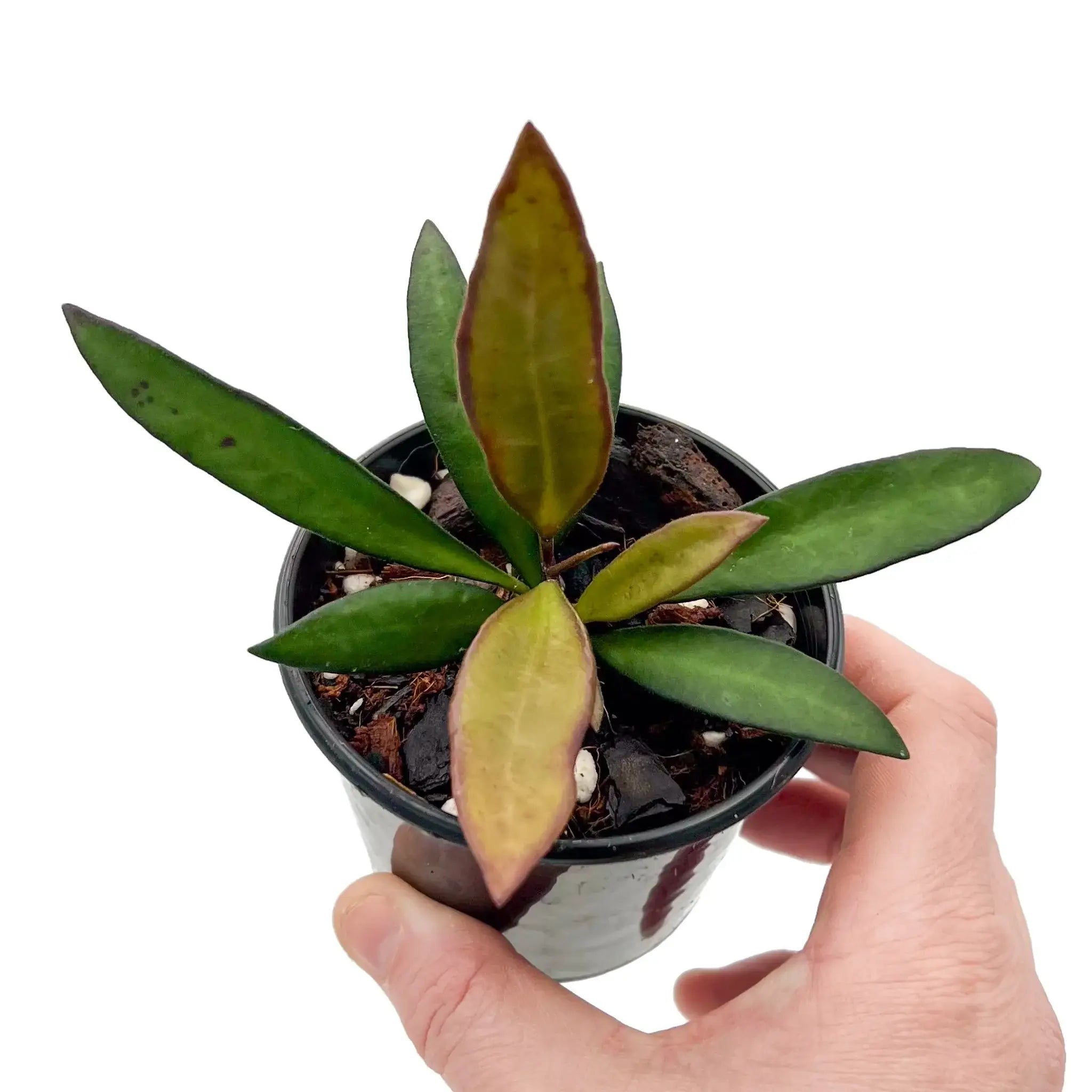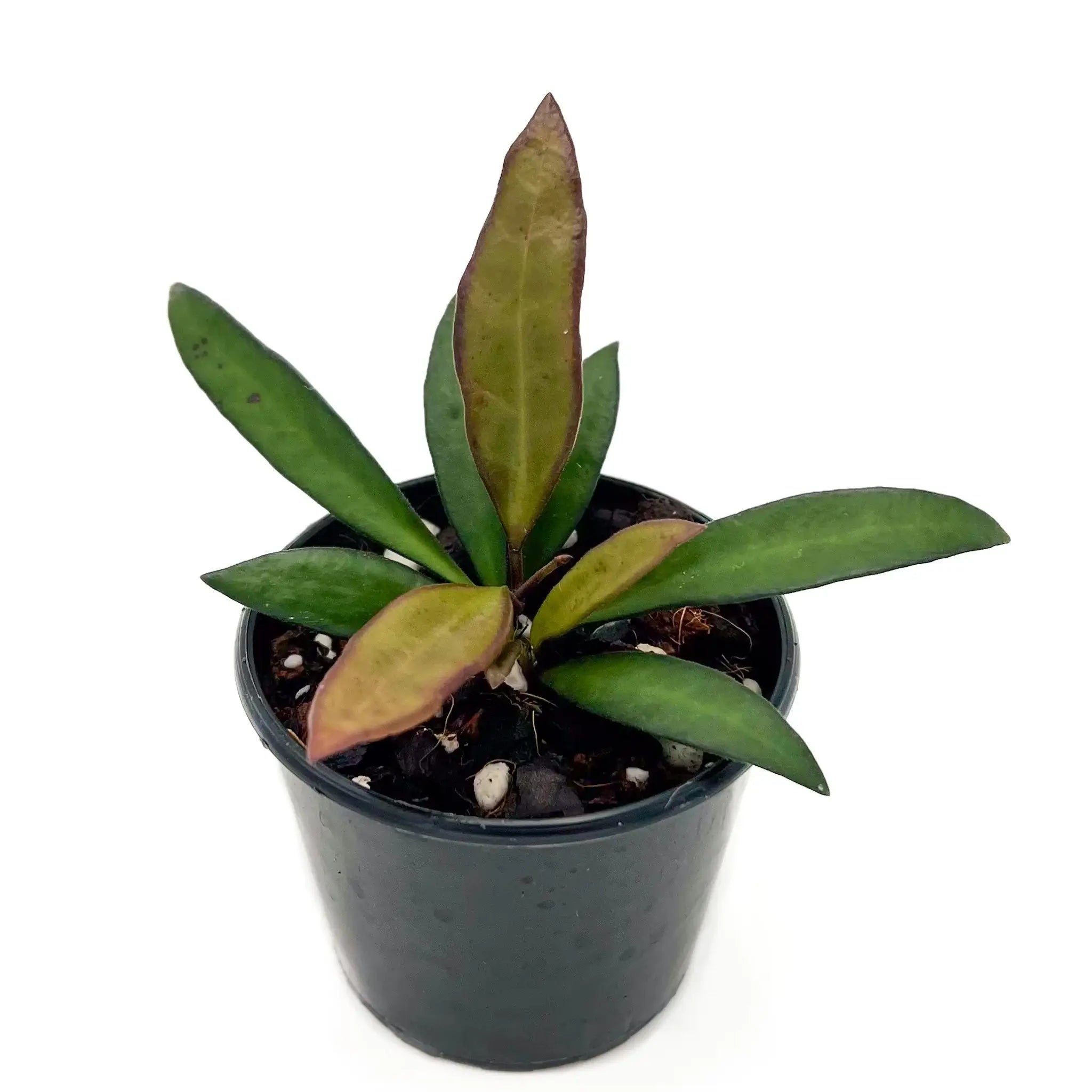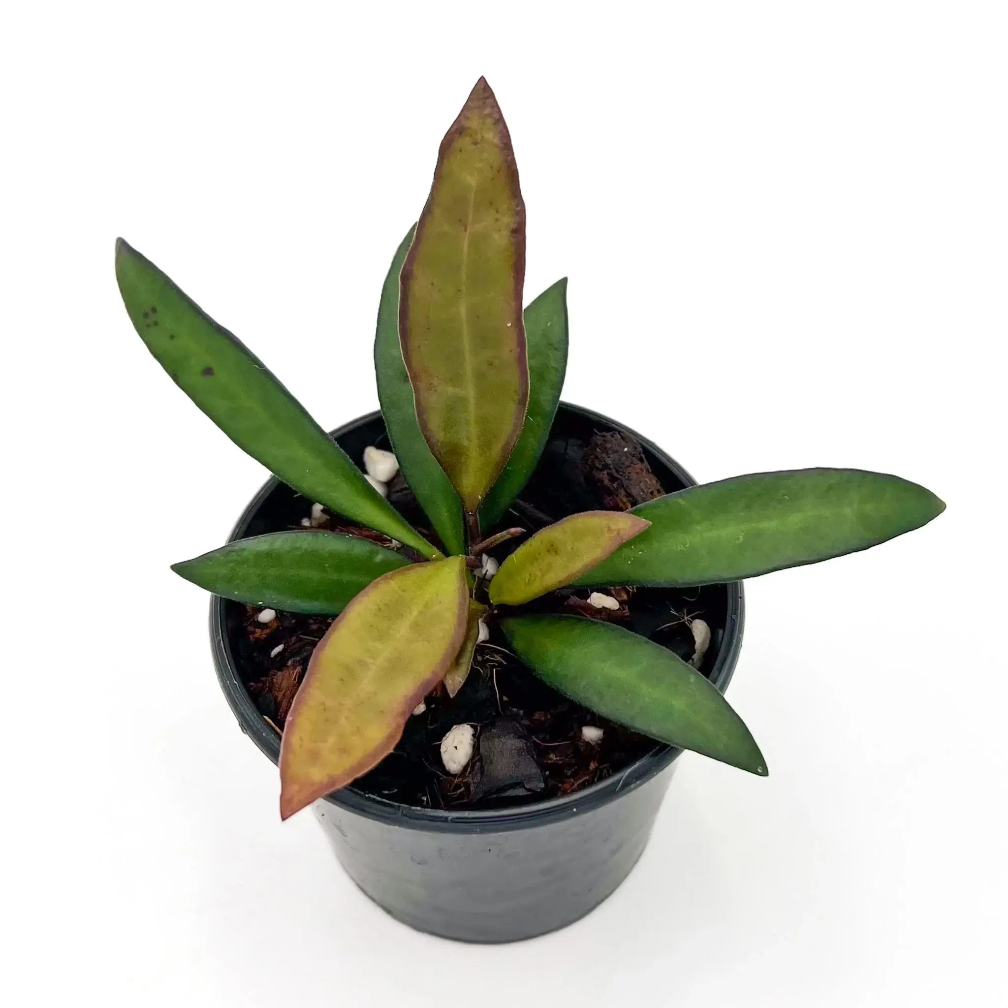 Hoya 'Rosita' is a hybrid between Hoya wayetii and Hoya tsangii, known for its slender, pointed leaves that flush deep red in bright light. New growth appears bronze before darkening to green, often retaining a reddish hue depending on conditions. With a semi-trailing habit and compact growth, this variety is ideal for hanging pots or small totems. When mature, it can produce clusters of small, richly coloured blooms.