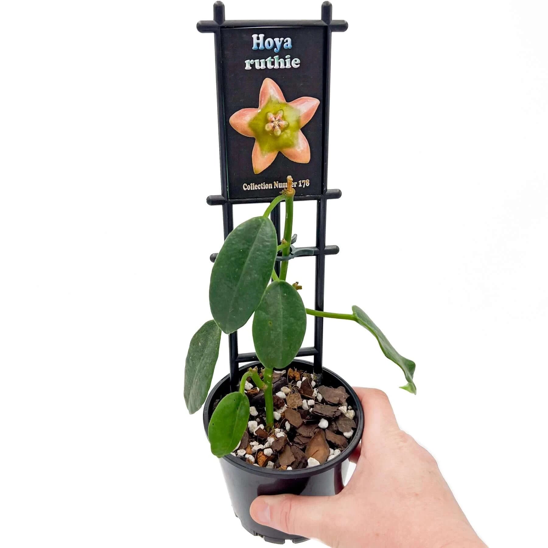 The Hoya 'Ruthie' is recognized for its large yellow and orange blossoms that exude a pleasant spicy scent. It's known for producing some of the genus's largest individual flowers, featuring a distinctive star-shaped appearance with an upward cupped curve. This cultivar is celebrated for its rapid blooming, making it a standout choice for enthusiasts.
