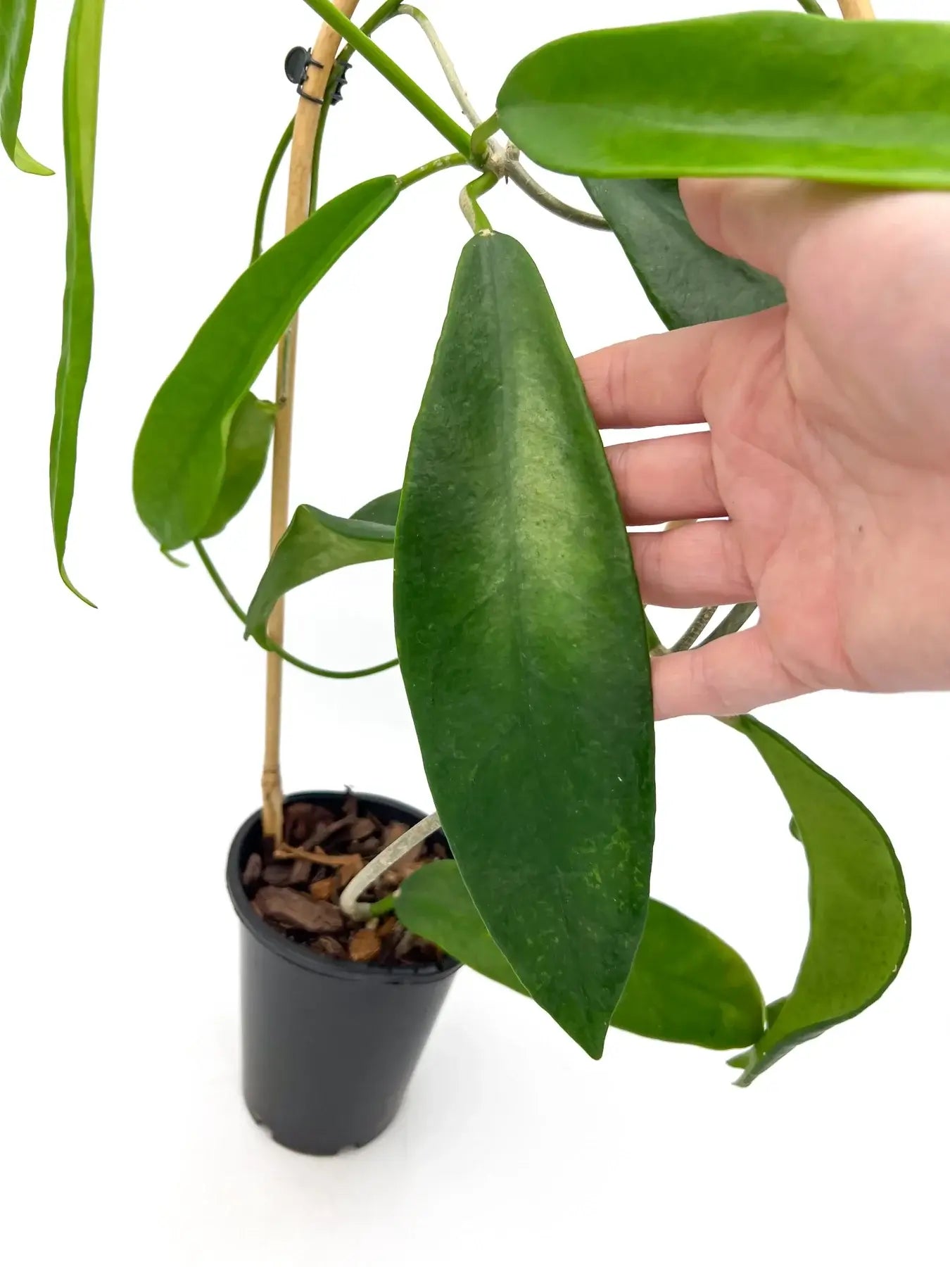The Hoya treubiana has exceptionally large jade-green, sculpted wax leaves measuring up to 60cm long. The blooms are stunning recurved red flowers. This Hoya is ideal for moderate to warm climates; adjust watering for winter dryness and summer moisture. This hoya showcases extraordinary size and deep green hues with a glossy finish.