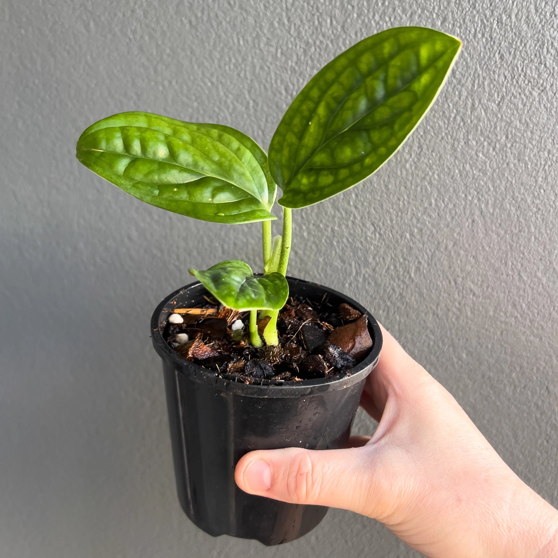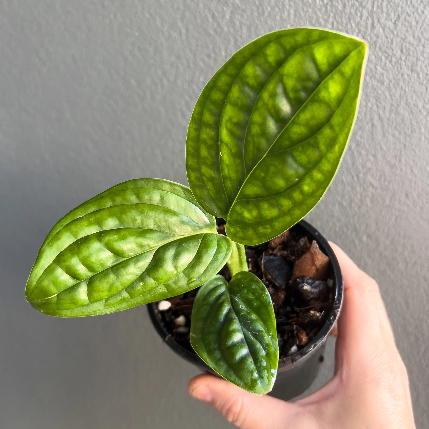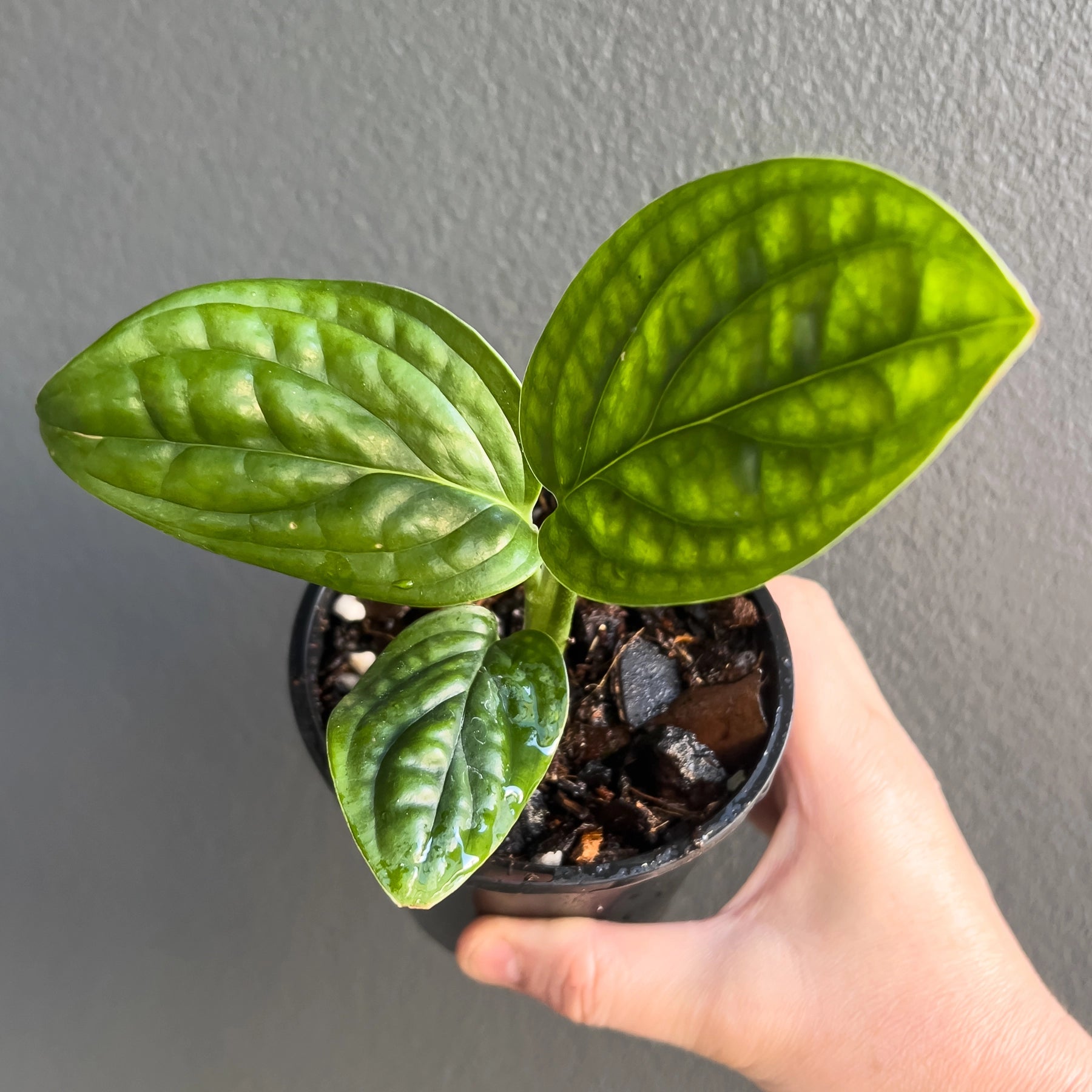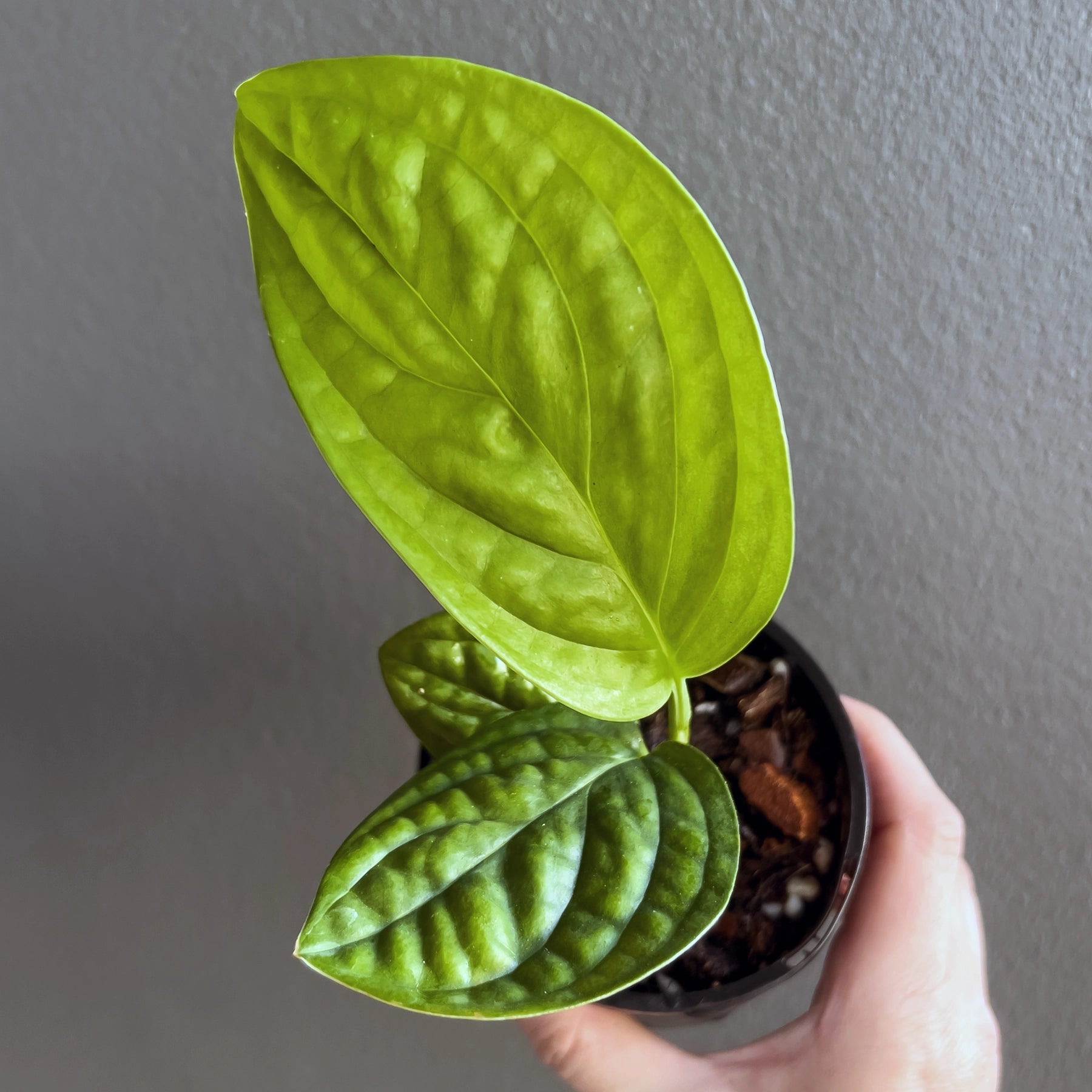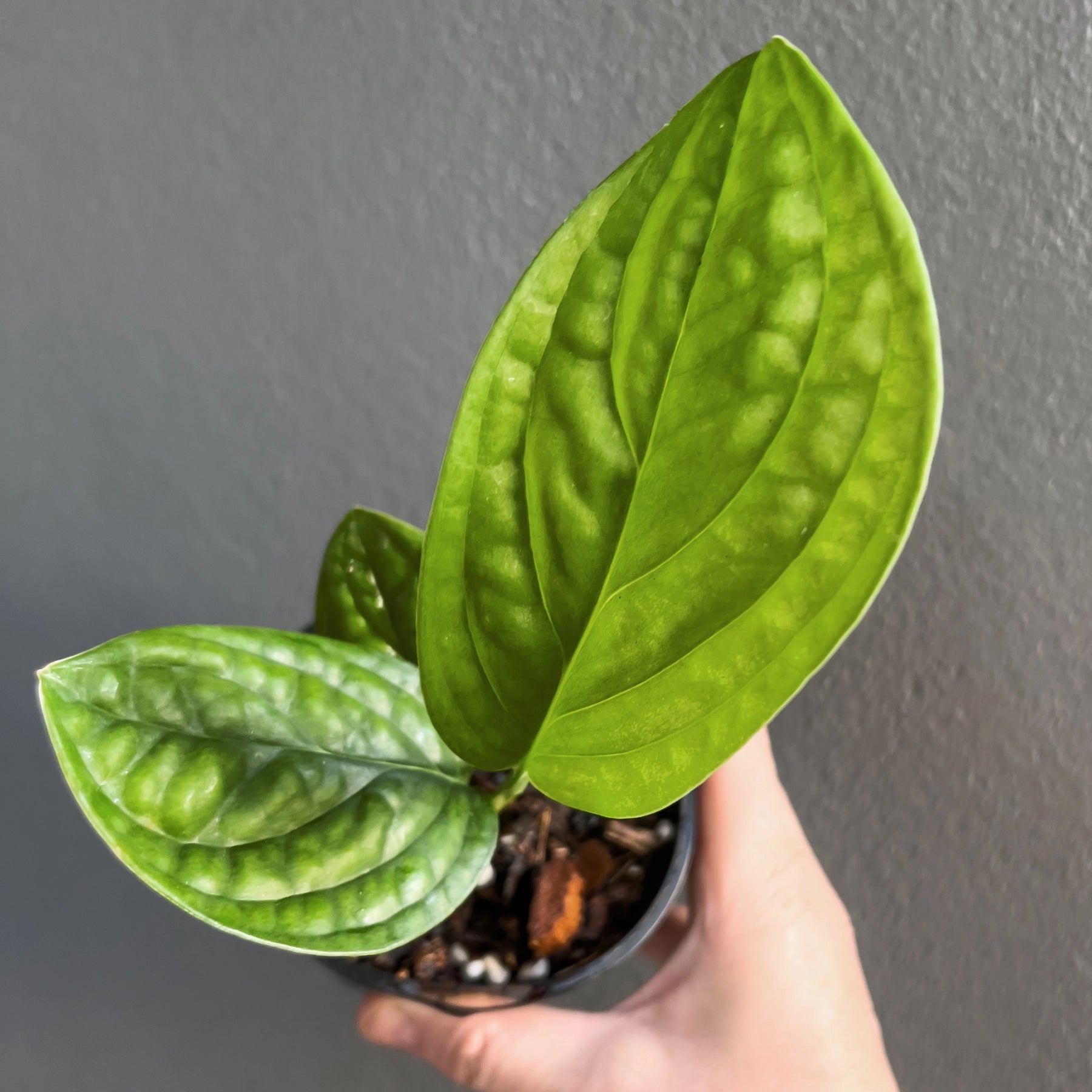 The Monstera karstenianum Peru is an unusual Monstera species that doesn't produce fenestrated leaves usually associated with Monsteras. Instead, the Monstera karstenianum 'Peru' variety has rounder, shiny, textured leaves with ridges and incredible veins. Provide a growing pole, and they will climb and produce large leaves. You can also have them cascading down from a shelf or mantle, but the leaves tend to grow relatively small this way.