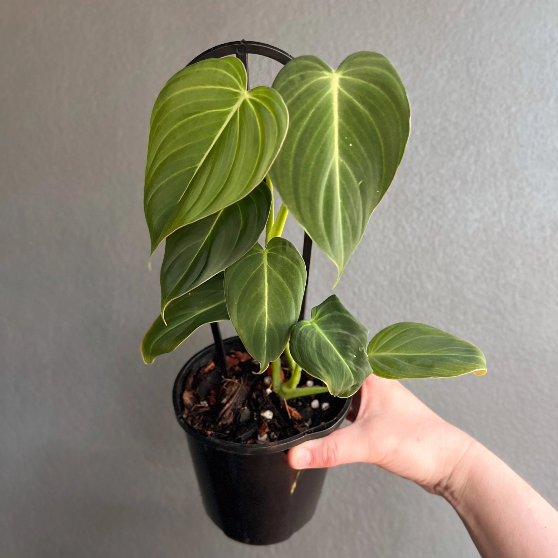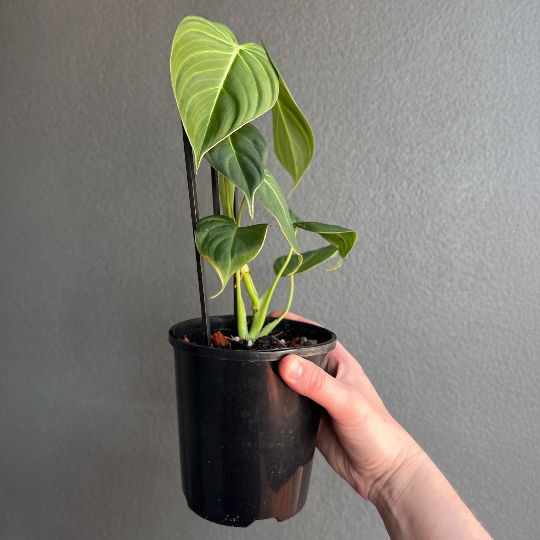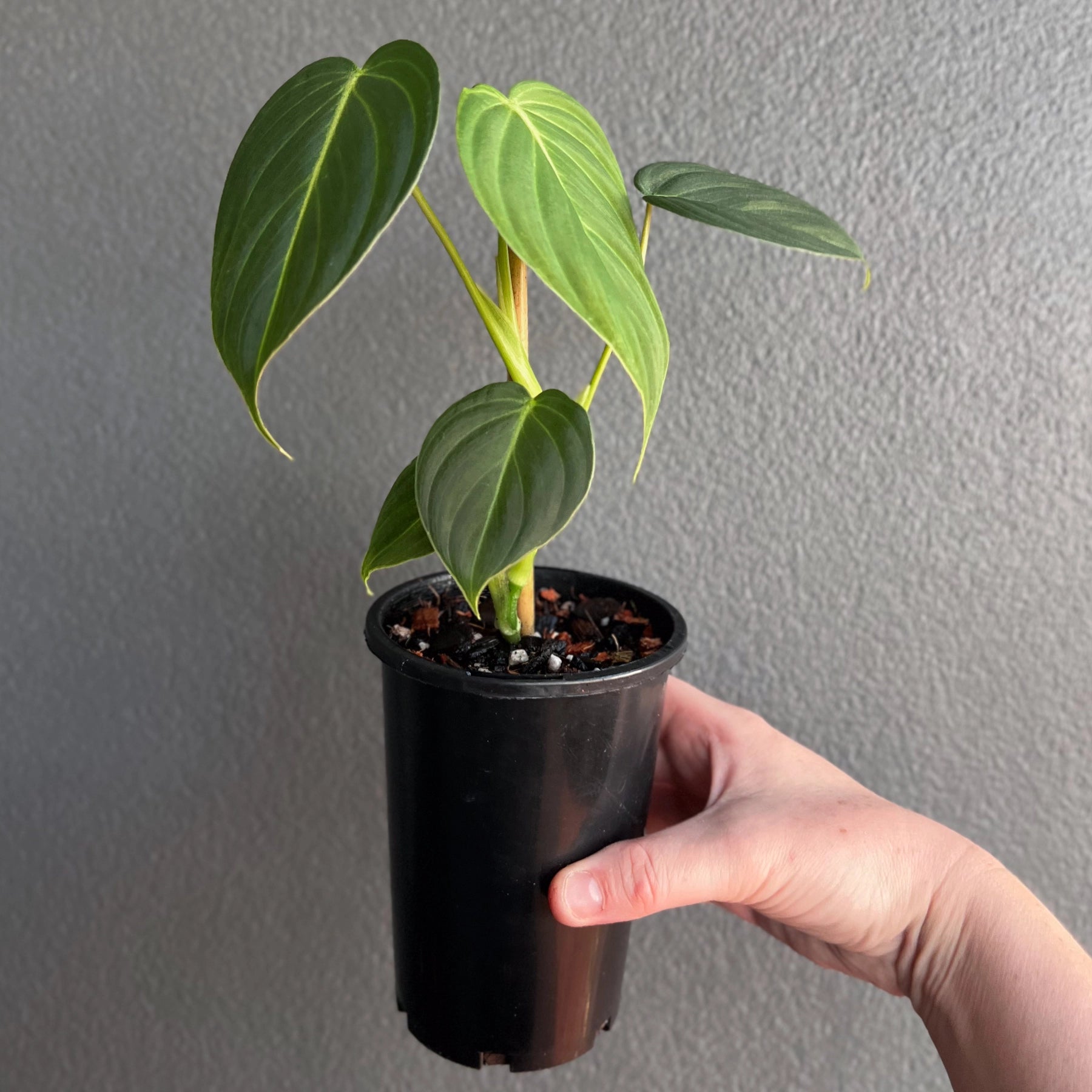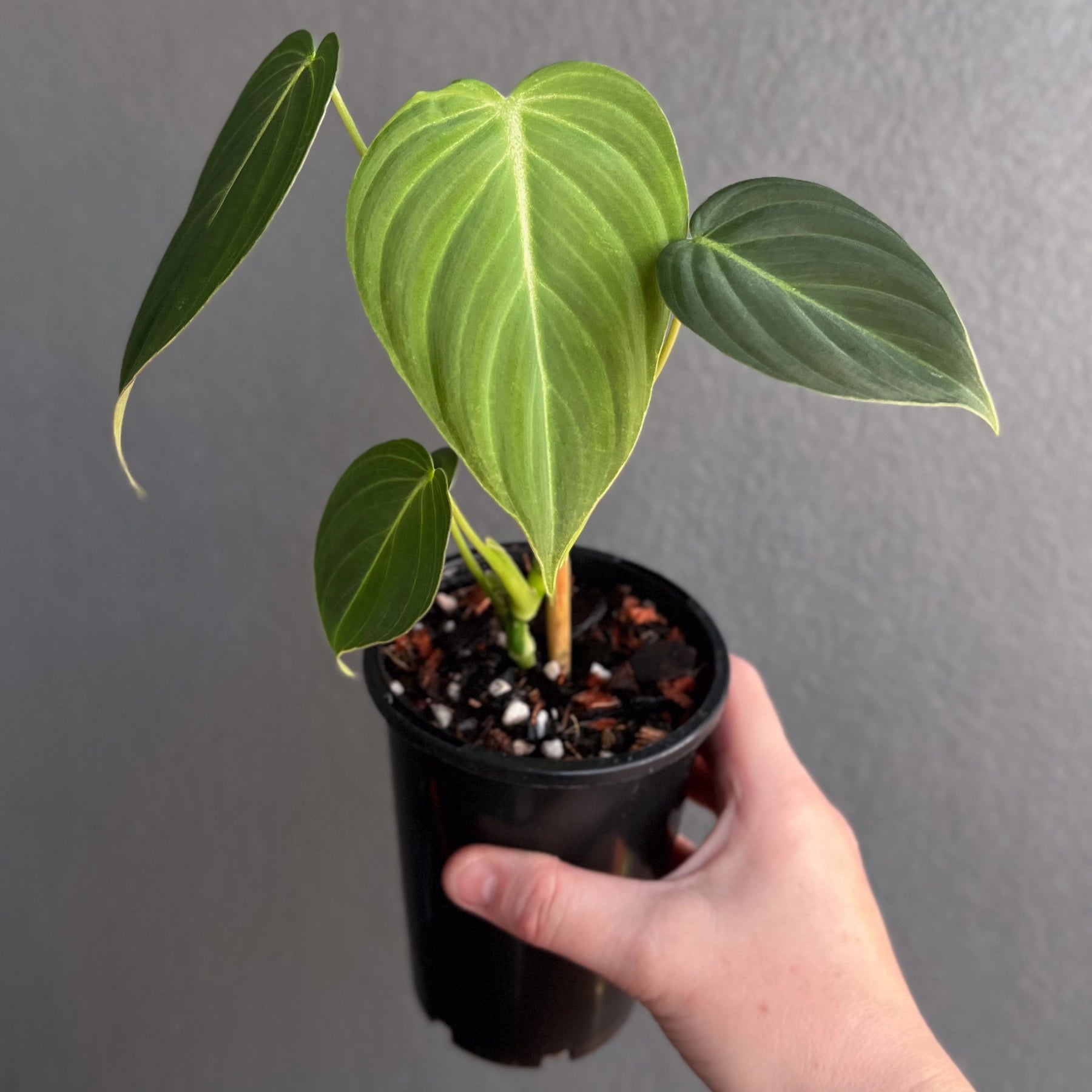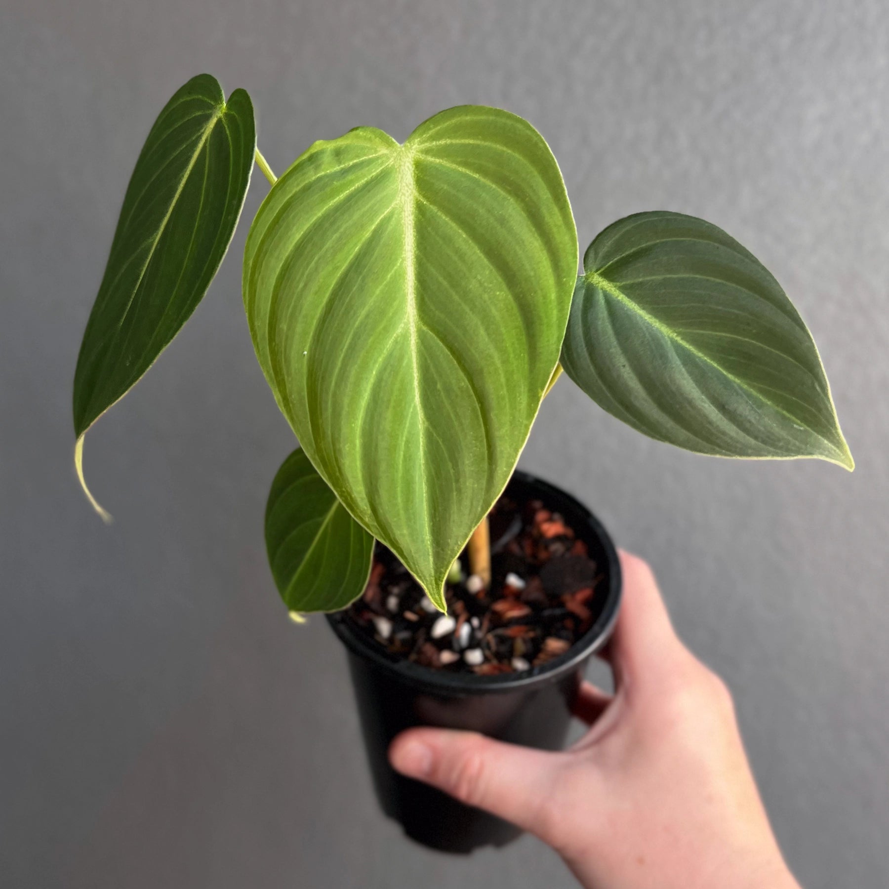 Philodendron 'Glorious', a stunning hybrid of Philodendron gloriosum and Philodendron melanochrysum, combines the best traits of both velvet-leafed varieties. Its leaves feature a velvety texture with soft pink undertones reminiscent of melanochrysum, paired with the larger, faster-growing nature of gloriosum. The foliage is slightly longer and narrower than gloriosum but shorter than melanochrysum, making it a beautiful balance between the two. This versatile plant can climb when given support, such as a moss pole, or crawl depending on the conditions provided, adding adaptability to its charm.