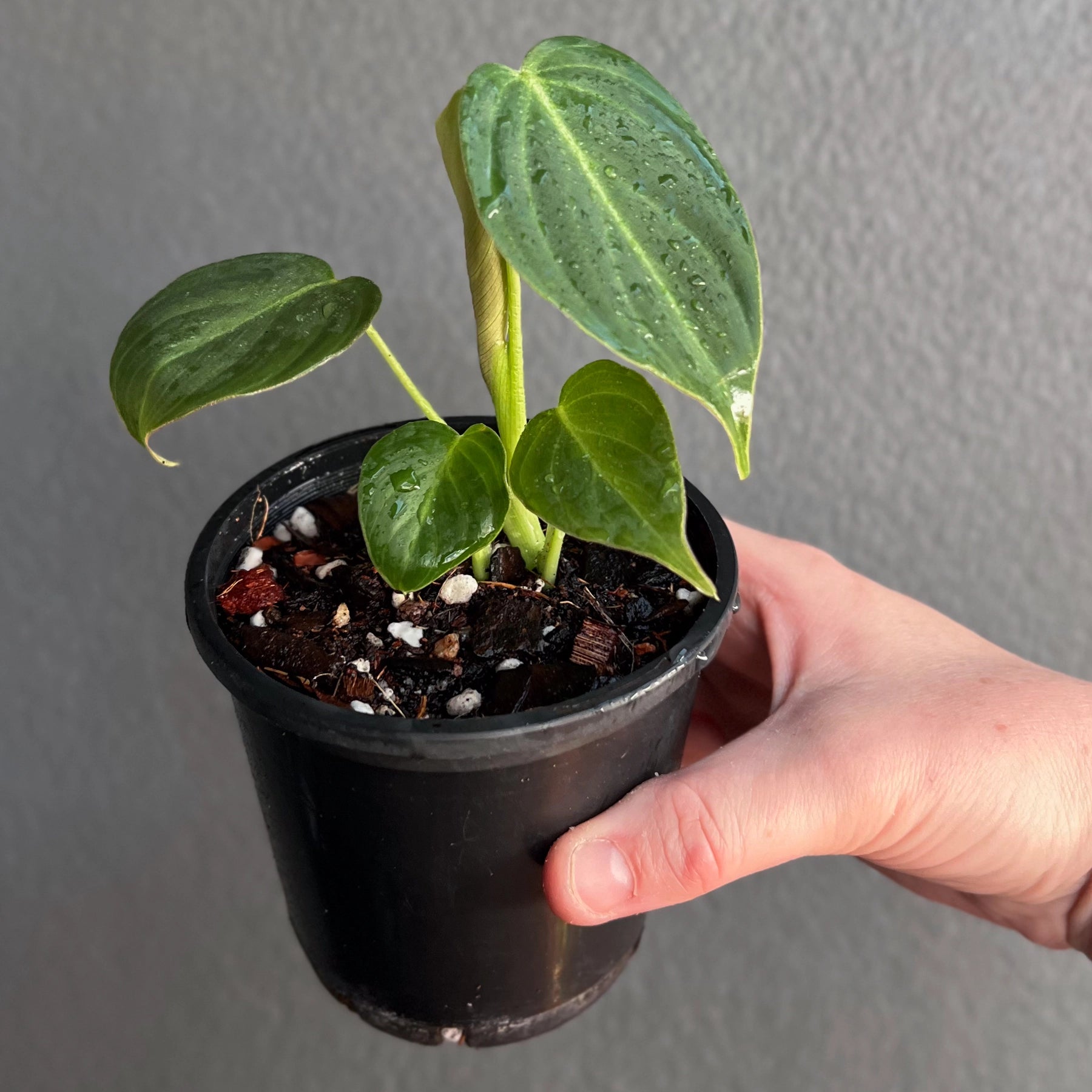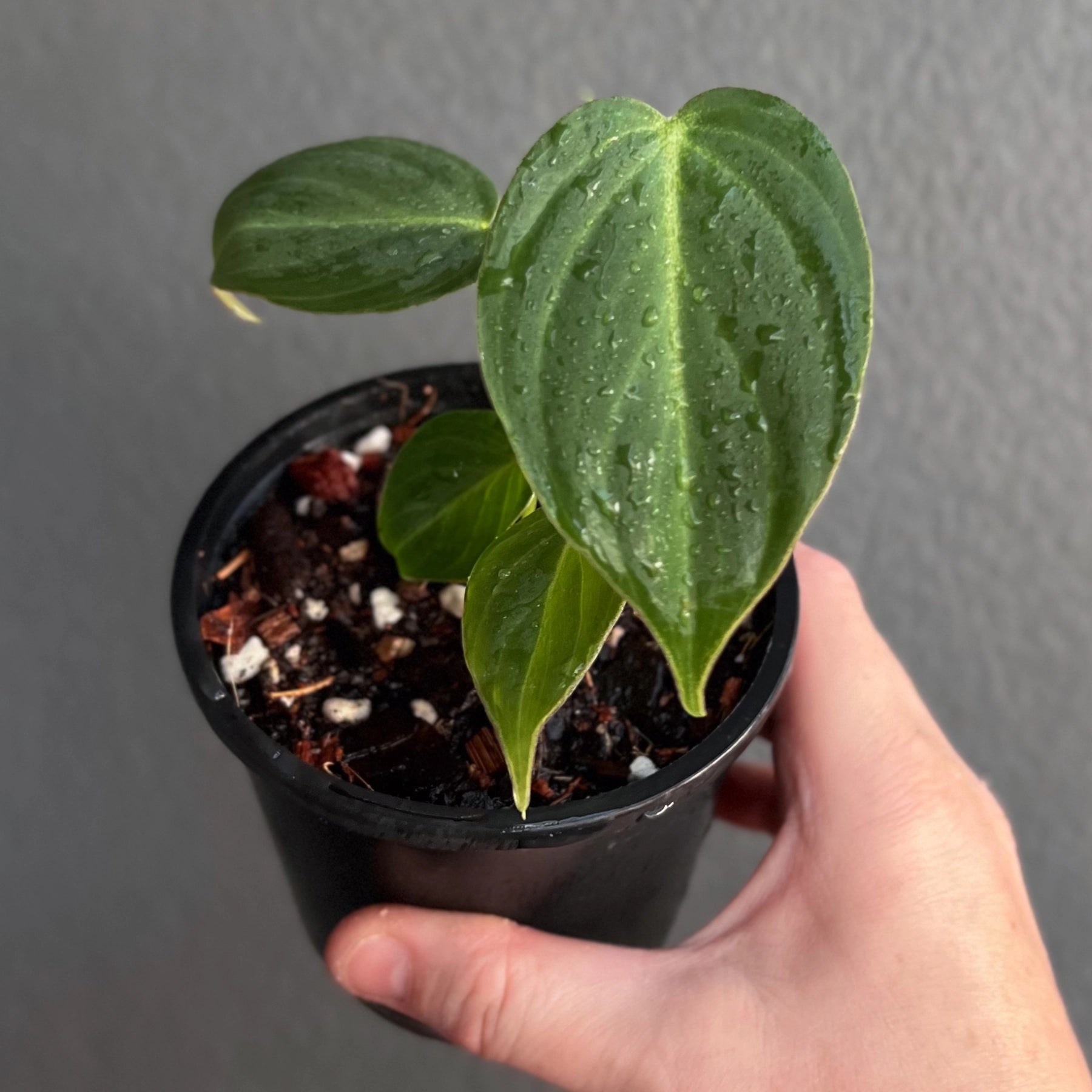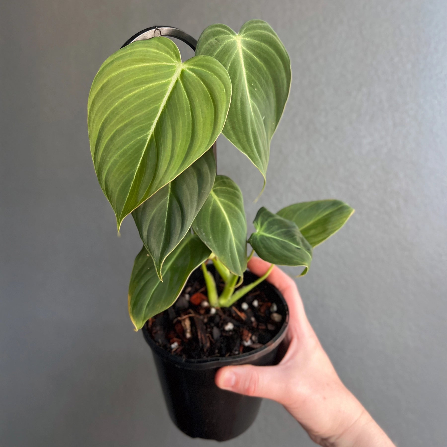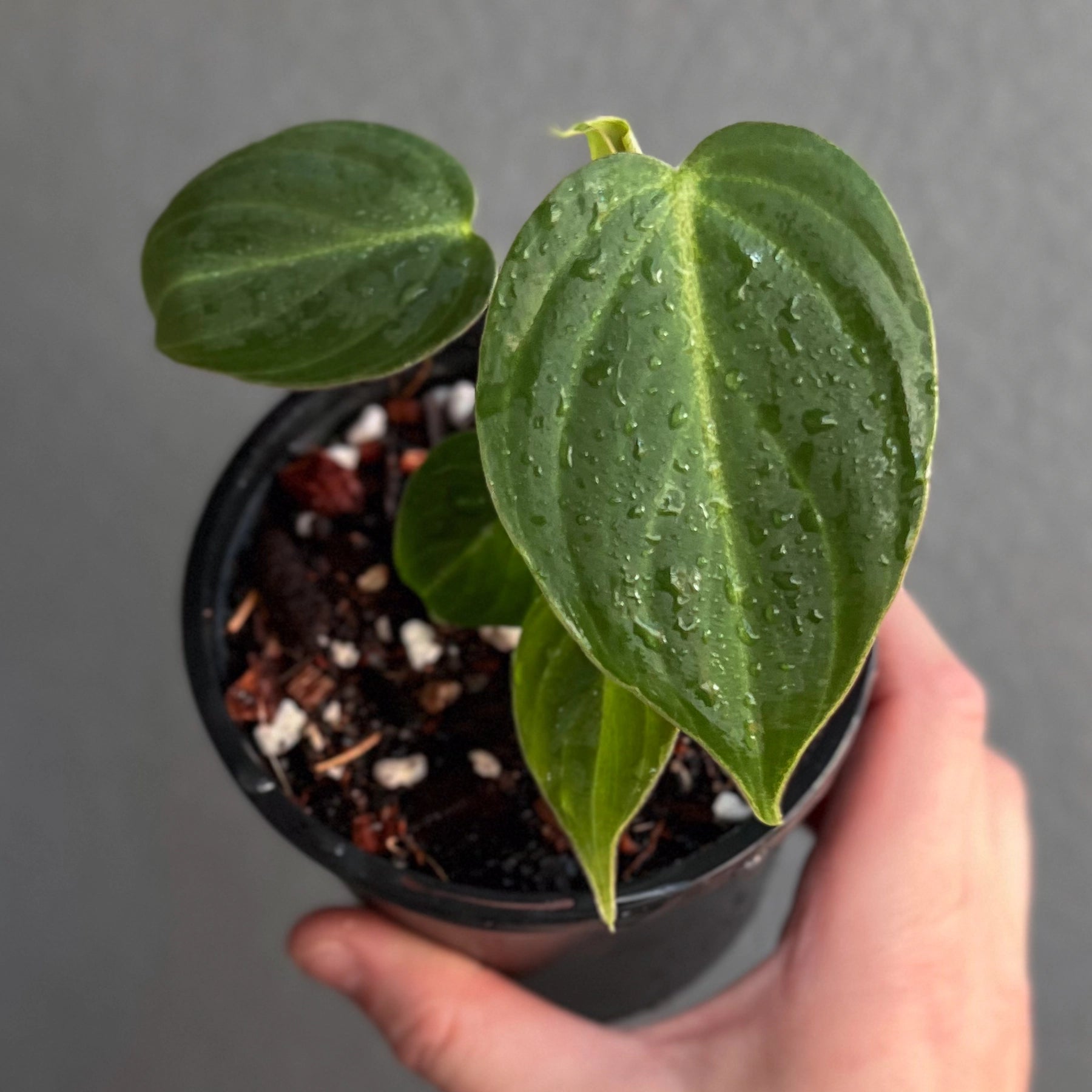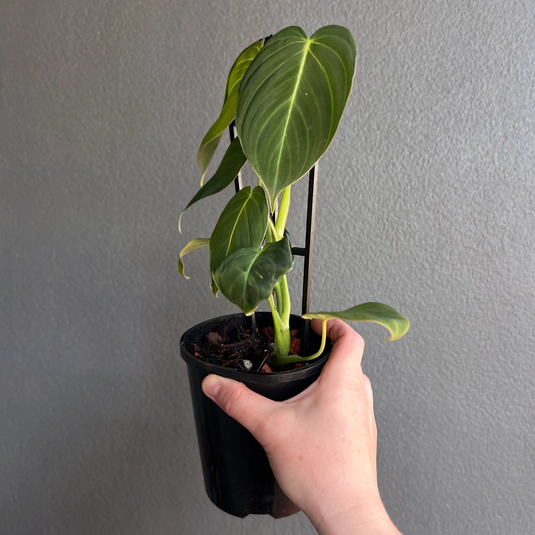 Philodendron 'Glorious', a stunning hybrid of Philodendron gloriosum and Philodendron melanochrysum, combines the best traits of both velvet-leafed varieties. Its leaves feature a velvety texture with soft pink undertones reminiscent of melanochrysum, paired with the larger, faster-growing nature of gloriosum. The foliage is slightly longer and narrower than gloriosum but shorter than melanochrysum, making it a beautiful balance between the two. This versatile plant can climb when given support, such as a moss pole, or crawl depending on the conditions provided, adding adaptability to its charm.