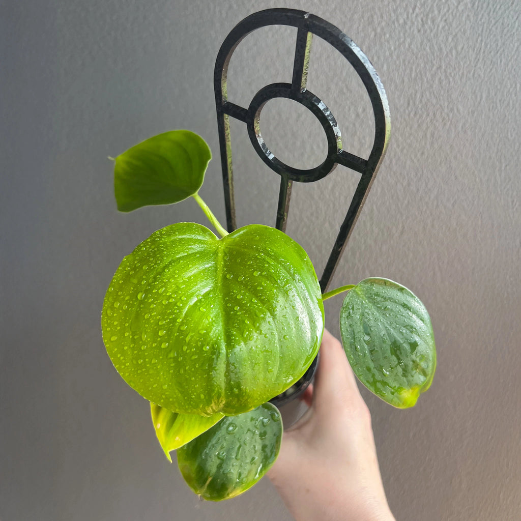 Philodendron hederaceum var. hederaceum is the true green form at the base of the entire hederaceum line. Many of the popular cultivars such as Rio, Cream Splash, Lemon Lime and Micans all trace back to this species. Native to Central and South America, it is a vigorous climber capable of producing much larger leaves in the wild, often reaching 30cm or more. The foliage is thick, glossy and heart-shaped, with a rounder form than hederaceum micans or hederaceum var. grazilielae. Its growth habit is naturally vertical, making it well suited to totems or moss poles where it will climb quickly and reward with lush, green foliage.