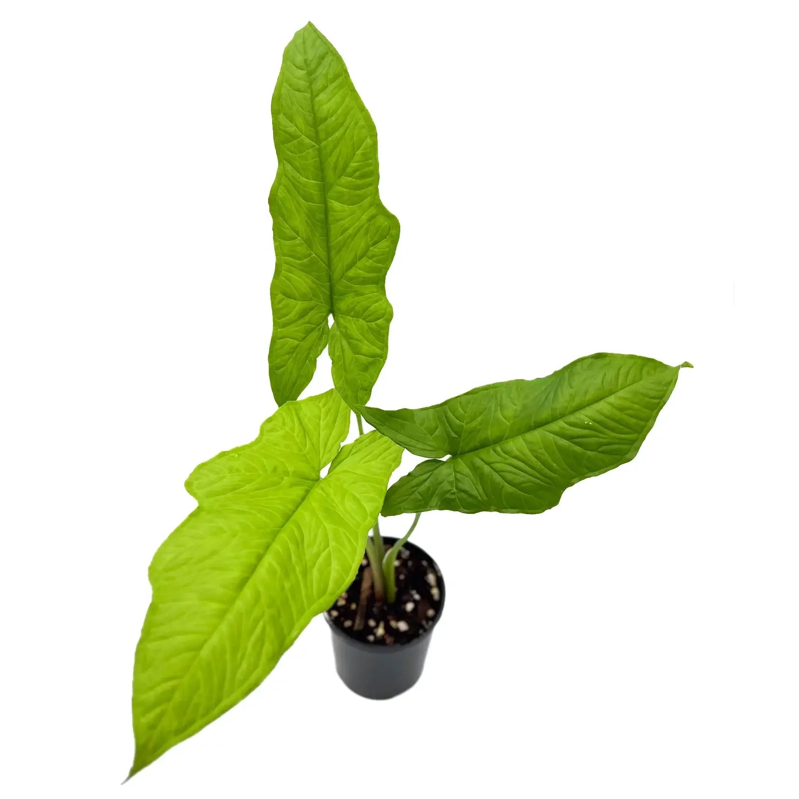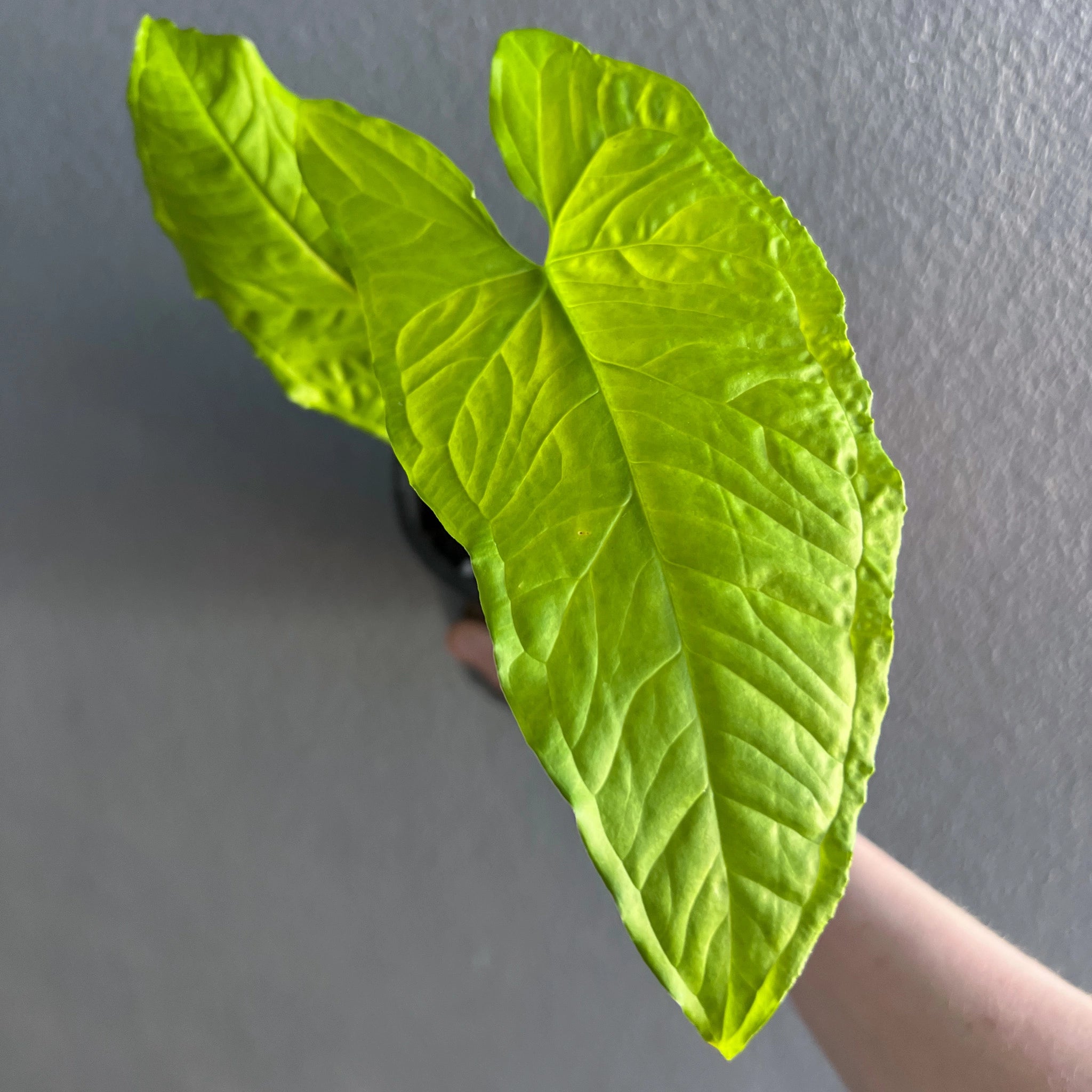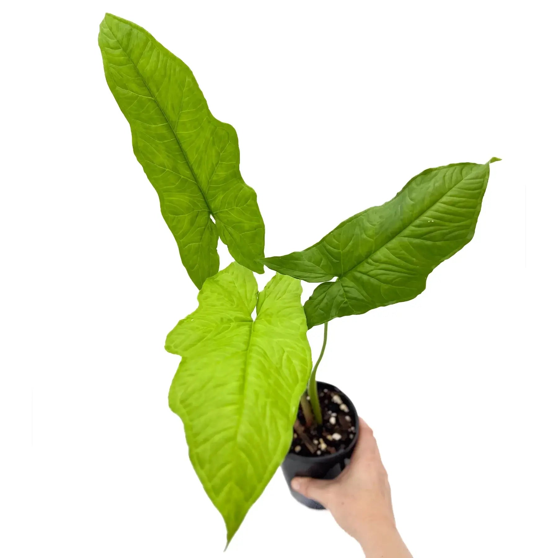 Syngonium steyermarkii has large, arrow-shaped green leaves with a bumpy texture, scalloped edges and prominent veining. The foliage develops deep lobes as it matures, giving it a more segmented appearance. This fast-growing climbing aroid can trail or be supported for vertical growth.