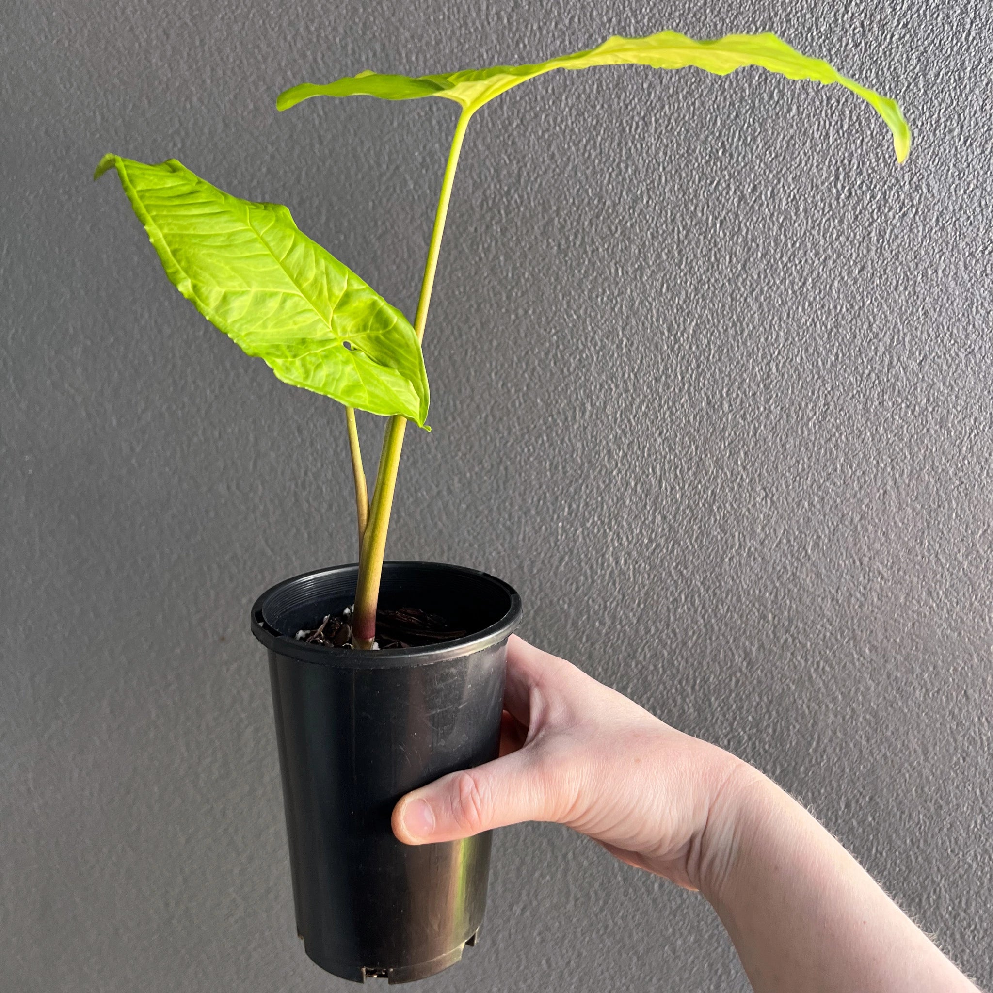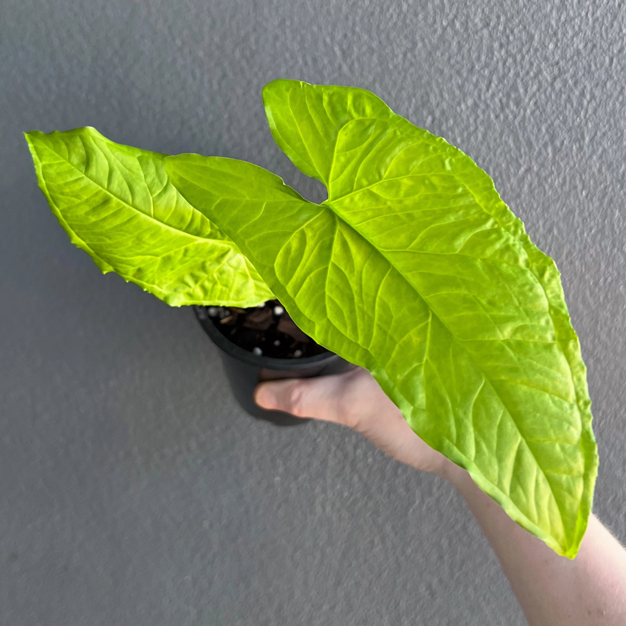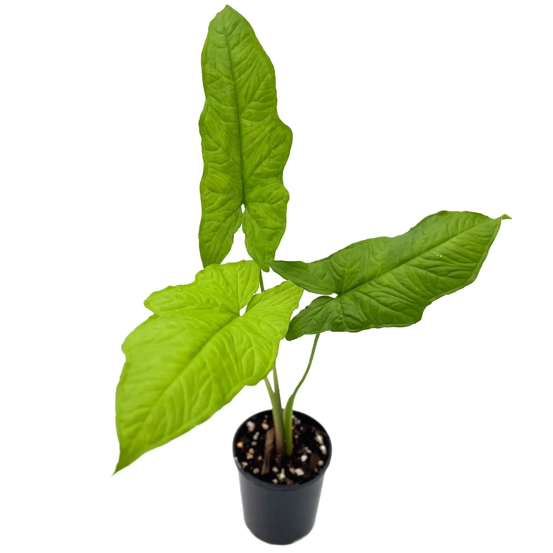 Syngonium steyermarkii has large, arrow-shaped green leaves with a bumpy texture, scalloped edges and prominent veining. The foliage develops deep lobes as it matures, giving it a more segmented appearance. This fast-growing climbing aroid can trail or be supported for vertical growth.