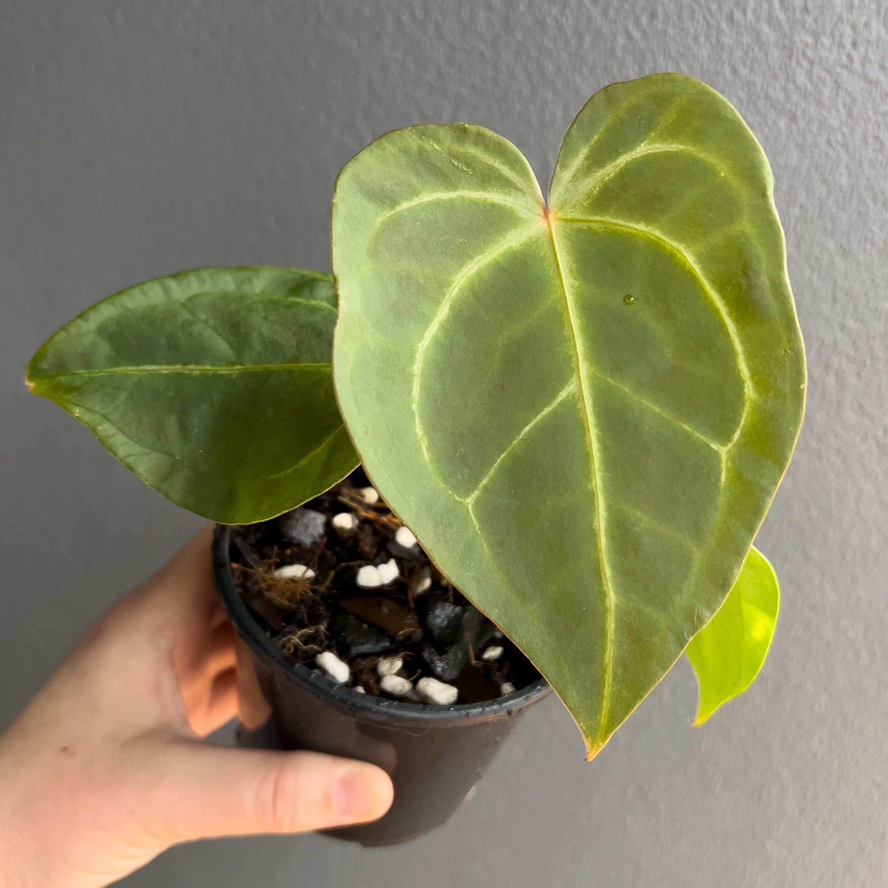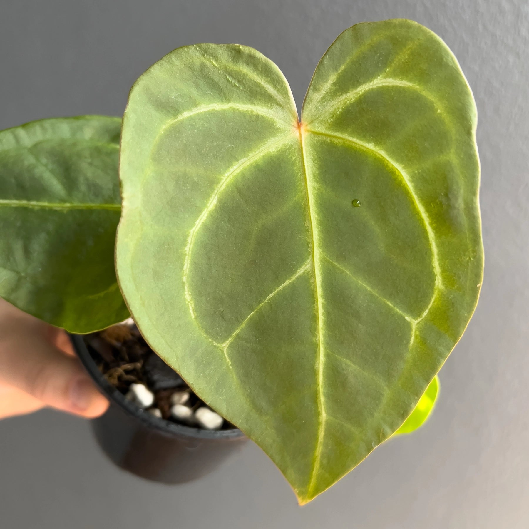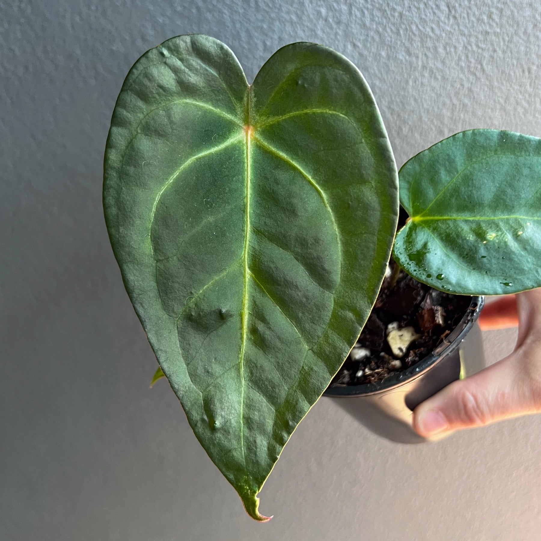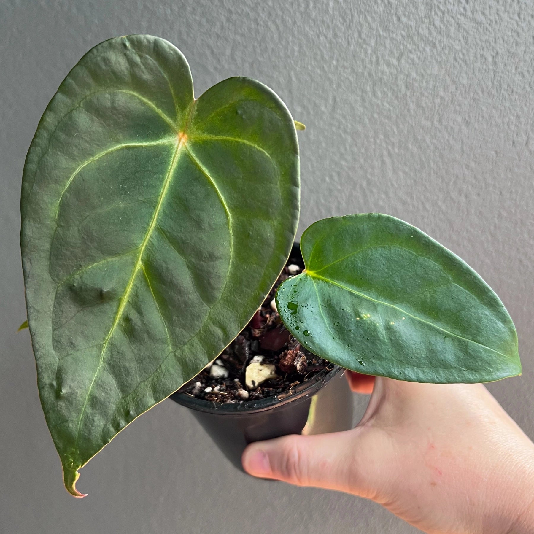 Anthurium papillilaminum x is a seed grown plant with a softer, more sculpted look compared to the heavier velvets. New leaves emerge a deep olive tone and slowly darken as the surface builds a fine suede texture. The shape stays narrow and elegant with a slight curl along the edges that gives it a refined, mature feel. It grows happily in bright filtered light with steady humidity and a loose aroid mix that dries slightly between waterings. The final photo shows the parent plant so you can see the line this seedling comes from and the traits it is likely to carry forward.