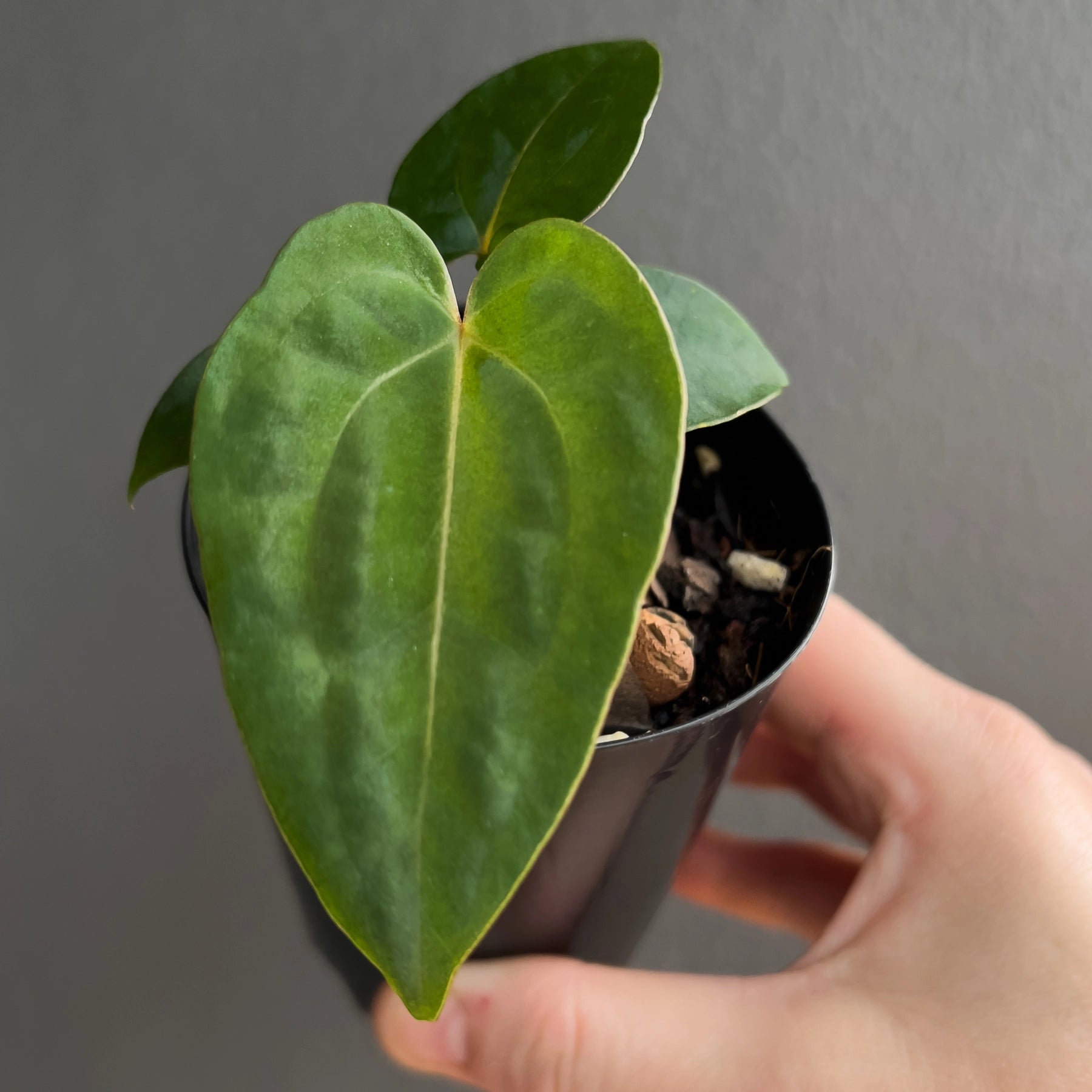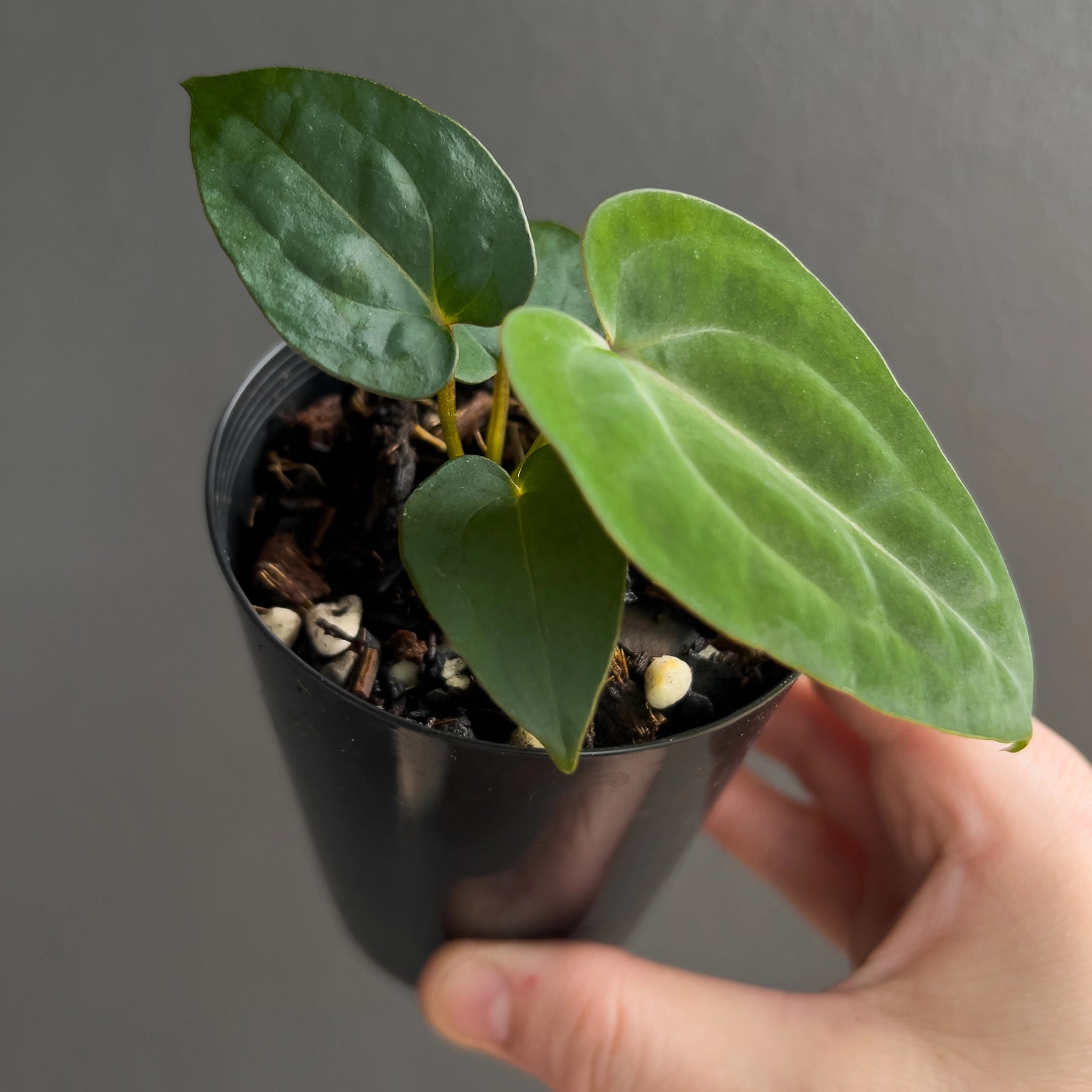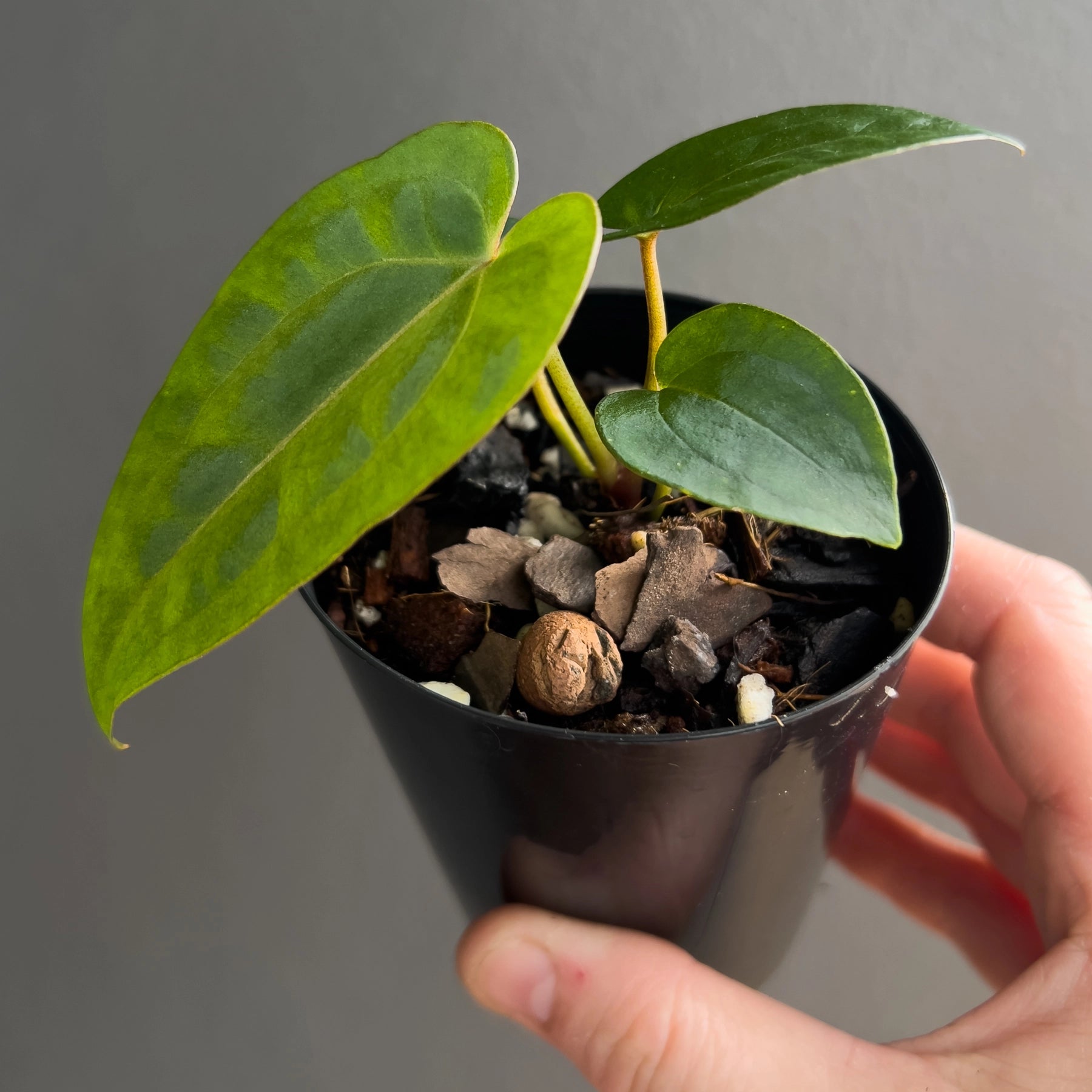 Anthurium ((Zara x Michelle) x pap) x jayda comes from a seed batch created by The Plant Plug as part of a colour genetics experiment. The seed parent carries dark petioles, pink abaxial veining and a big round blade with heavy texture. The pollen parent, known as Jayda, is loved for strong colour in both the abaxial and adaxial veins and a confident growth habit. This cross aims to explore recessive red traits, so each seedling has the potential for interesting vein colour, deeper tones and fuller form. Grown in bright filtered light with steady humidity and a chunky aroid mix, this hybrid suits collectors who enjoy watching character traits reveal themselves as the plant matures.