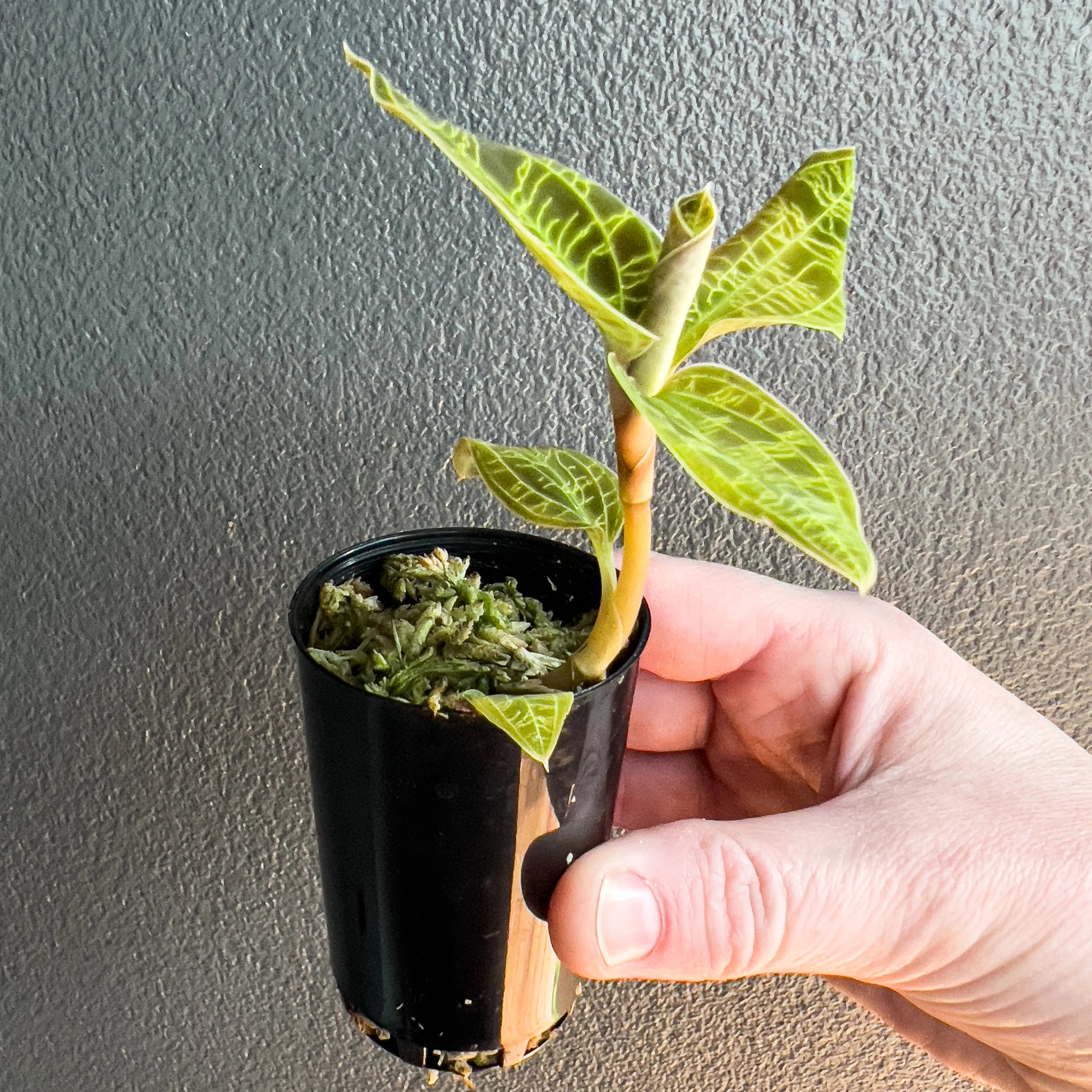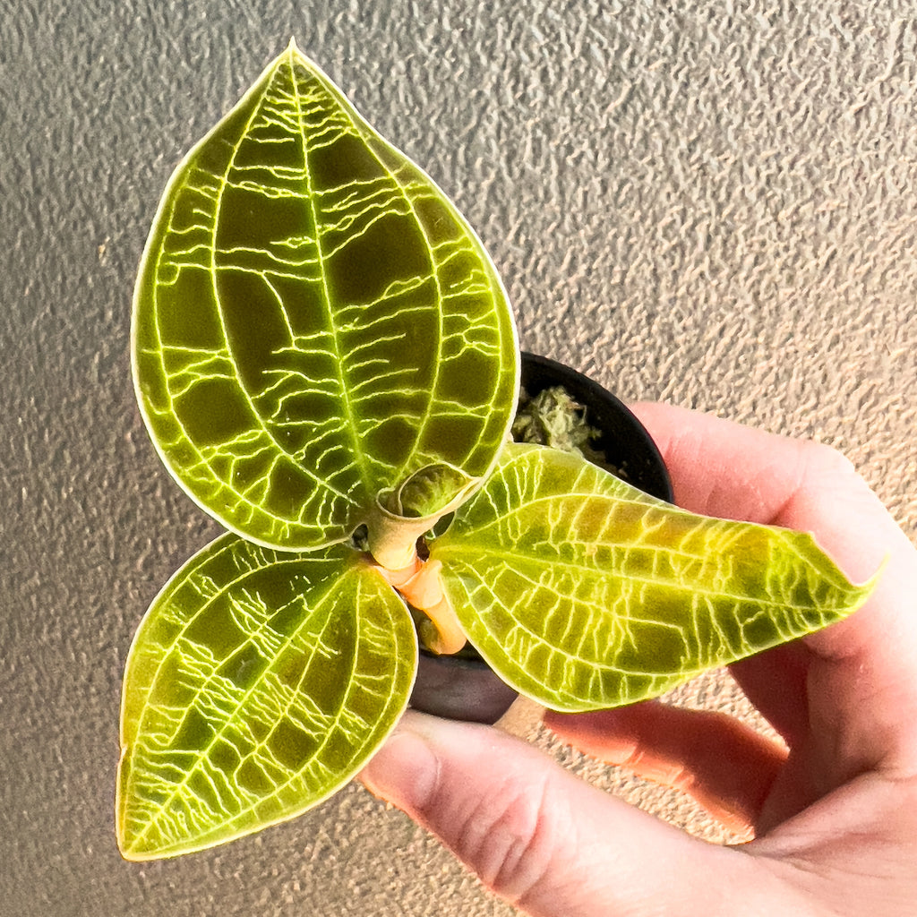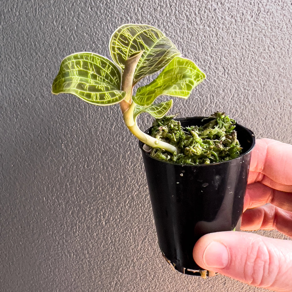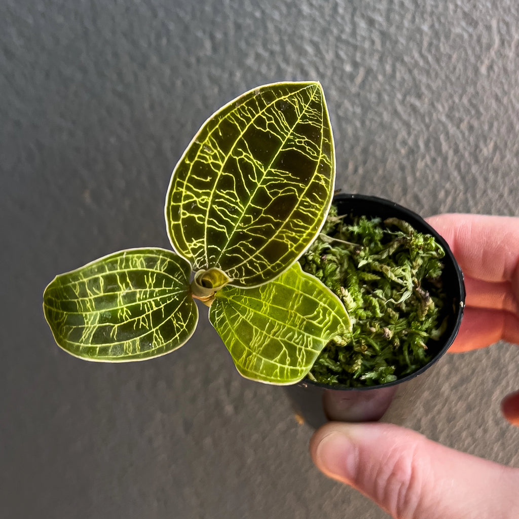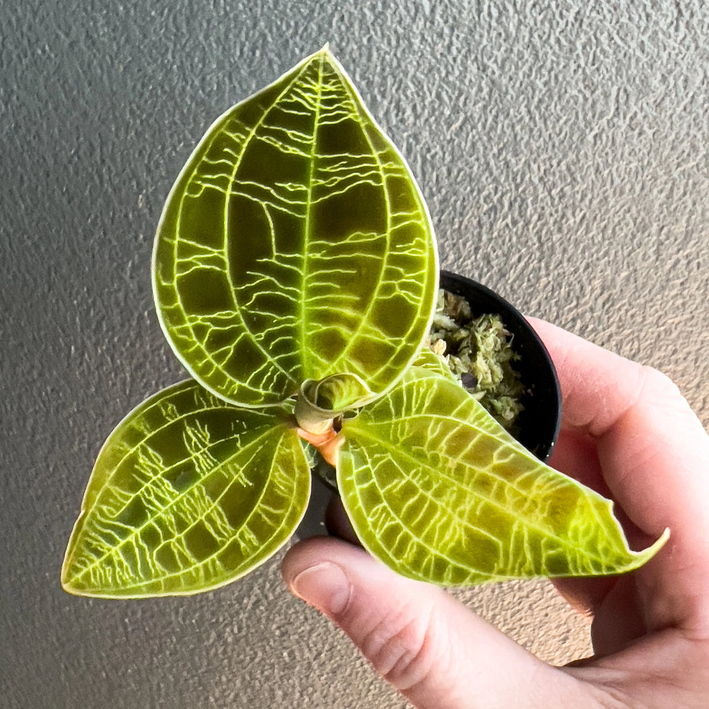 Macodes petola is known for its electric gold veining that looks like lightning running through the leaves. Each leaf has a soft velvet texture and a deep olive-green base that glows when light hits from the side. It stays compact and low, forming a small rosette that slowly spreads with new growth. The leaves are delicate but sturdy when kept in steady humidity, and they shimmer under cabinet or terrarium lighting. A true jewel orchid prized for its foliage rather than its blooms, perfect for anyone who loves fine details and collector plants. Growing happily and thriving in live sphagnum moss.