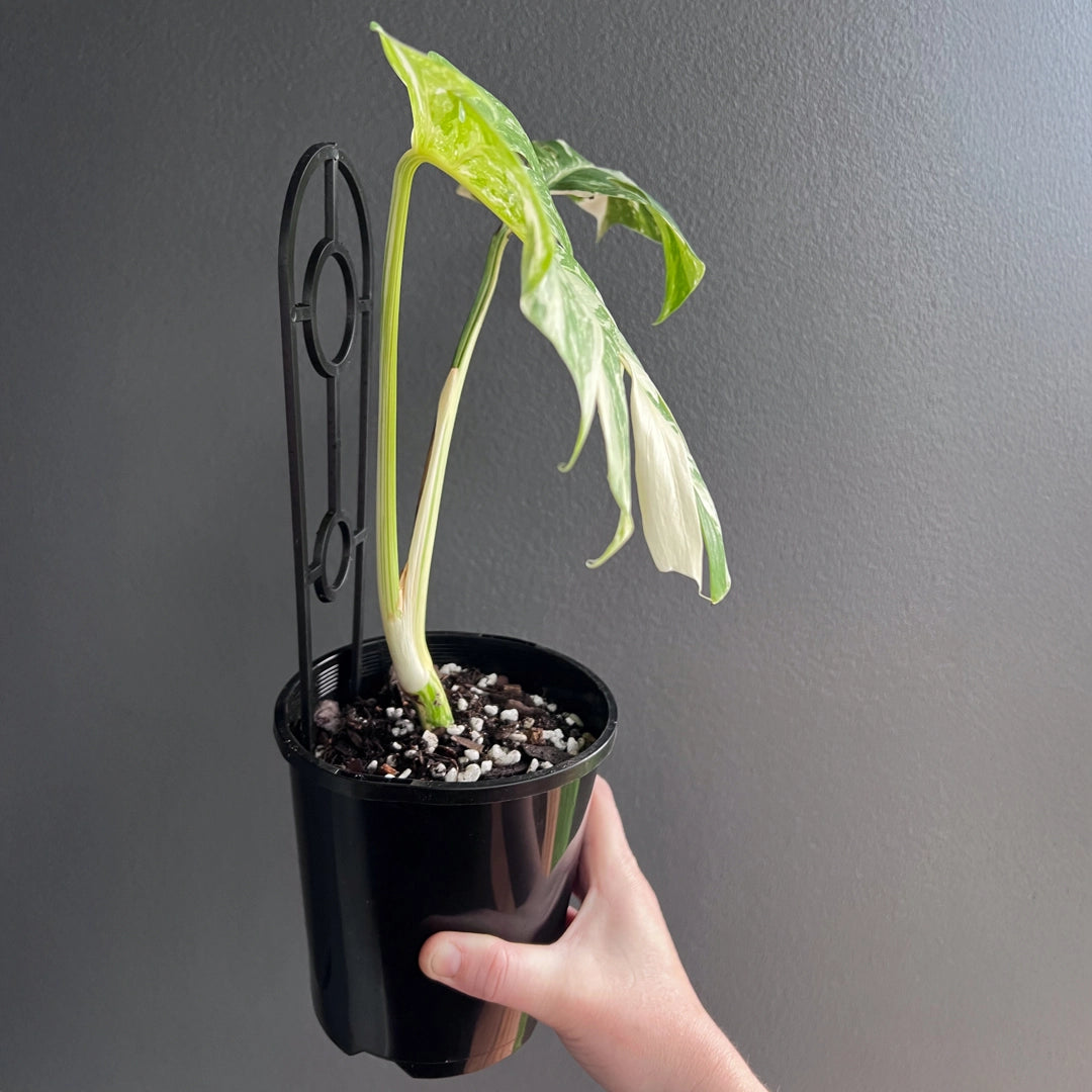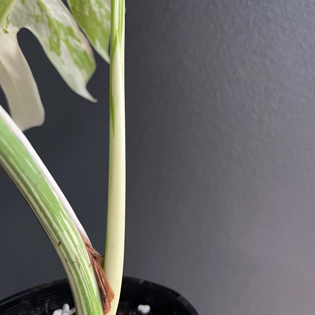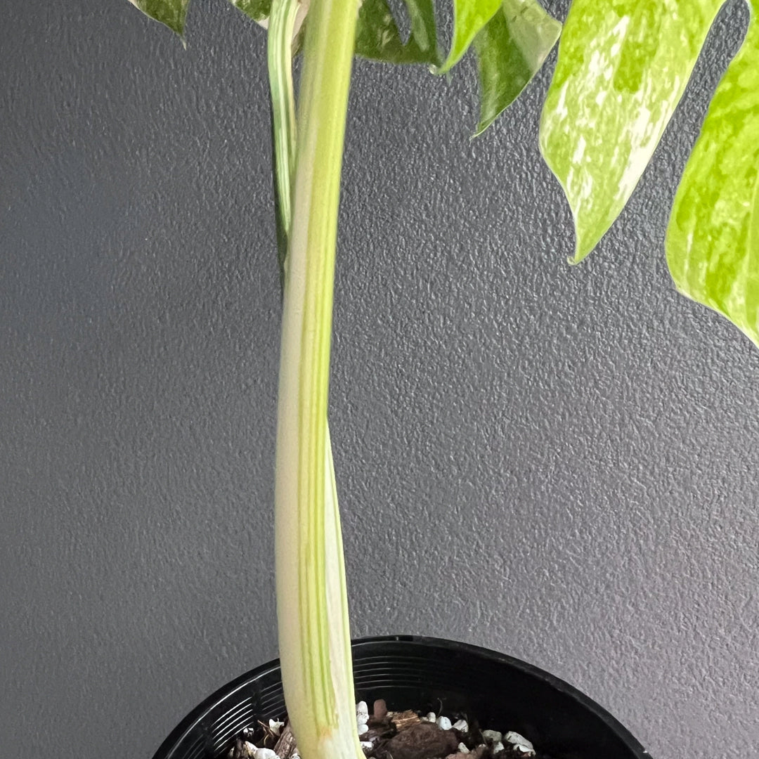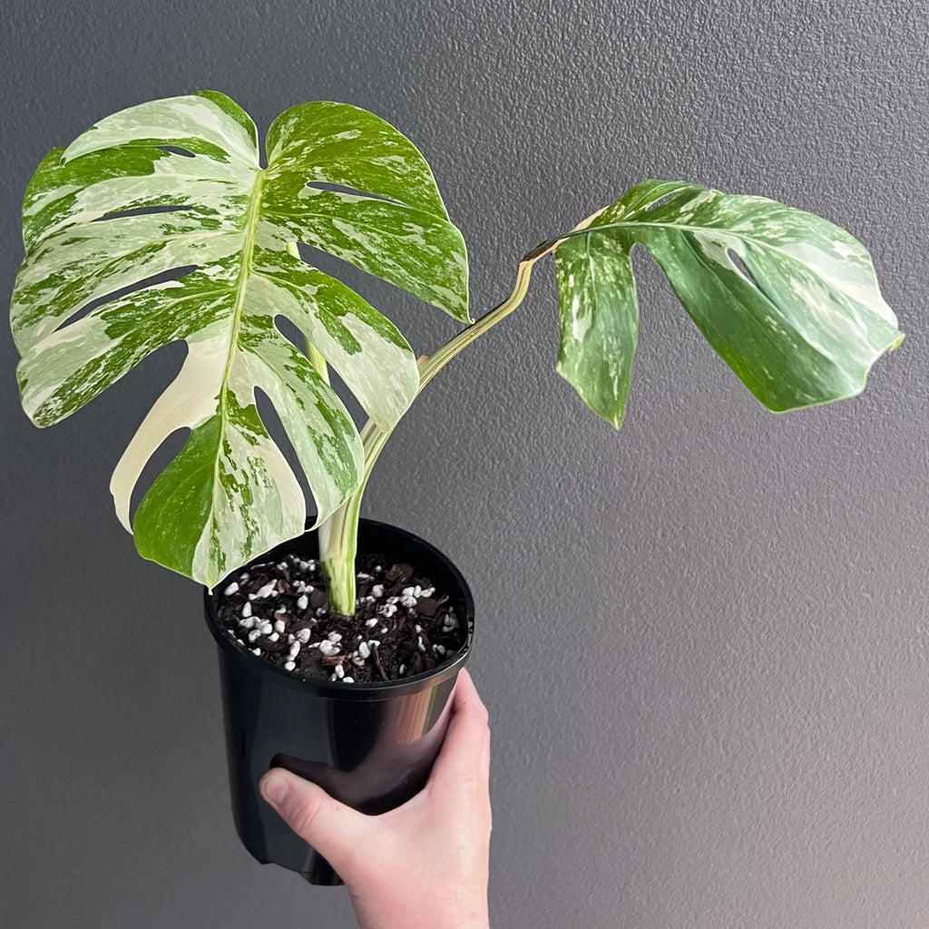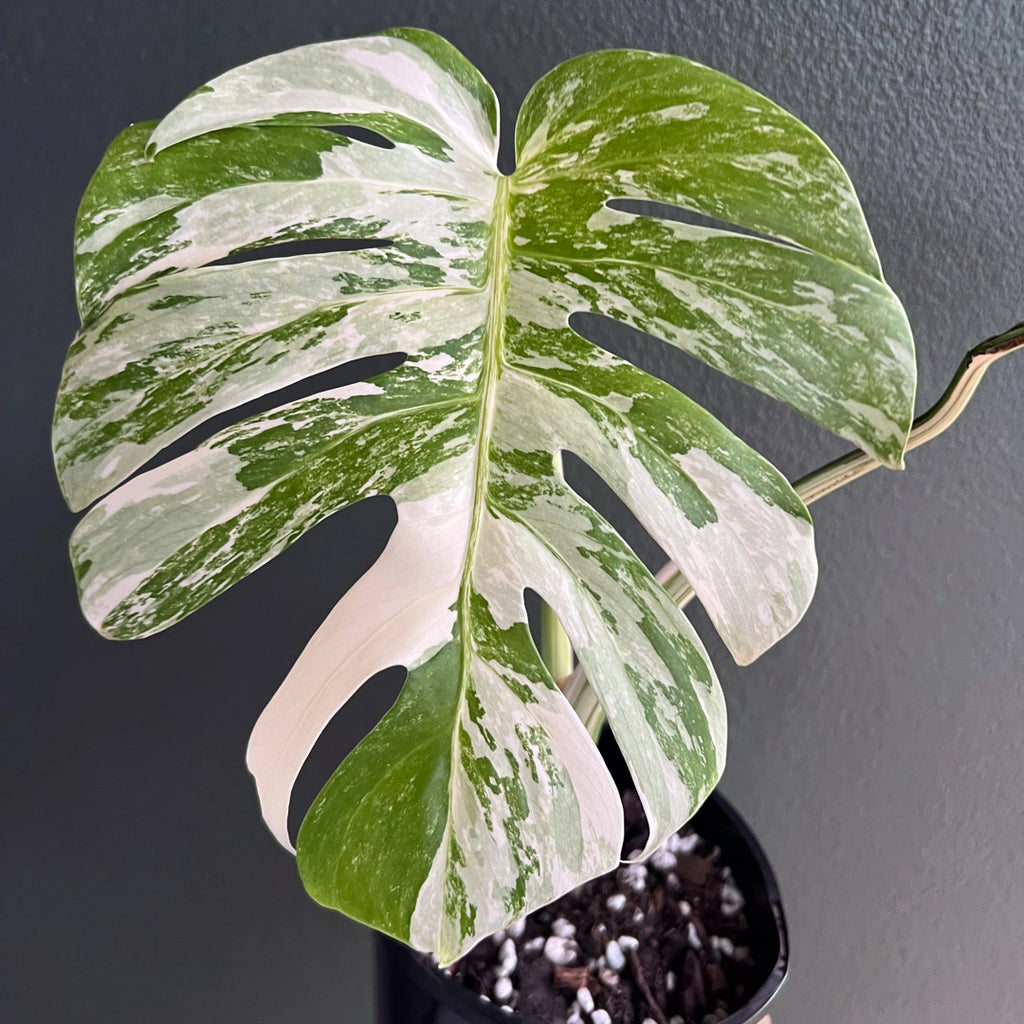 These Monstera deliciosa Borsigiana Albo are from the enliven Platinum Collection. The Monstera deliciosa Borsigiana Albo has variegated green and white leaves, which are either splashes or blocked areas of white on the green leaves. Much like its close relative, the Monstera Deliciosa, the leaves of Monstera deliciosa Borsigiana Albo fenestrate as the plant matures. They thrive in bright, indirect light, a higher humidity of around 70%, a warm environment over 18deg, and evenly moist soil. The variegation in Monstera deliciosa Borsigiana Albo is caused by a genetic mutation that affects chlorophyll production. The result is those beautiful white or pale green variegated areas on the leaves.