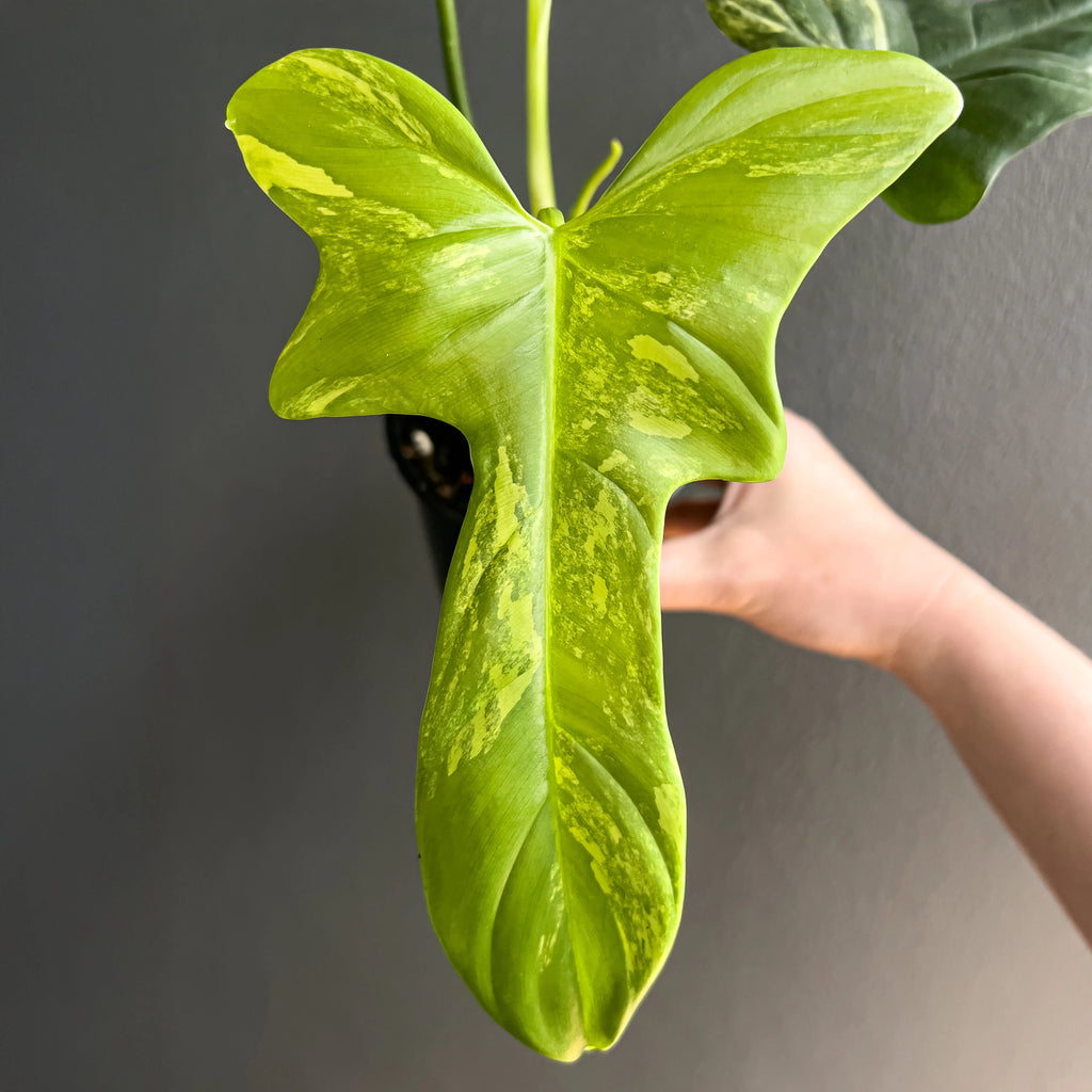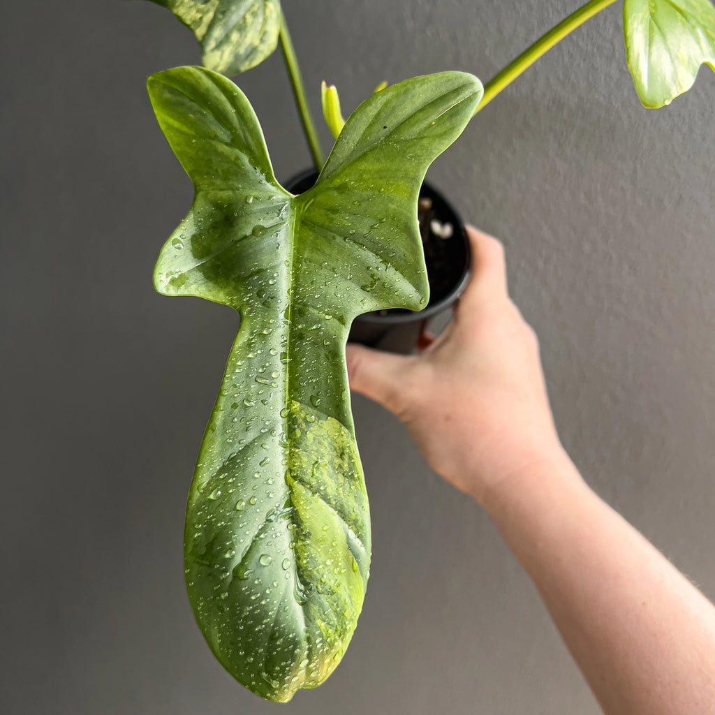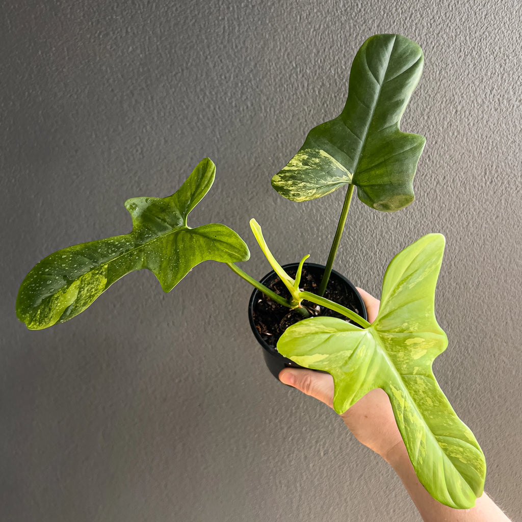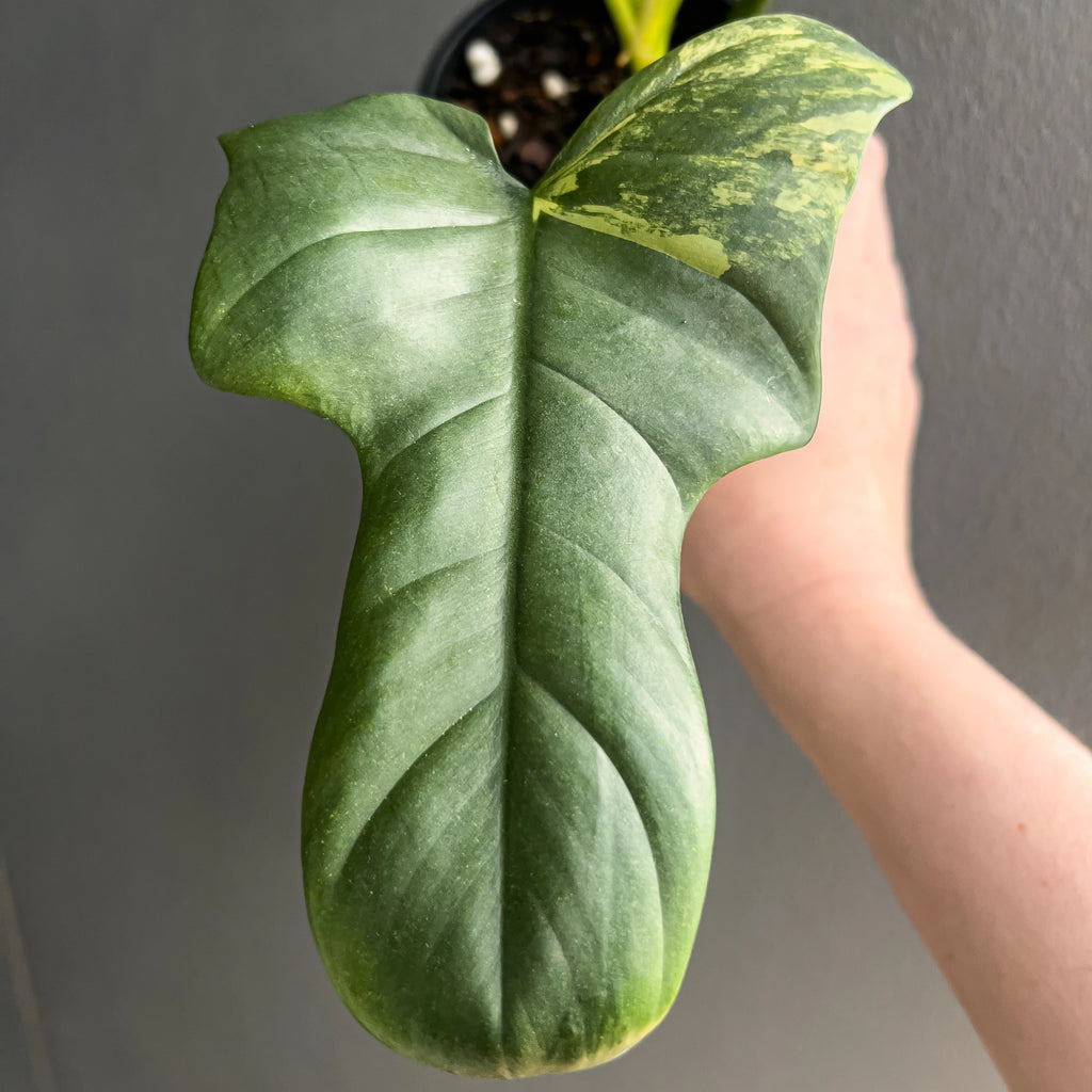 The Philodendron bipennifolium variegated is a true collector’s piece, with its distinctive horsehead-shaped leaves and stunning cream, mint, and green marbling. No two leaves are alike, with each new leaf bringing fresh variation and surprise. This climber thrives in bright, indirect light and benefits from support as it matures. Known for its impressive leaf shape and variegation pattern, this variety is highly sought after and performs best with consistent warmth and humidity. A rewarding plant that adds dramatic interest to any rare aroid collection.
