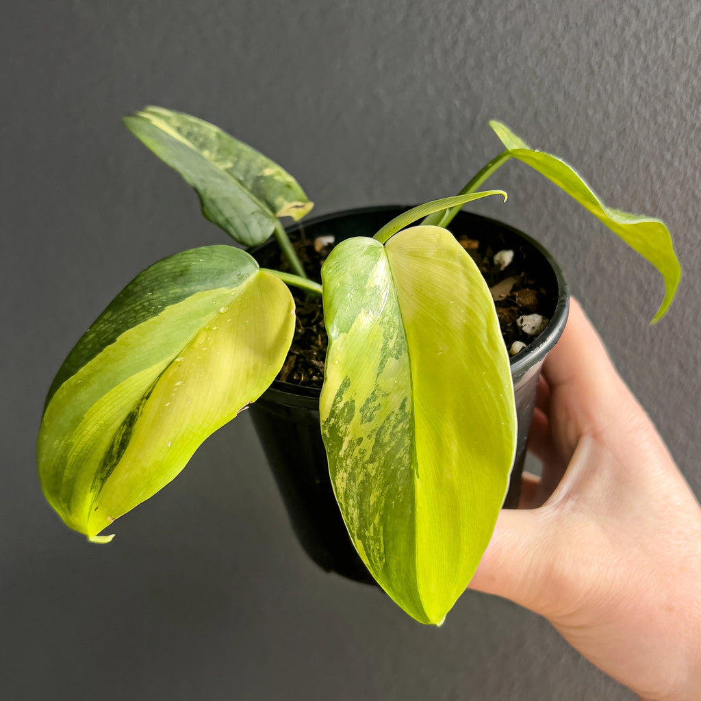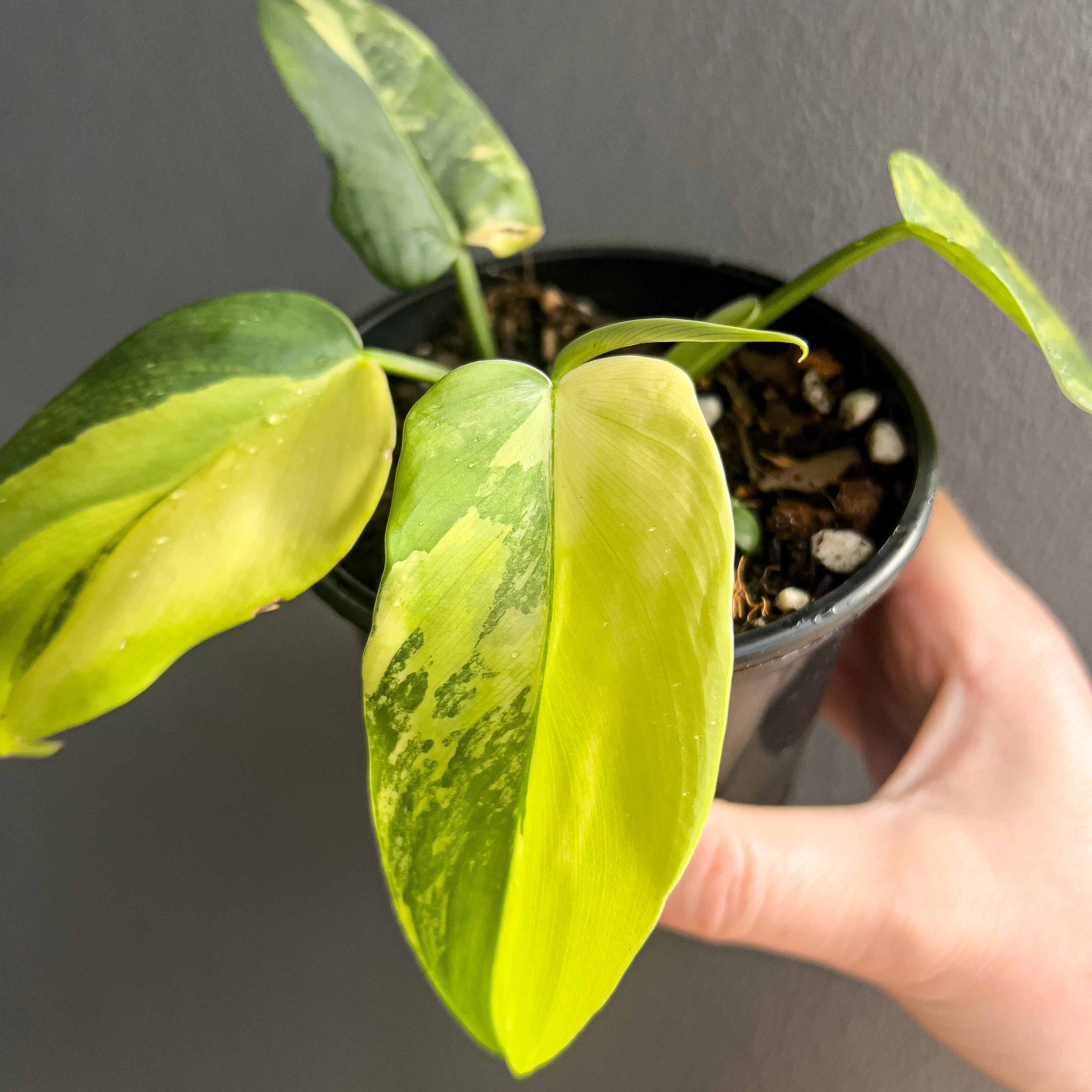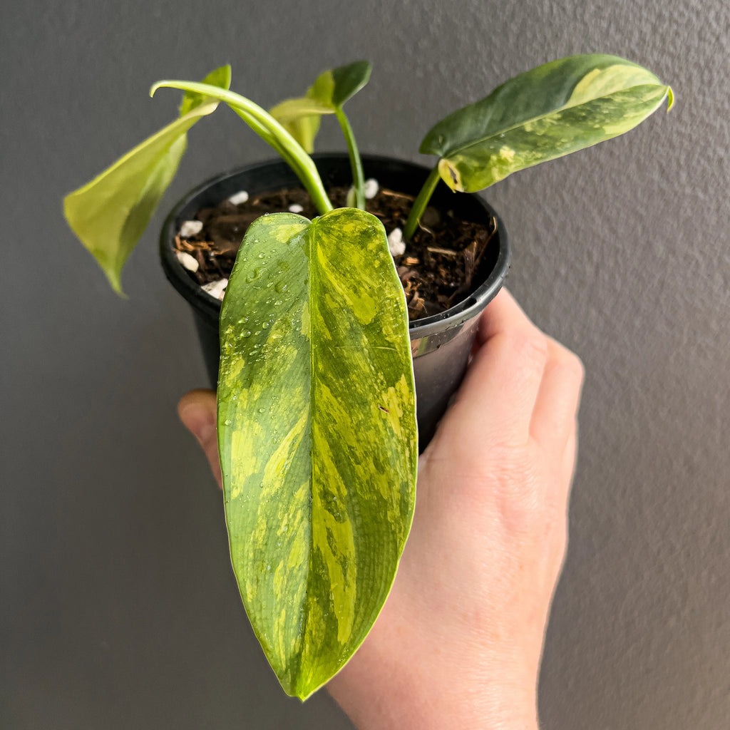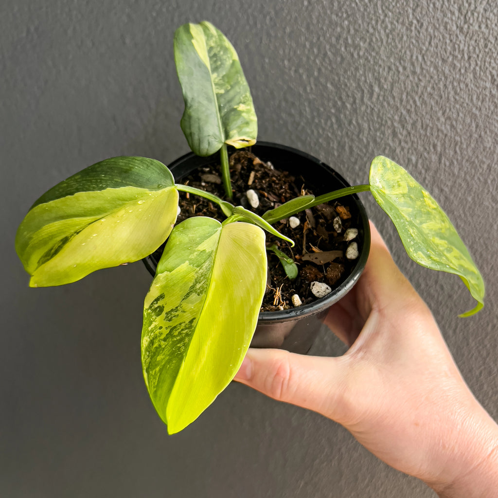The Philodendron bipennifolium variegated is a true collector’s piece, with its distinctive horsehead-shaped leaves and stunning cream, mint, and green marbling. No two leaves are alike, with each new leaf bringing fresh variation and surprise. This climber thrives in bright, indirect light and benefits from support as it matures. Known for its impressive leaf shape and variegation pattern, this variety is highly sought after and performs best with consistent warmth and humidity. A rewarding plant that adds dramatic interest to any rare aroid collection.