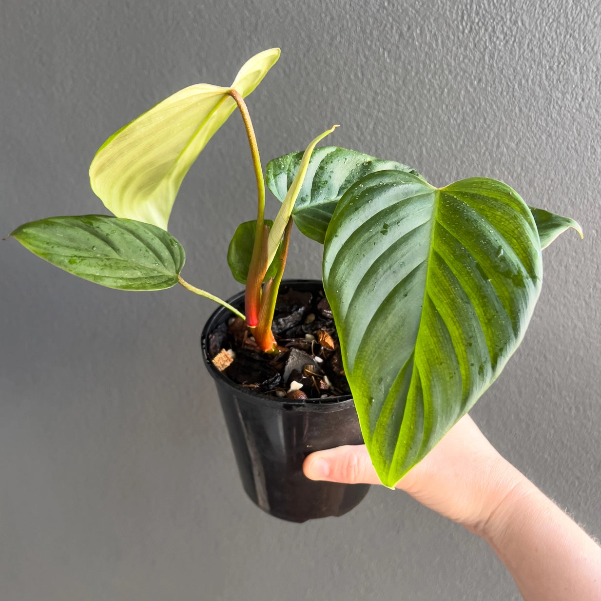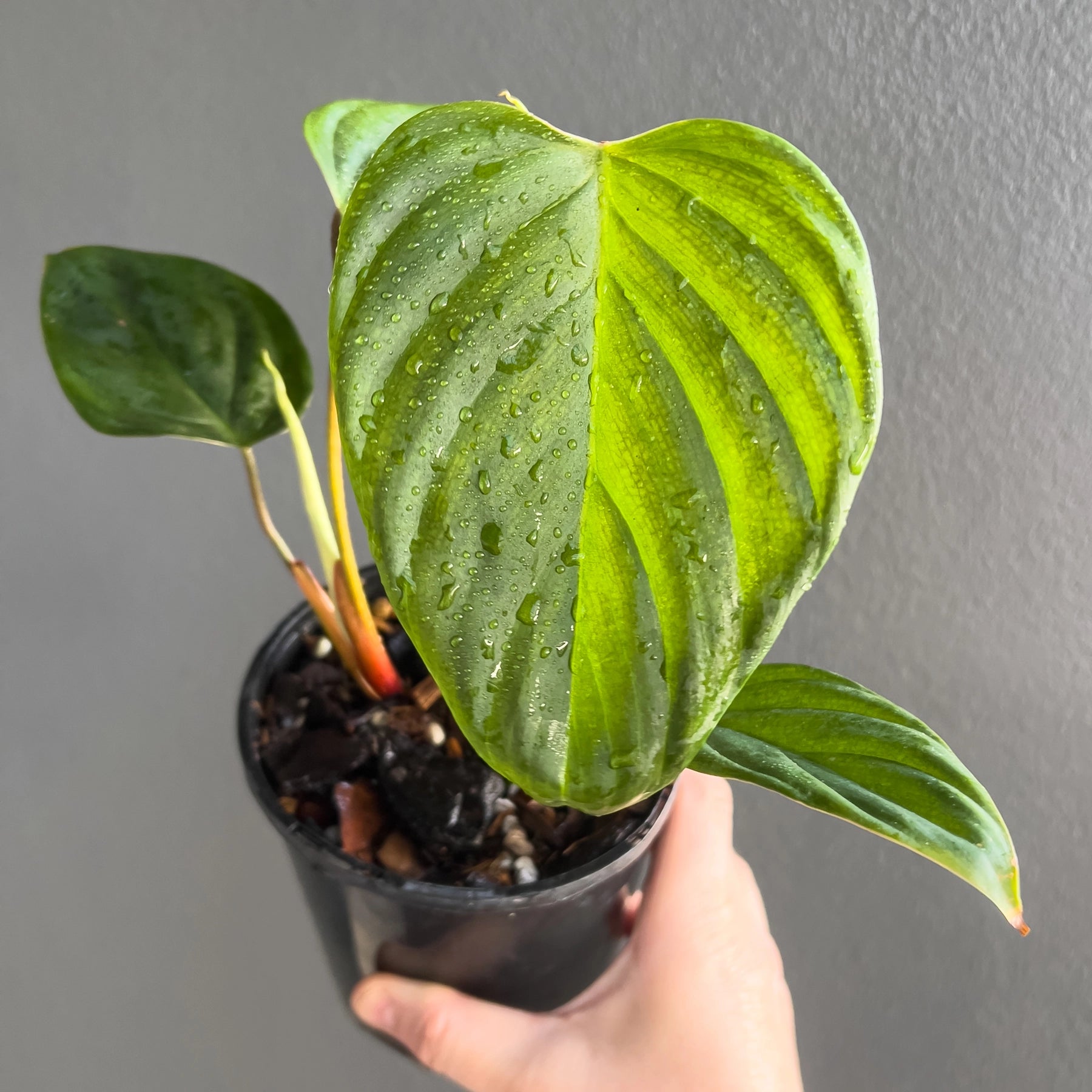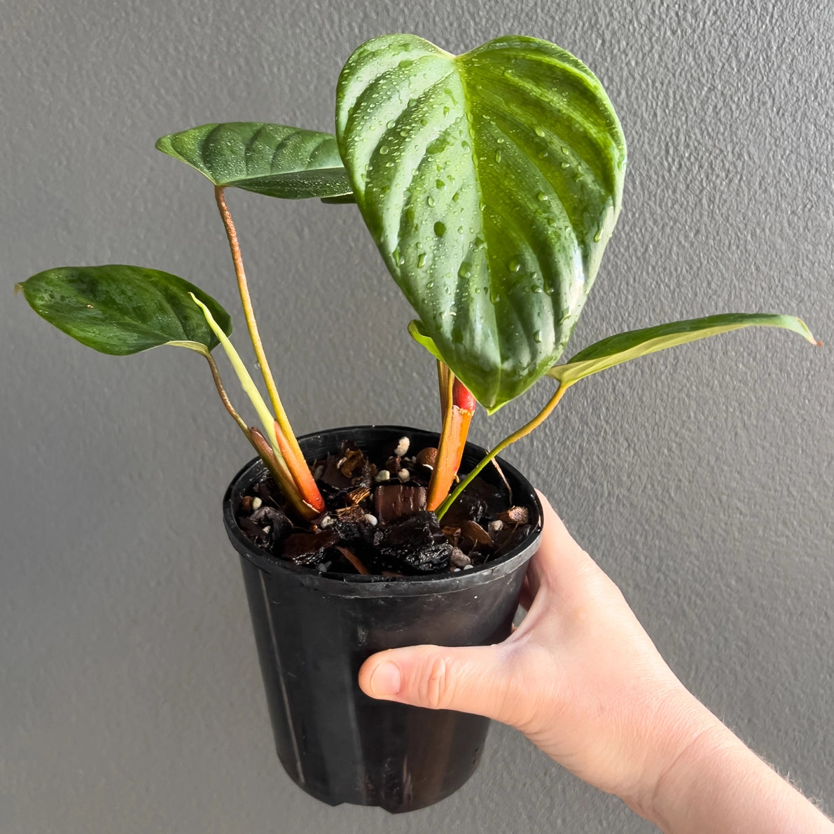 Philodendron nangaritense, commonly known as Philodendron Fuzzy Petiole, is a unique terrestrial species prized for its striking, bright green, heart-shaped leaves and distinctive fuzzy petioles. The new leaves emerge with a pinkish hue before hardening off to a vibrant green. The petioles are covered in soft, reddish fuzz, giving the plant a textured, almost velvety appearance.