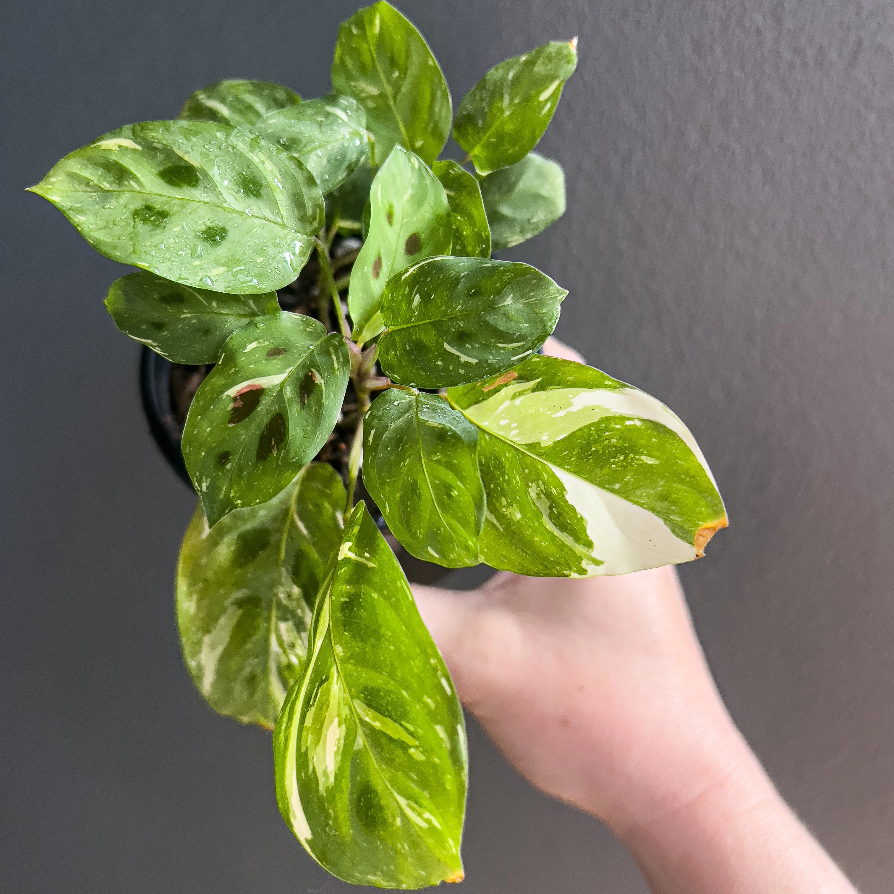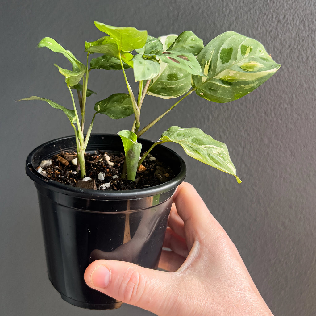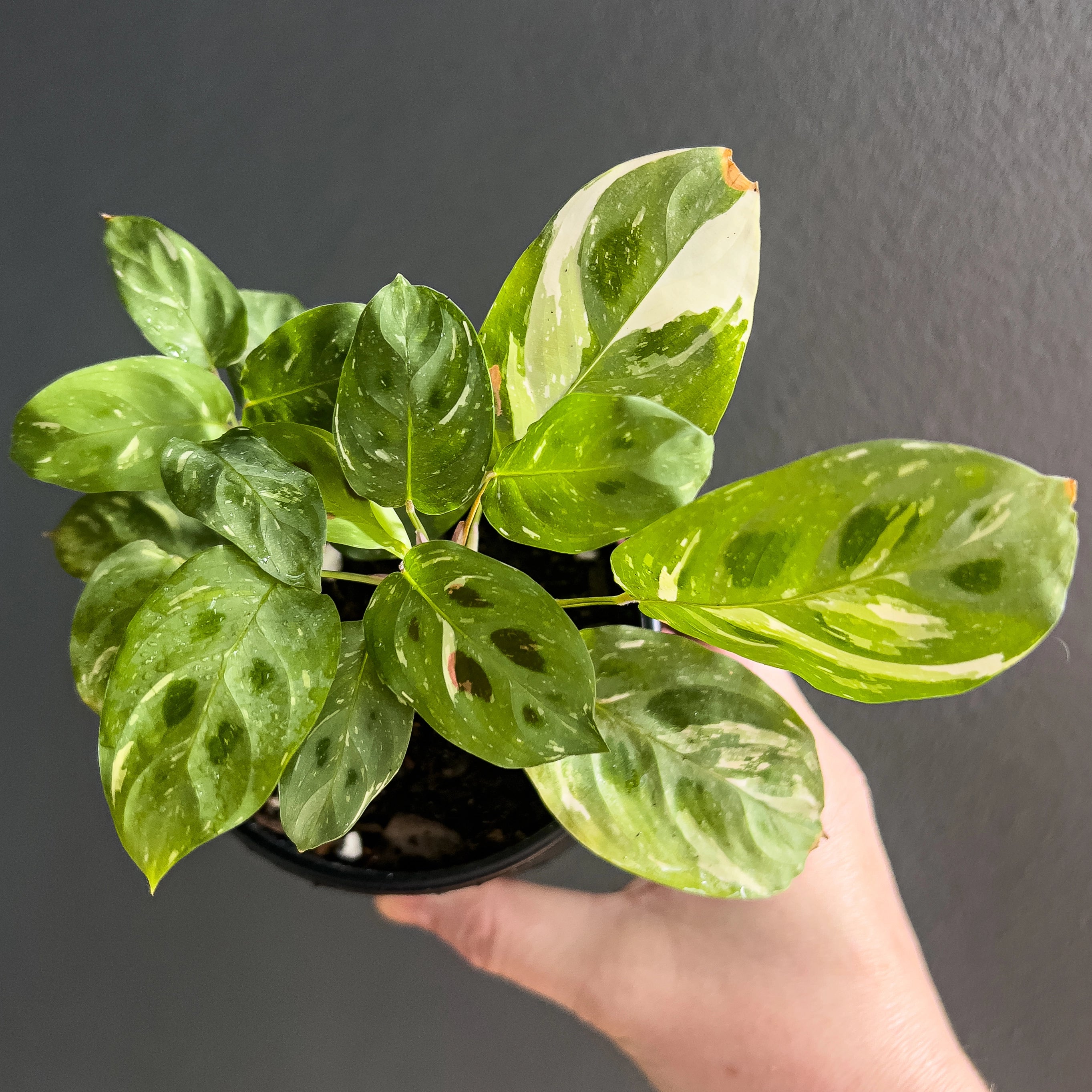 The Maranta Leuconeura Kerchoveana Variegated, commonly known as the 'Prayer Plant,' is a gorgeous rare plant loved for its dynamic foliage. The leaves feature unique shapes and striking variegated patterns. The Variegated Maranta thrives in a well-draining aroid mix and in an area with bright, indirect sunlight, in a warm position in high humidity.