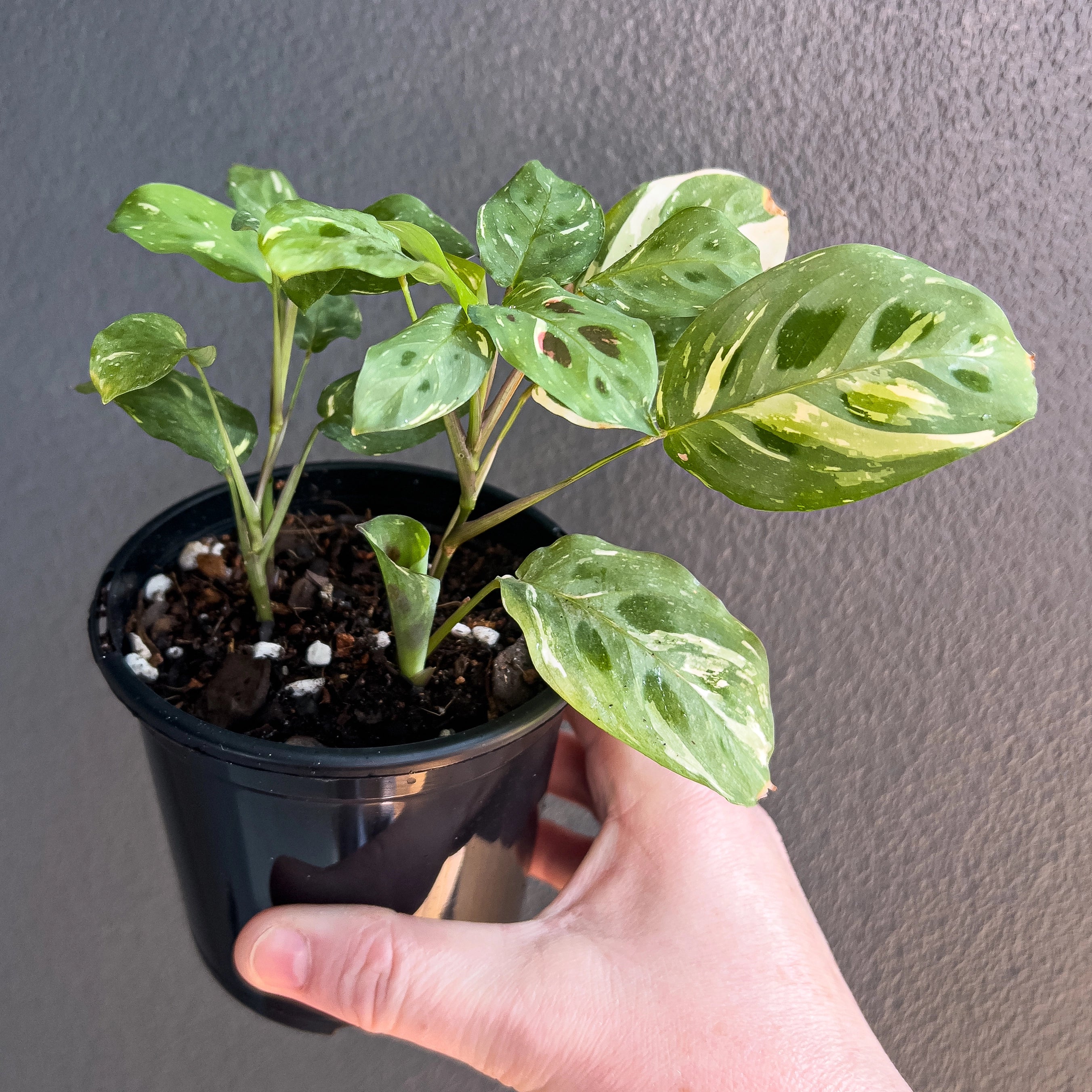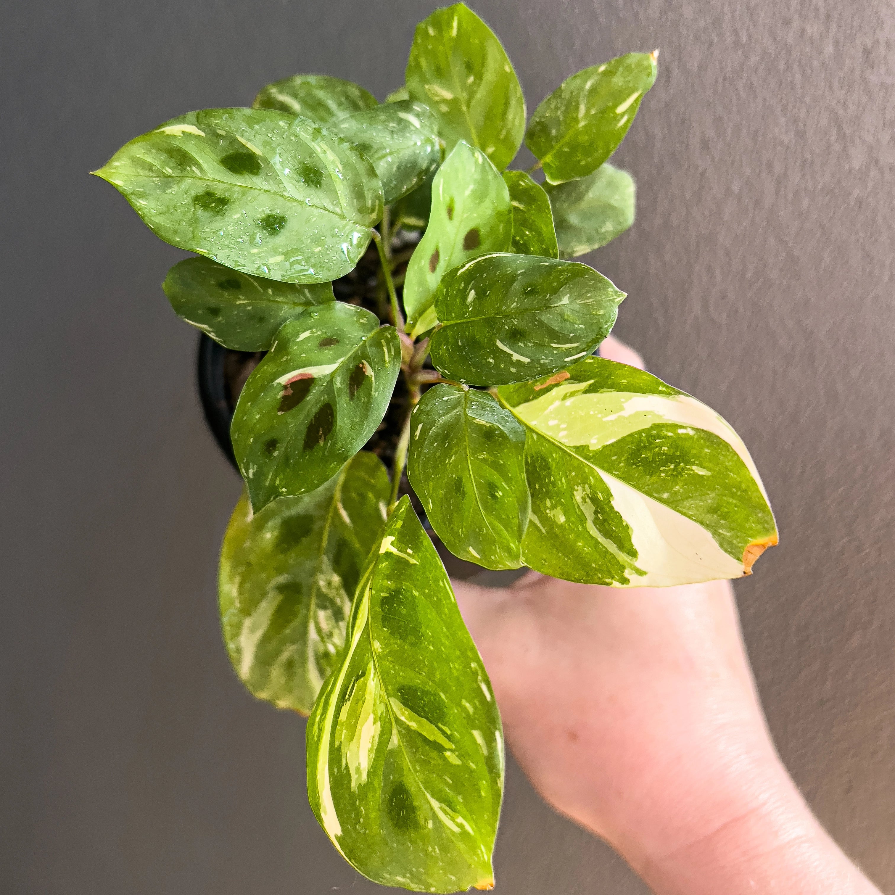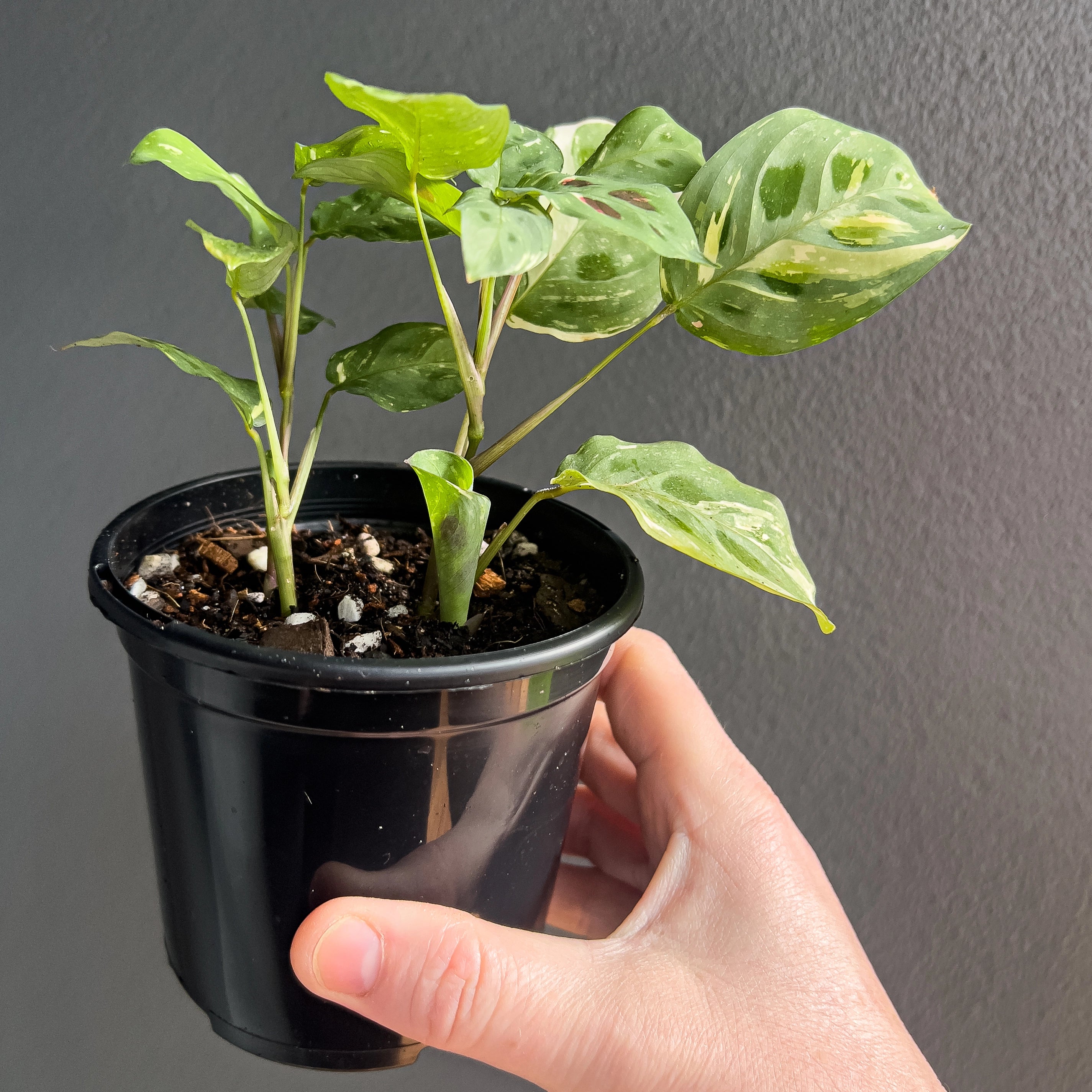 The Maranta Leuconeura Kerchoveana Variegated, commonly known as the 'Prayer Plant,' is a gorgeous rare plant loved for its dynamic foliage. The leaves feature unique shapes and striking variegated patterns. The Variegated Maranta thrives in a well-draining aroid mix and in an area with bright, indirect sunlight, in a warm position in high humidity.