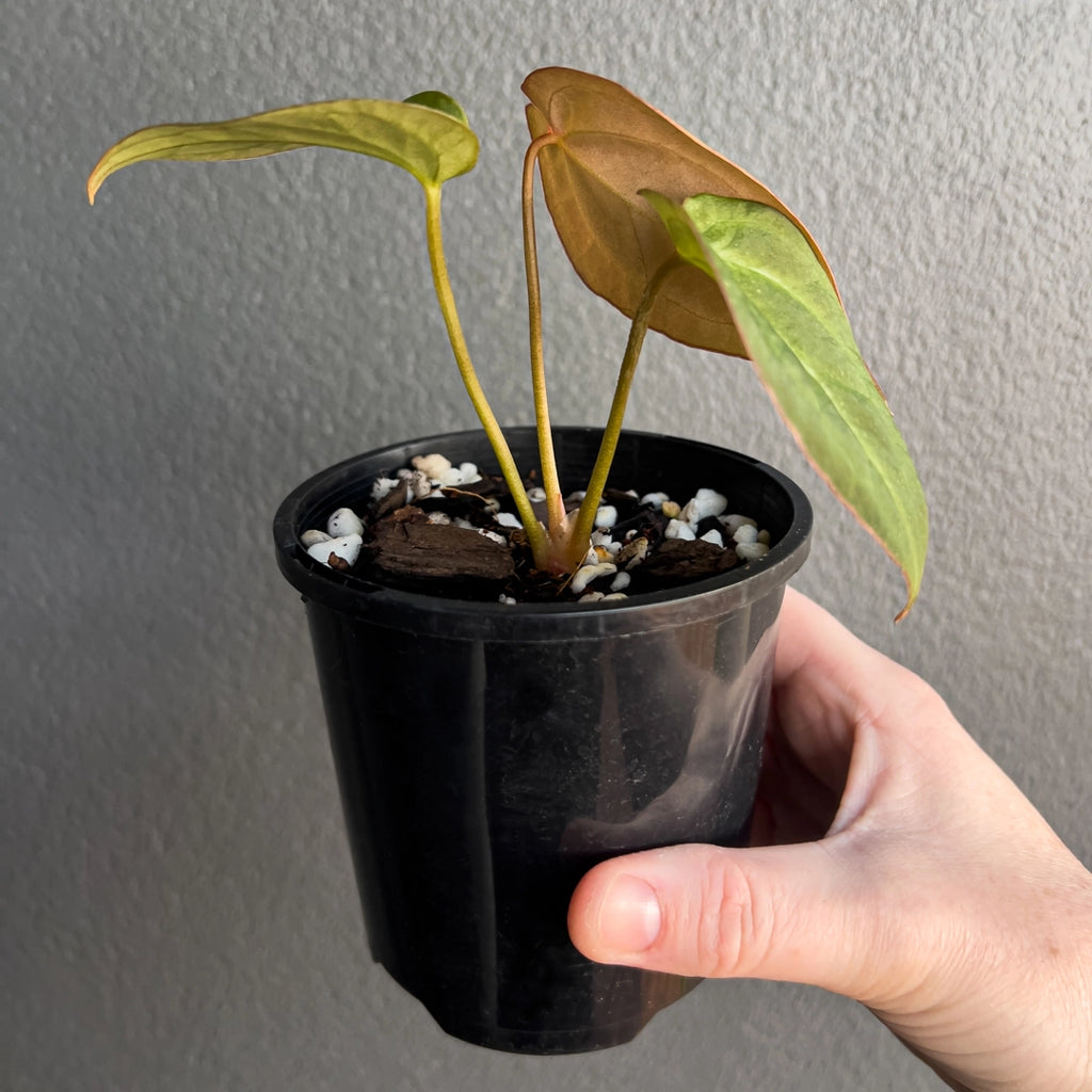 This Anthurium NOID has warm-toned juvenile leaves that shift from bronze and copper to deep green as they mature. Each leaf has a soft satin finish with visible vein structure and a gently elongated heart shape. A hardy, adaptable aroid that offers colour variation through different growth stages.