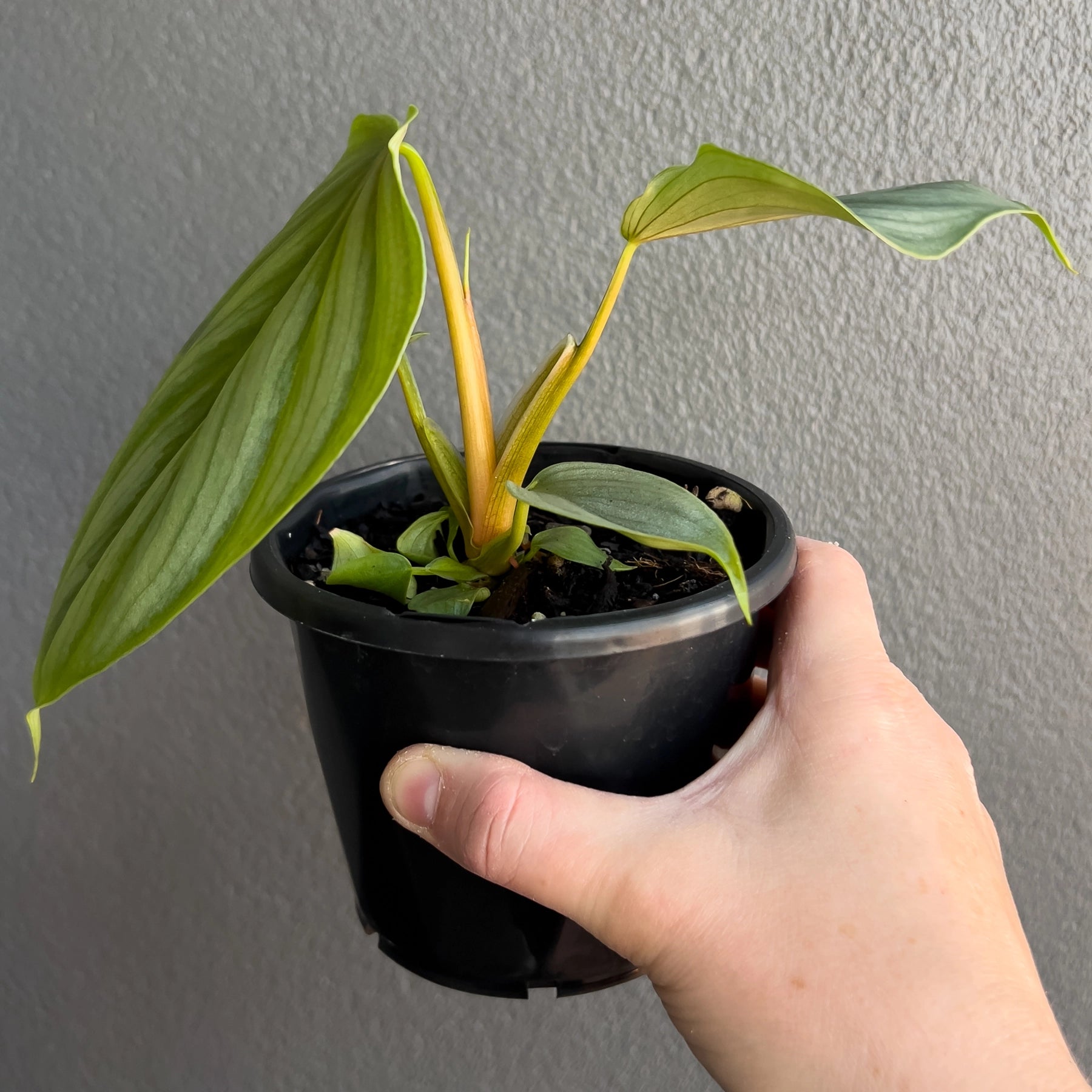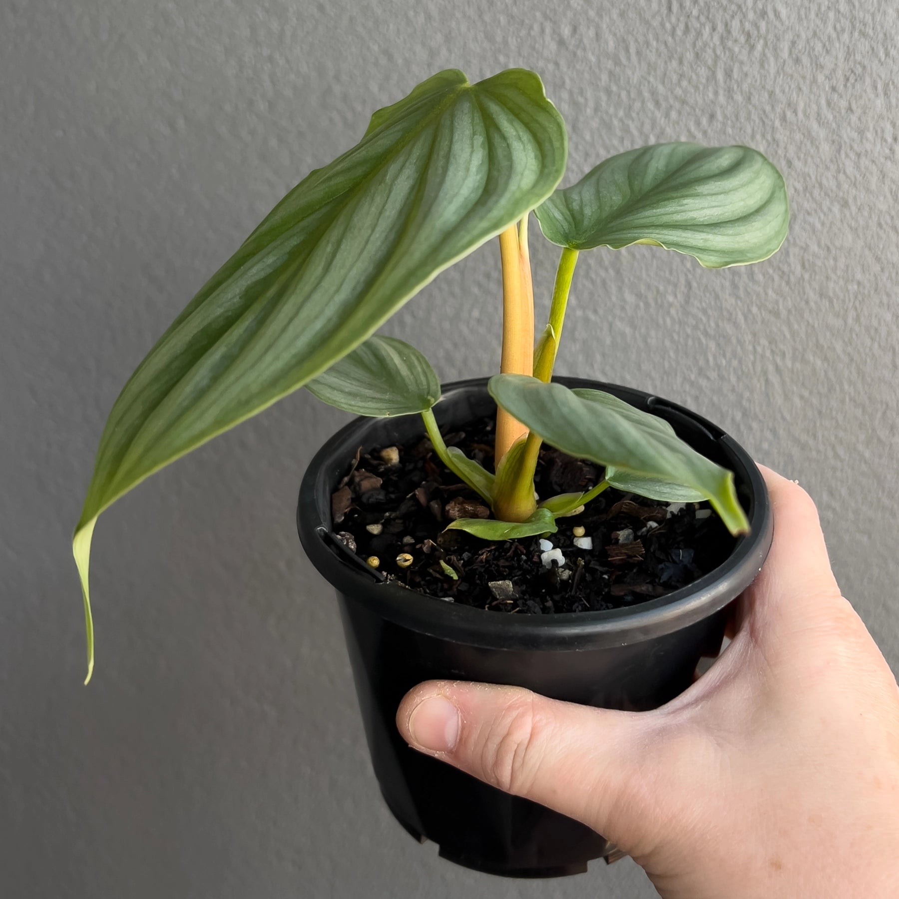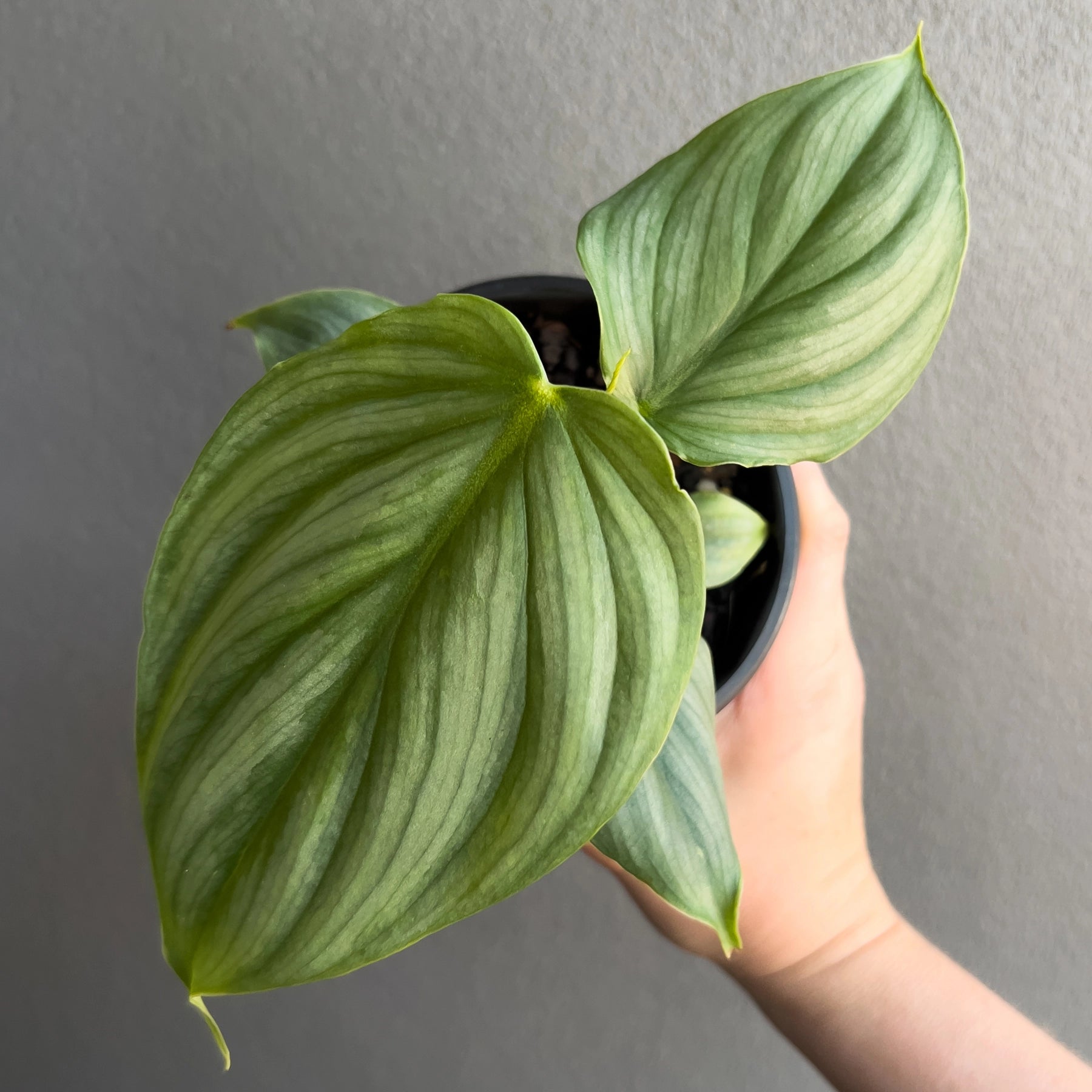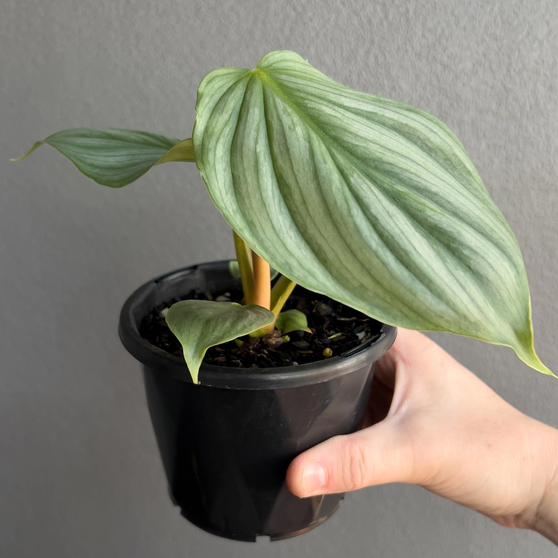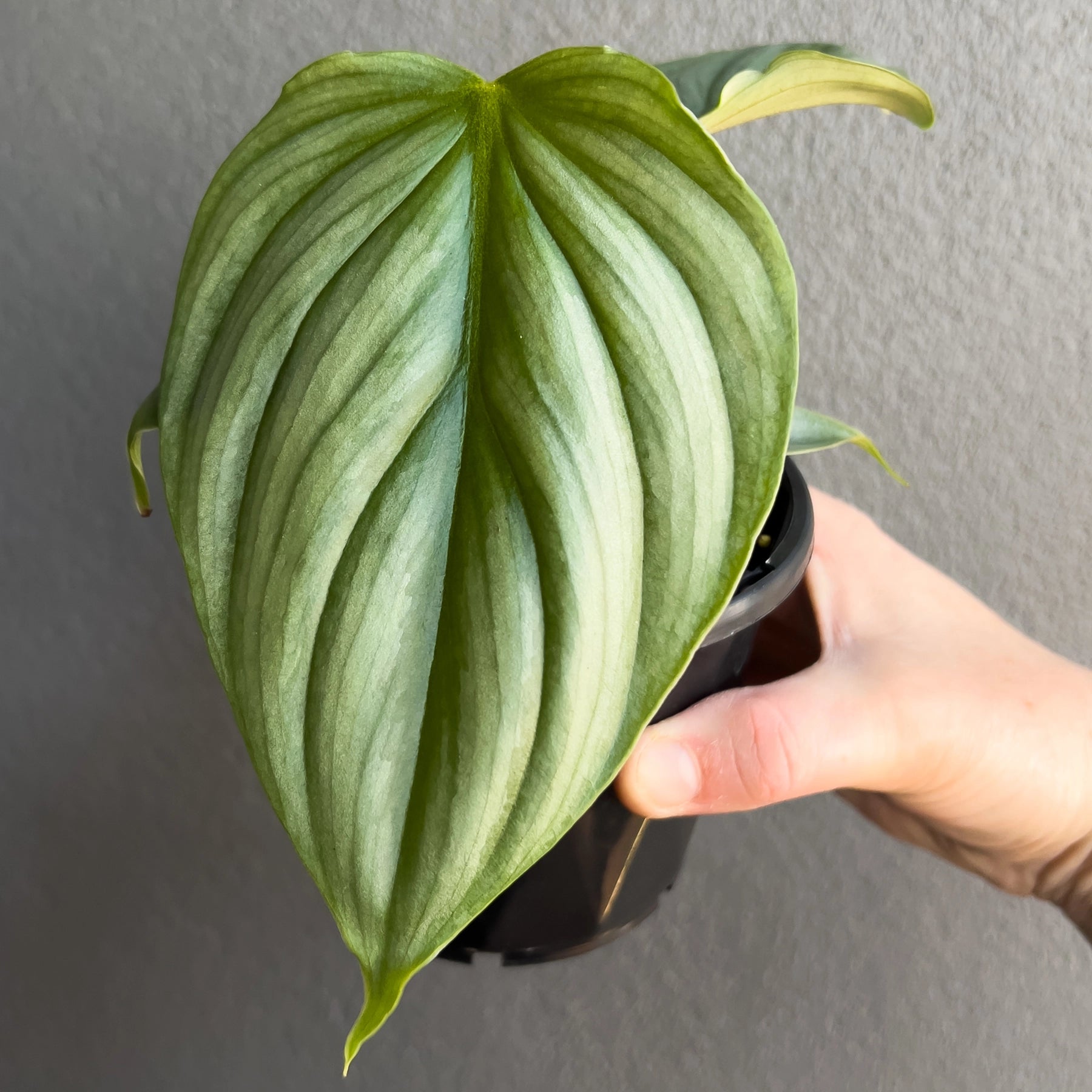 Philodendron plowmanii is a creeping species known for its large quilted leaves and soft heart shaped form. The foliage sits in rich medium green with grey green highlights that pick up the light in a gentle gloss. New leaves often open in pale tones that shift through yellow green and silvery hues before settling into their deeper colour. Petioles have the classic ruffled edge and streaking that plowmanii fans look for, sometimes with a reddish purple tint near the blade. It grows low and wide across the pot which gives it a grounded presence and steady rhythm as each new leaf hardens and shows its texture.