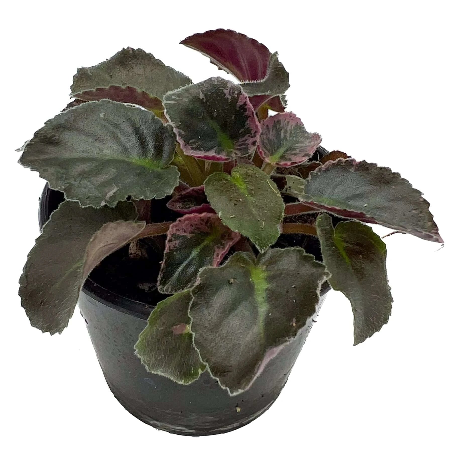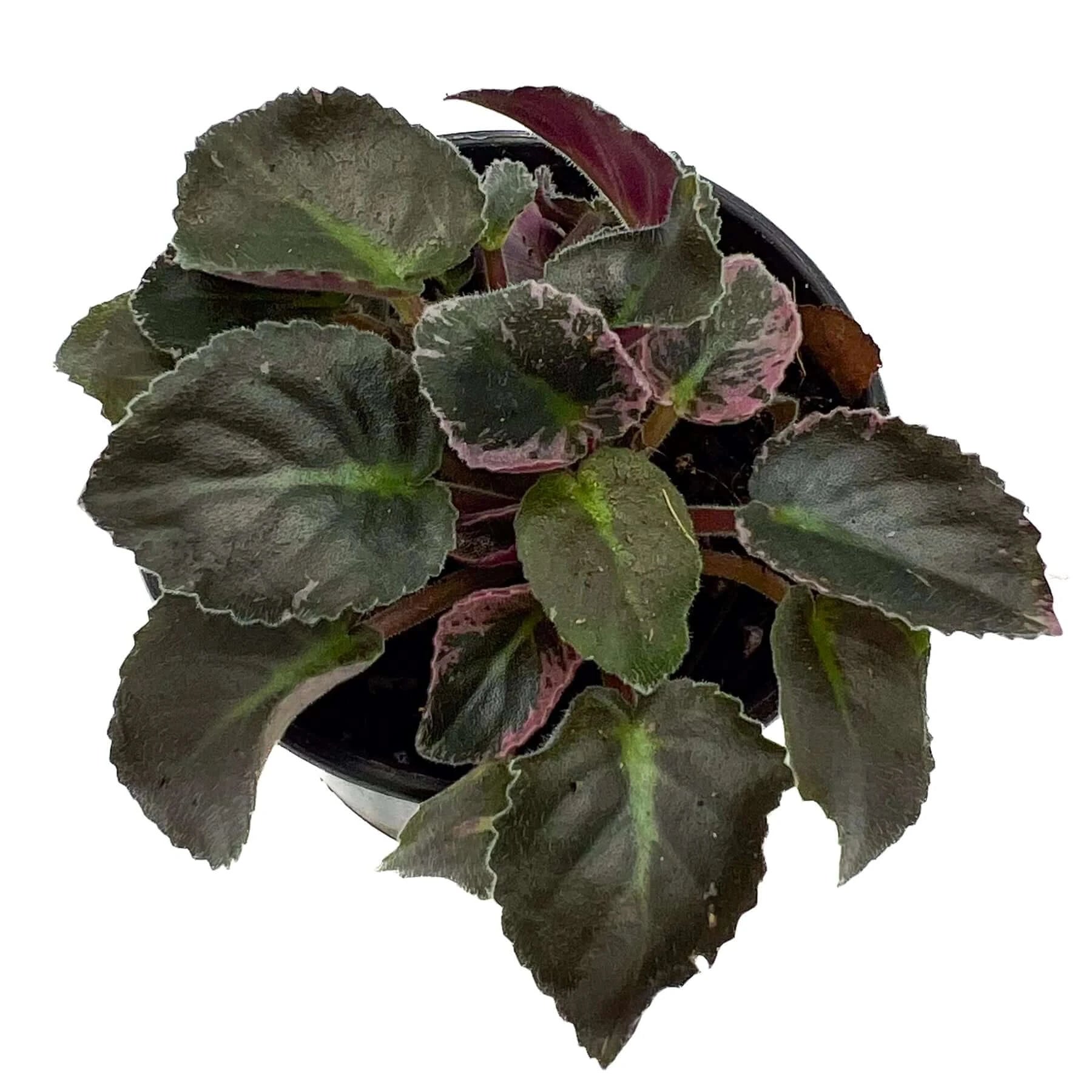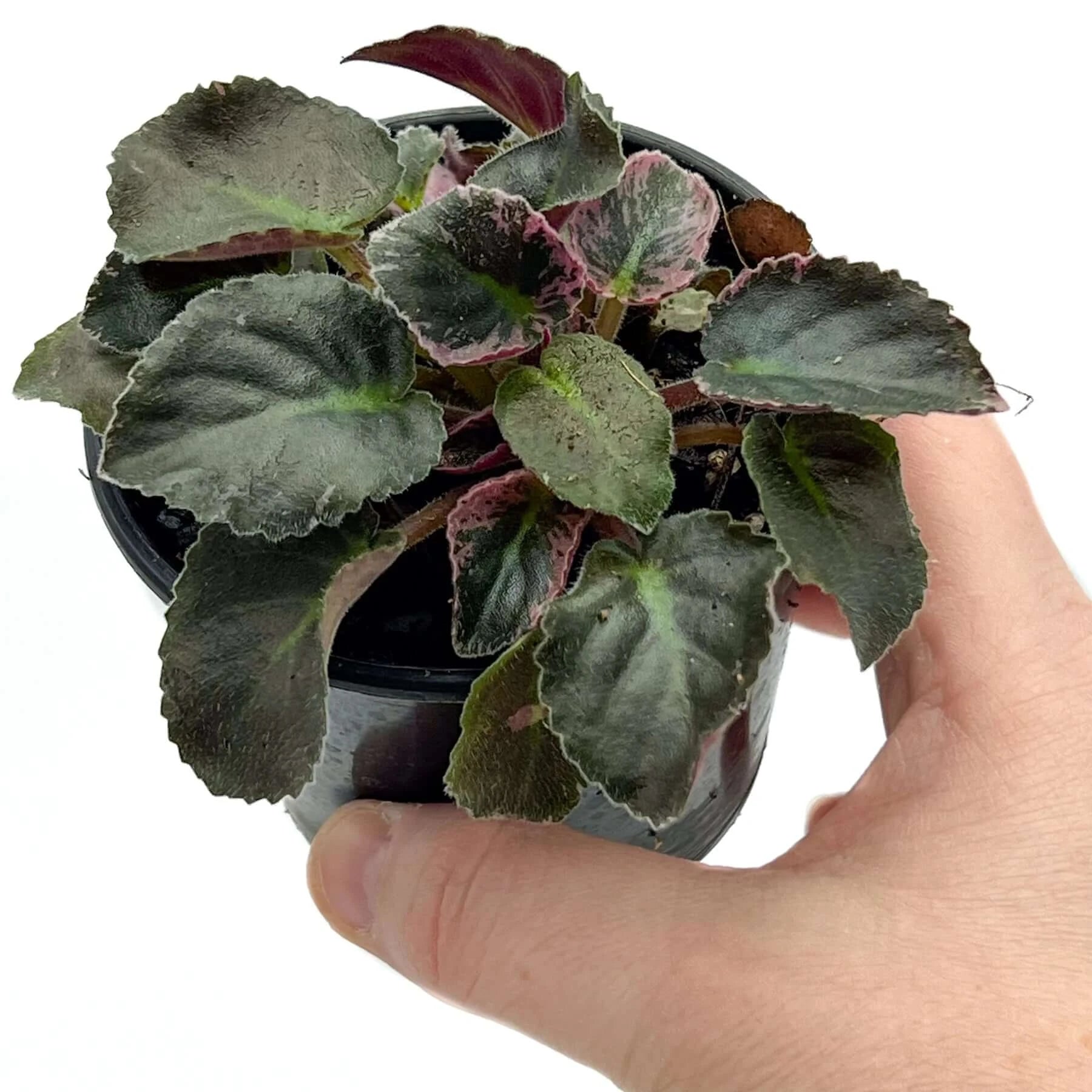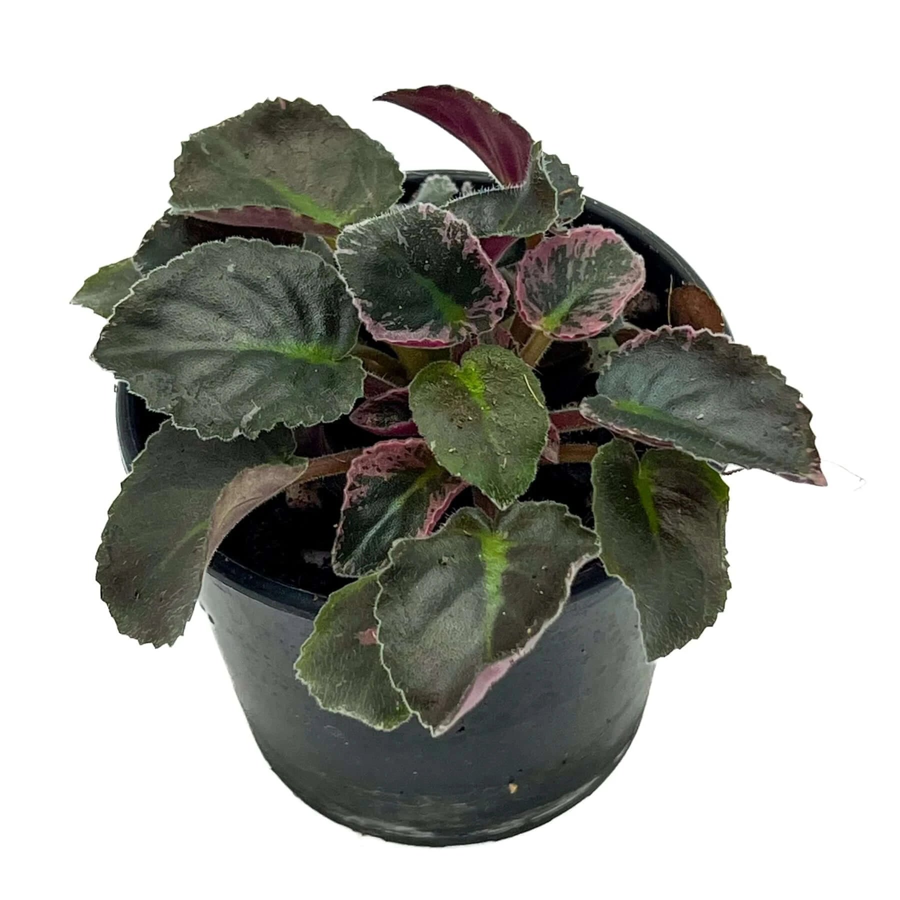 This African Violet features dark green leaves with subtle pink splashes along the edges and it produces white flowers. It's a charming addition to your plant collection, suitable for both beginners and experienced plant enthusiasts. This compact plant is easy to care for and can thrive in various indoor settings. With its attractive foliage, it brings a natural pop of colour to any room.
