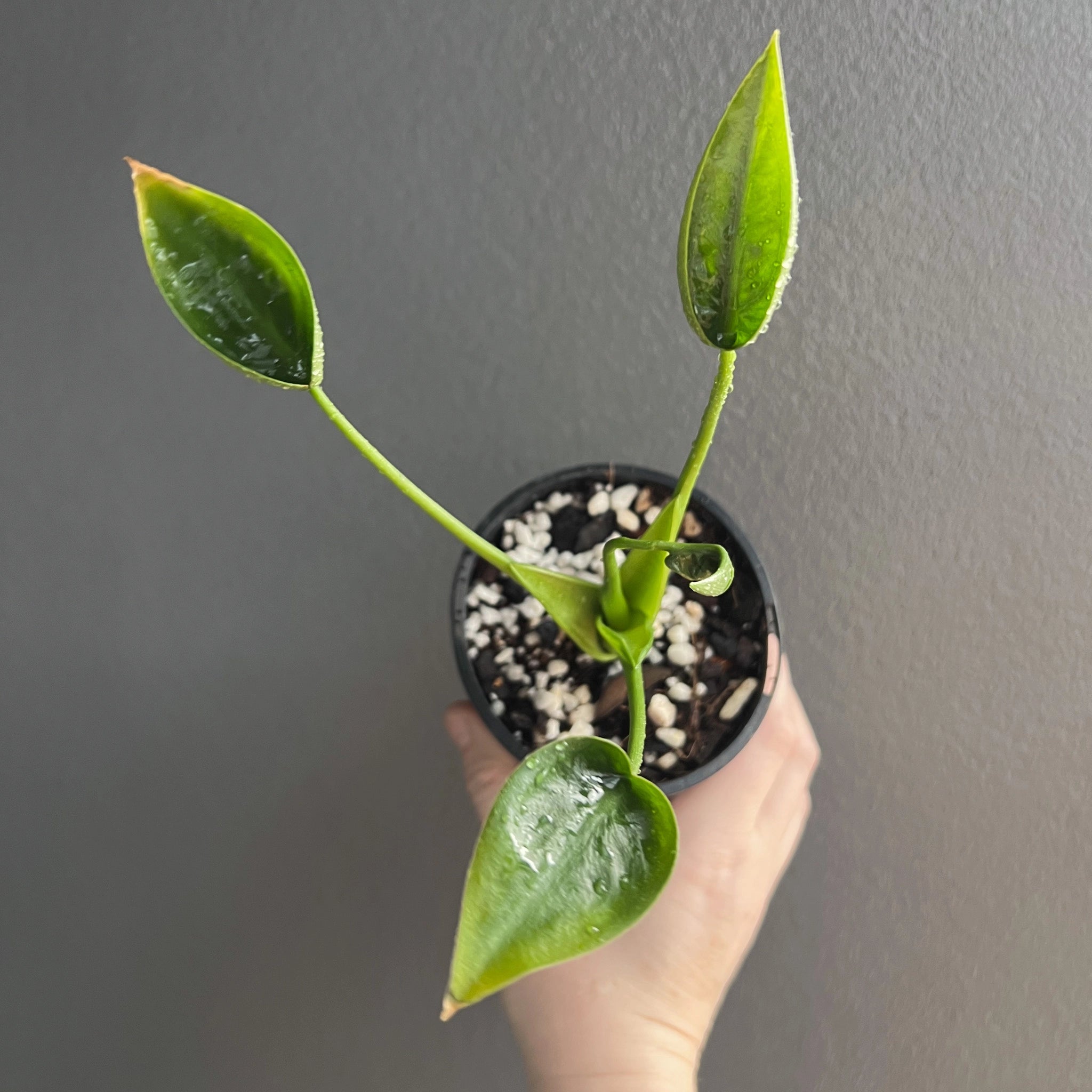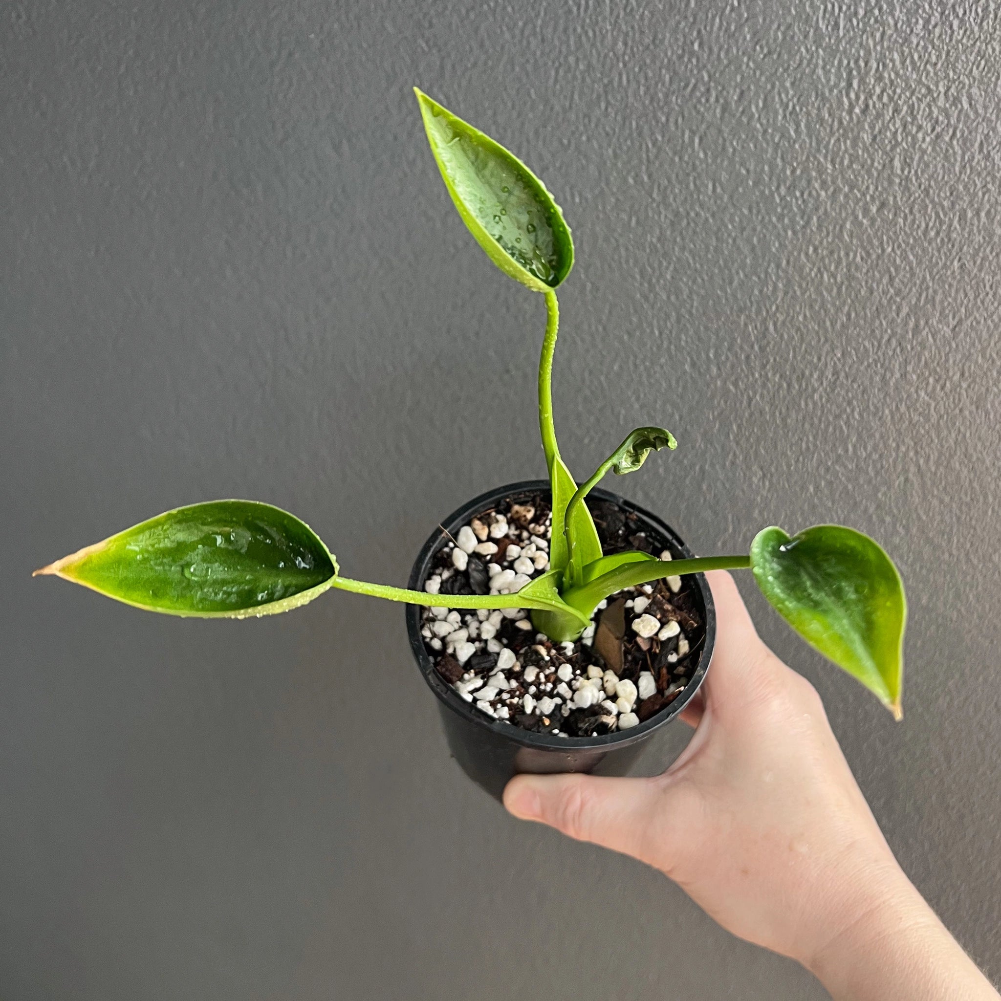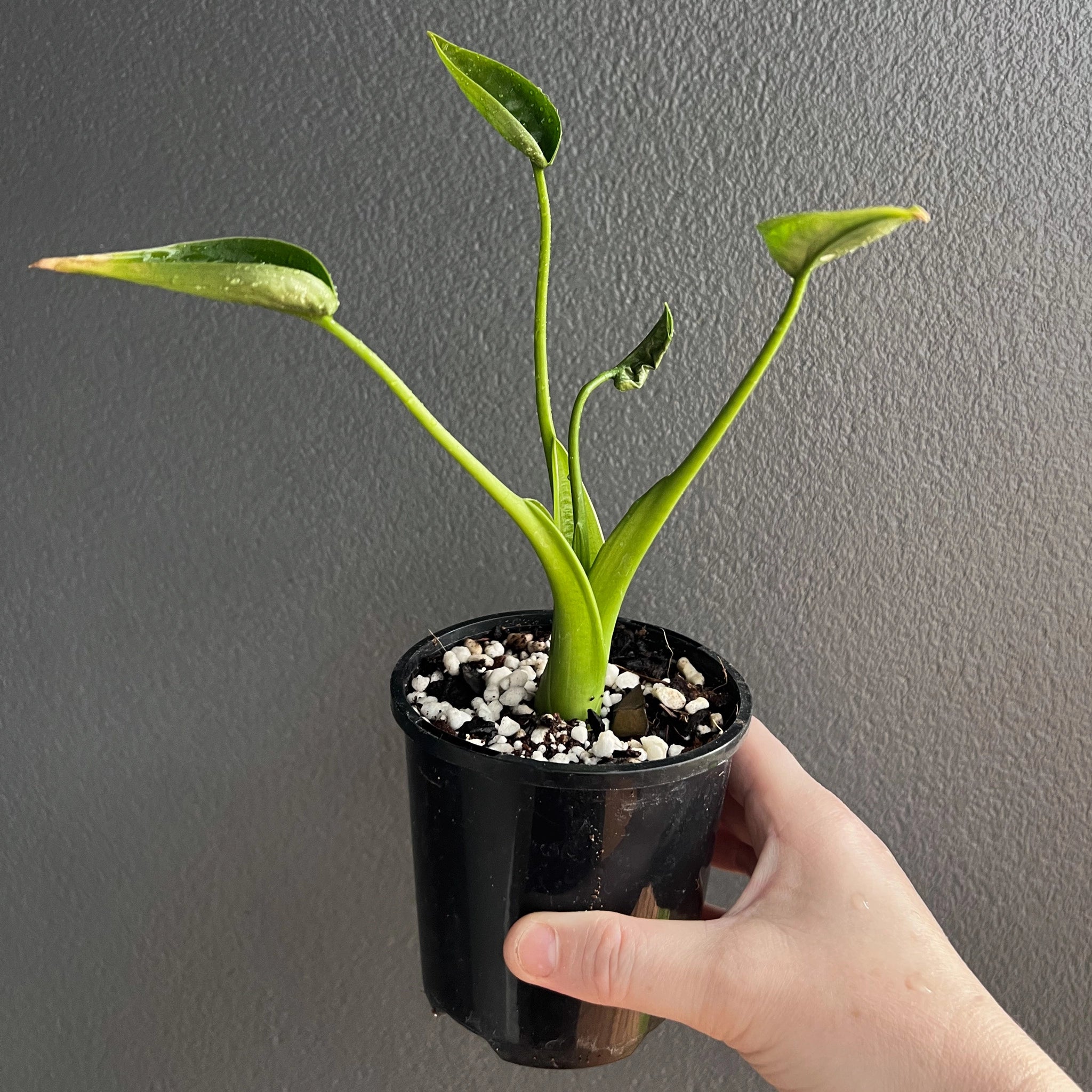 Alocasia Tiny Dancer is an award-winning hybrid between Alocasia brisbanensis and Alocasia odora. Known for its whimsical growth habit, this compact aroid produces slender, curved petioles that hold up small, cupped green leaves. The foliage appears to 'dance' as it fans outward, giving the plant a sculptural look that’s distinct from other Alocasias. Mature plants stay around 40–50 cm tall, making them perfect for shelves or tabletops. Native to warm, humid conditions, ‘Tiny Dancer’ thrives in bright, indirect light and appreciates consistent moisture with free-draining soil.