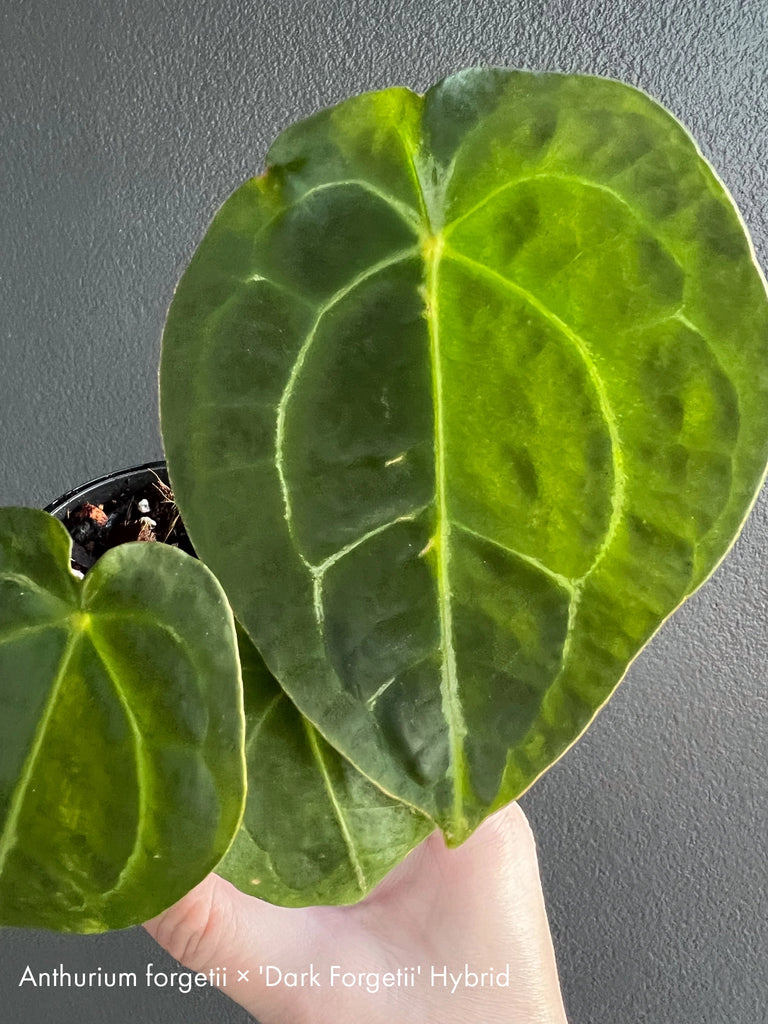 A striking hybrid with velvety, dark green leaves and pronounced venation. Grows compact and elegant, perfect for collectors seeking a unique foliage Anthurium.