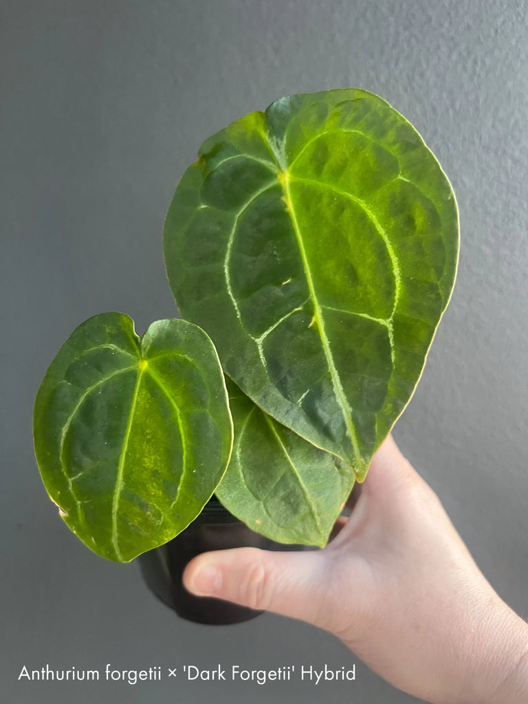The Anthurium forgetii × 'Dark Forgetii' Hybrid has a gorgeous blend and qualities of an Anthurium forgetii hybrid with the rich, deep colouring of an Anturium dark forgetii. Expect round, velvety leaves, with foliage that may show deeper greens, a softer sheen, and slight variation in form thanks to the hybrid parentage.
