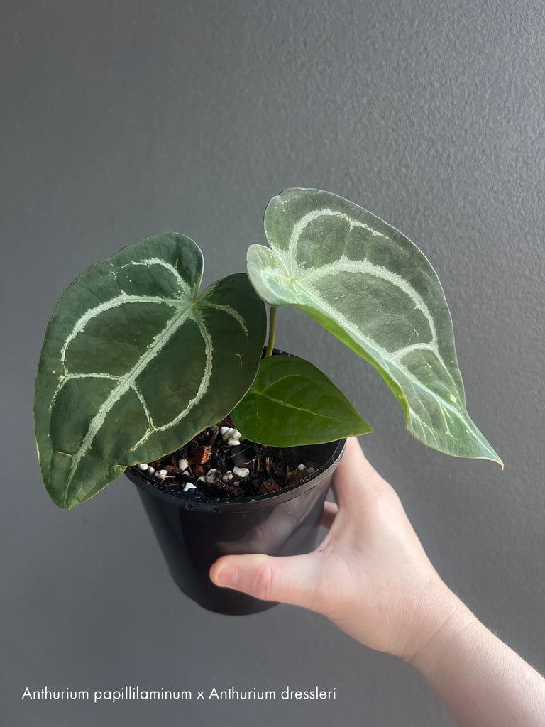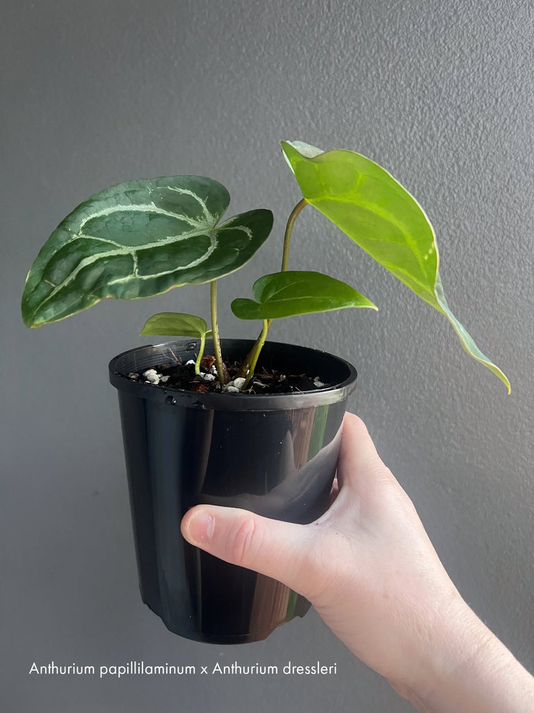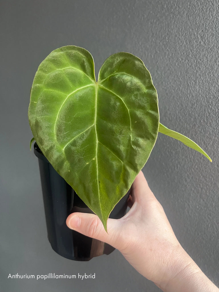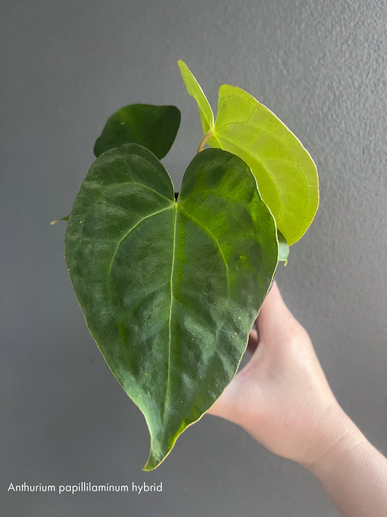 This Anthurium papillilaminum hybrid is a seed-grown plant, grown in-house with care. It features lush, velvety foliage and deep green tones, often developing strong texture and subtle rippling across the leaf surface.