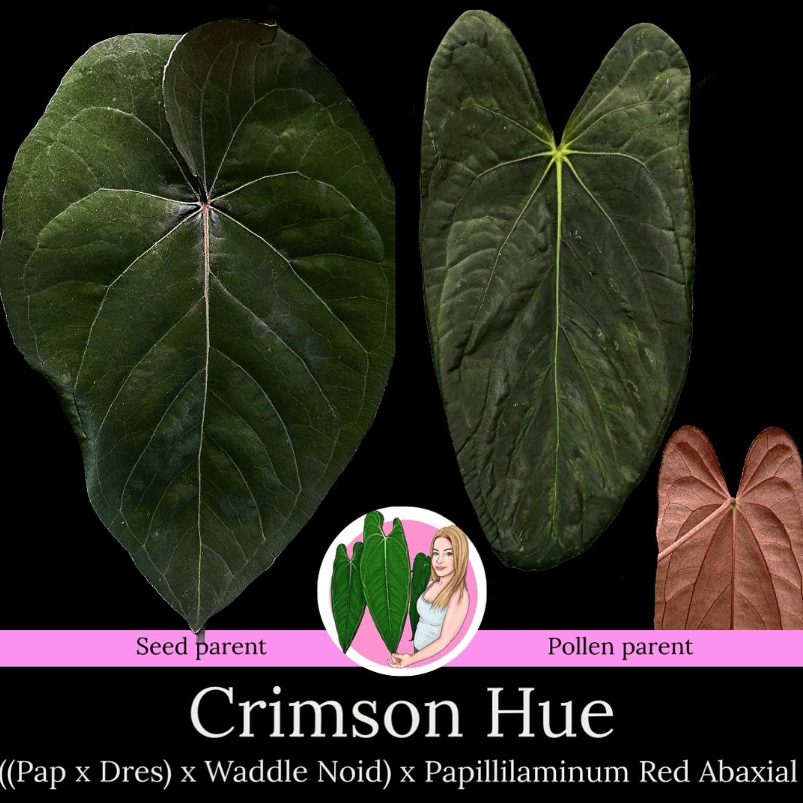 The (Papillilaminum x Dressleri) x Waddle NoID parent is a creation of @waddlearoundplants, selected for its dark purple petioles, deep sinus, and rich purple-red abaxials. It is paired with Papillilaminum sp. Red Abaxial, a line developed by Miguel and cloned from Harrison’s well-known plant, known for its striking red-backed foliage and gloss.