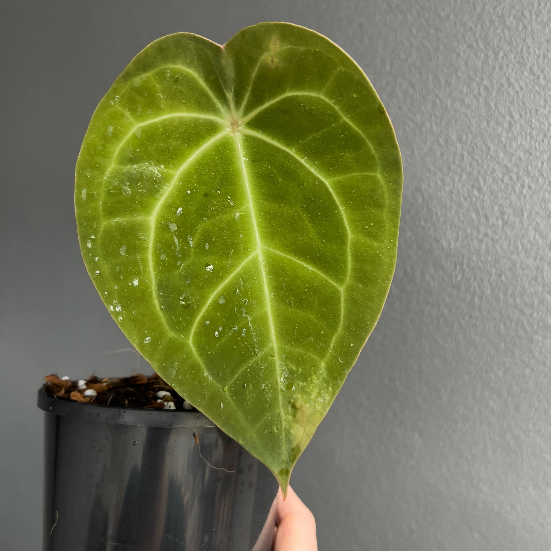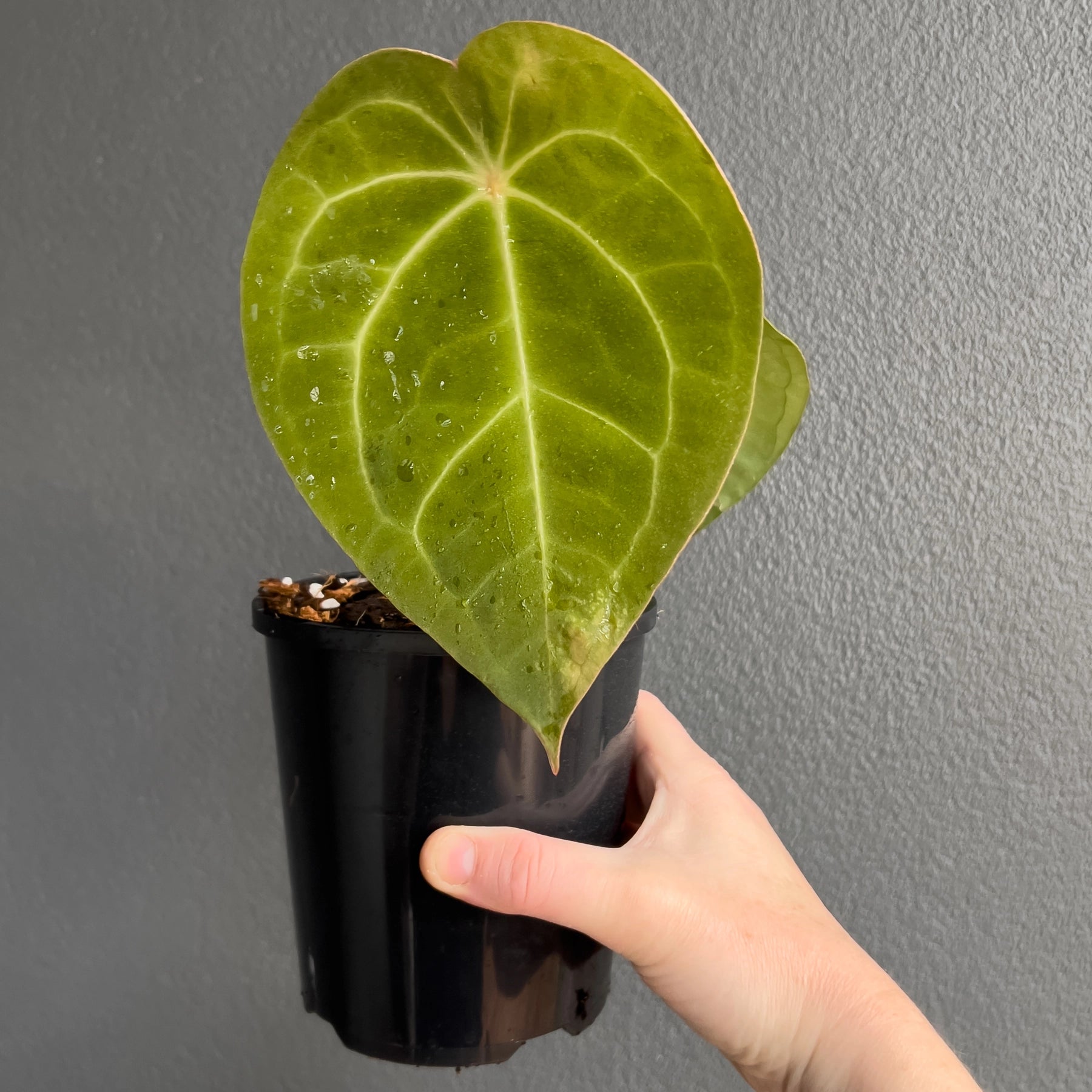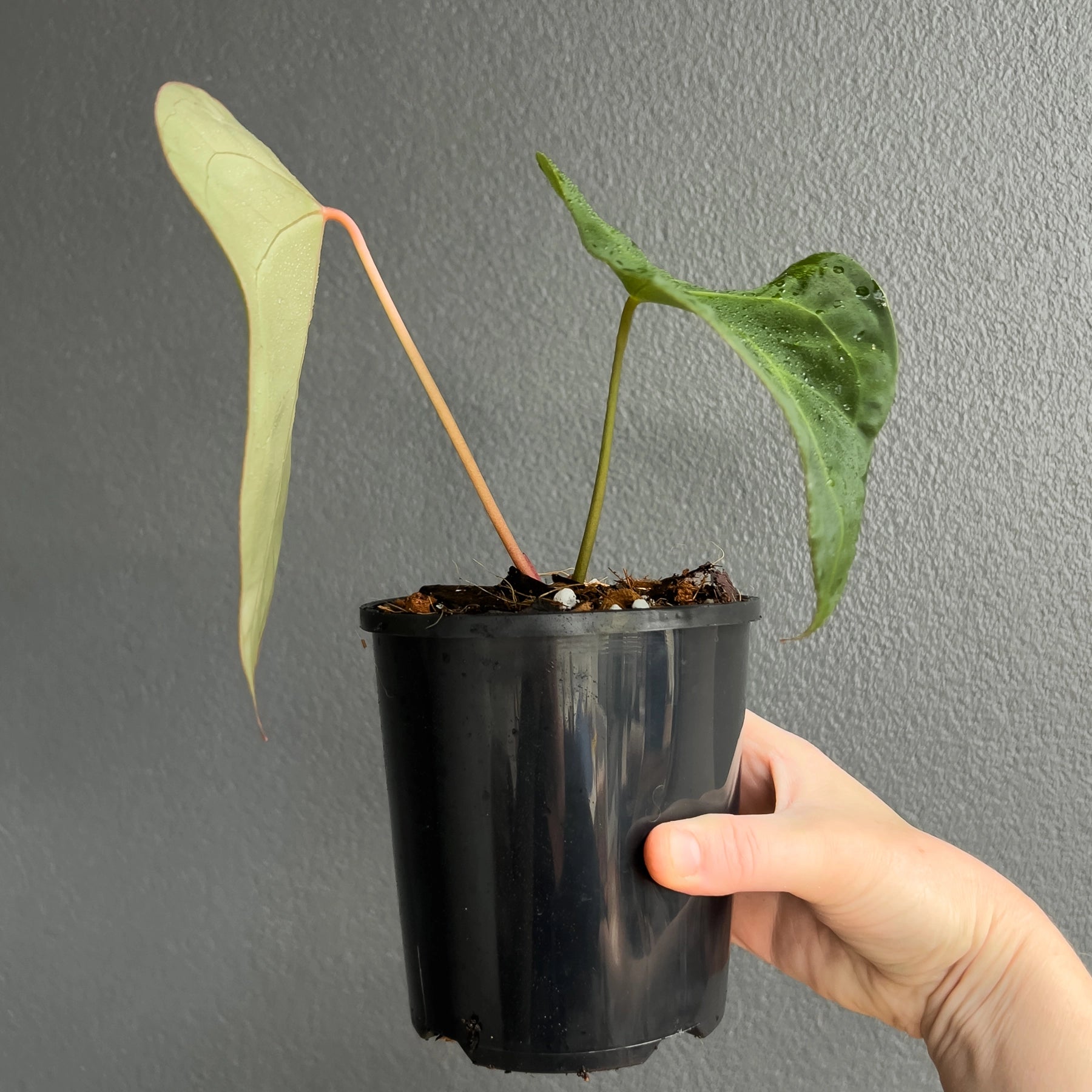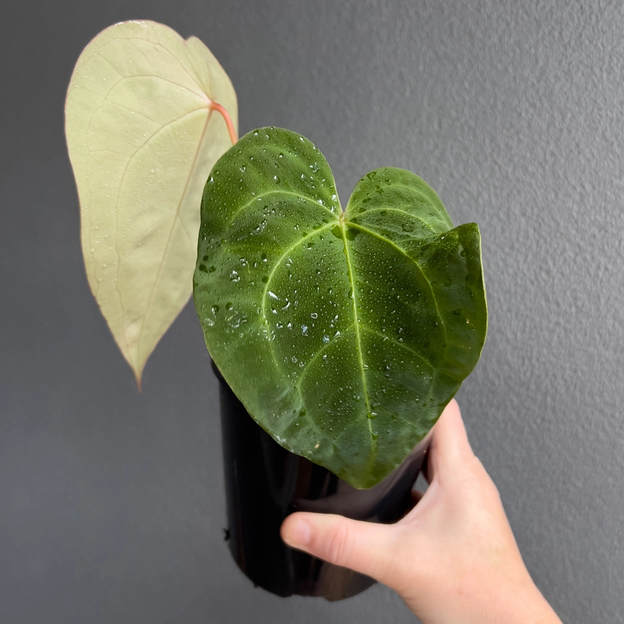 Anthurium dressleri × crystallinum 'Cape Oasis' is a unique hybrid grown from seed in-house. This beautiful plant blends the deep green, elongated leaves of dressleri with the striking silver veining of crystallinum 'Cape Oasis'. Foliage develops strong texture and a soft velvety finish, creating a standout feature in any collection. Best suited to bright, indirect light, high humidity, and a chunky aroid mix.