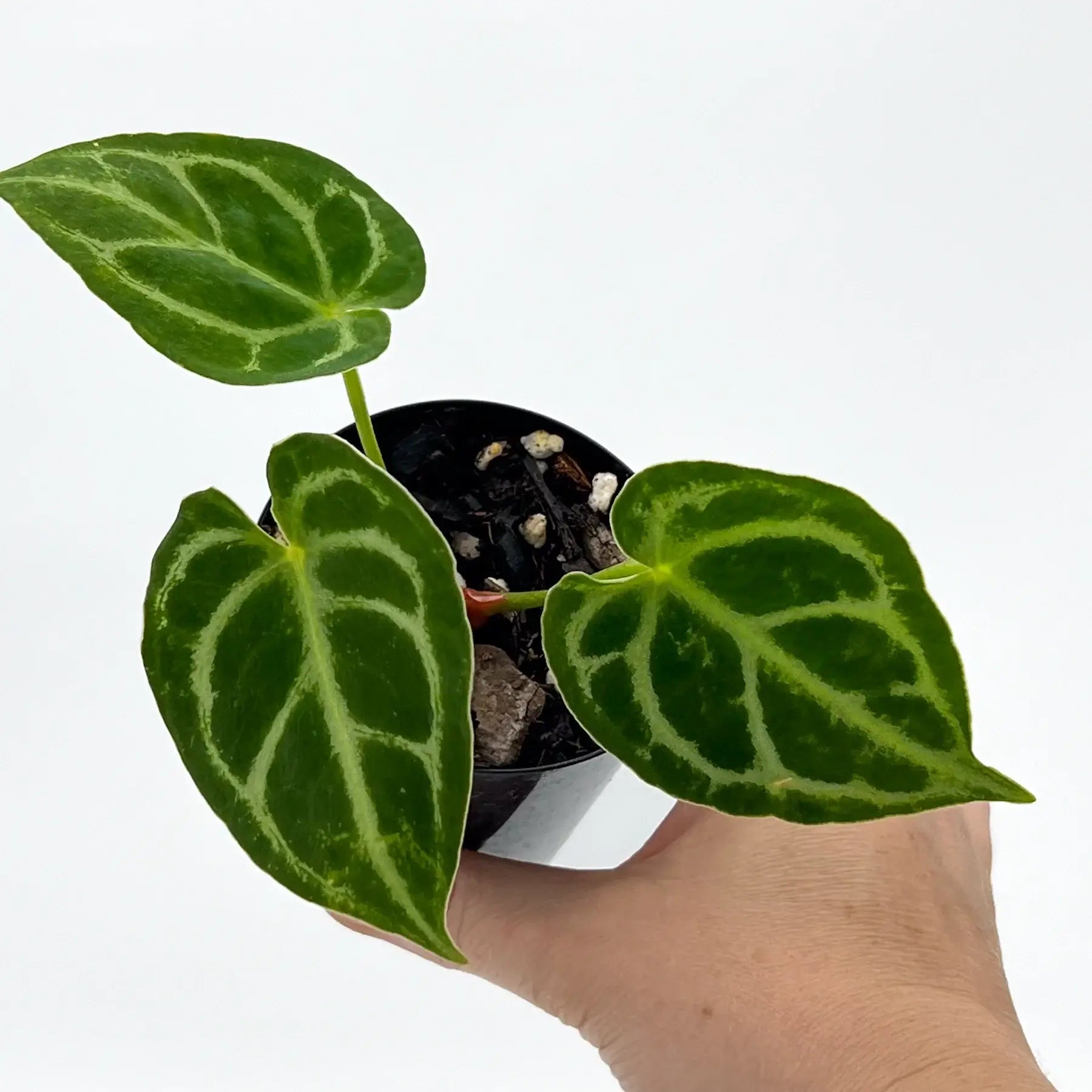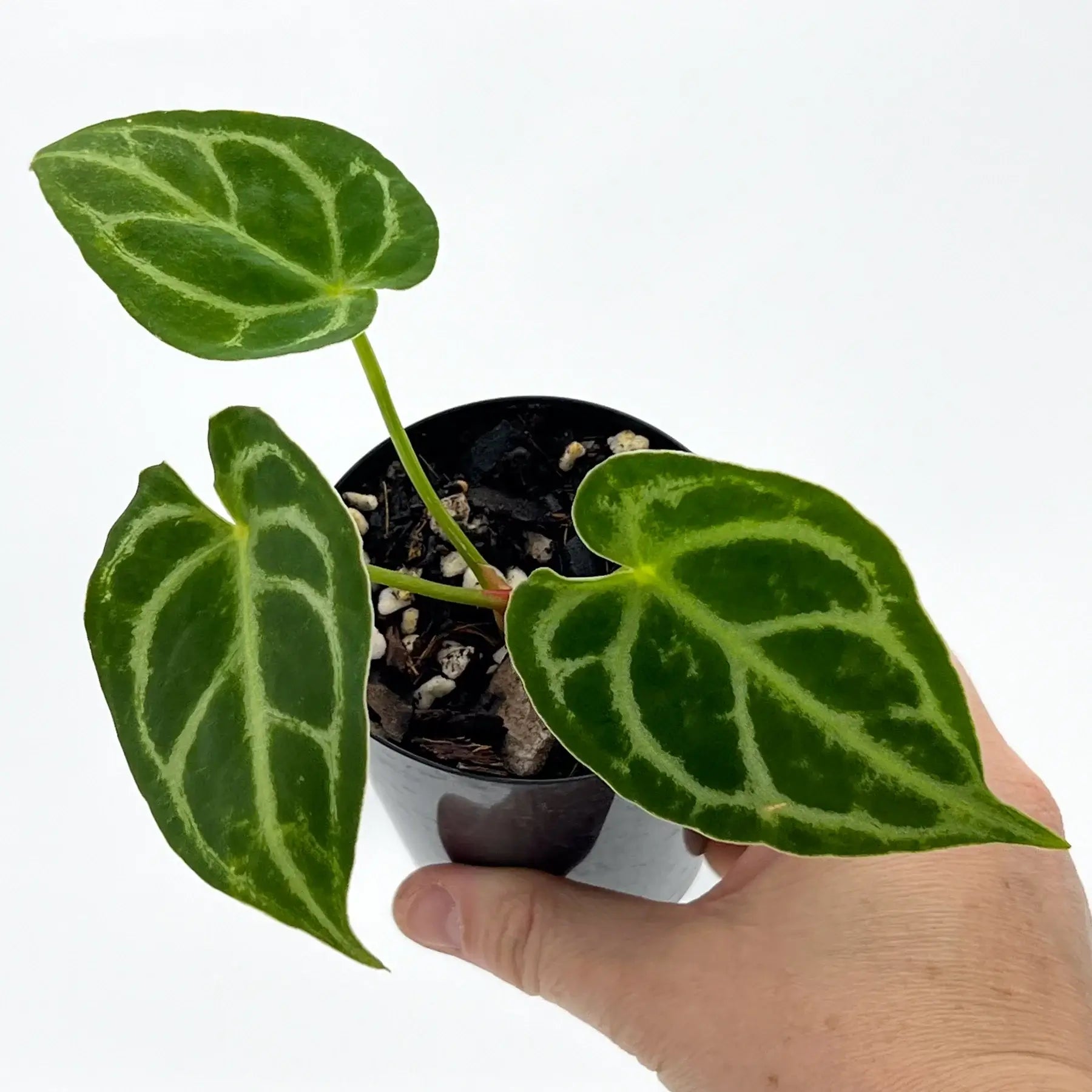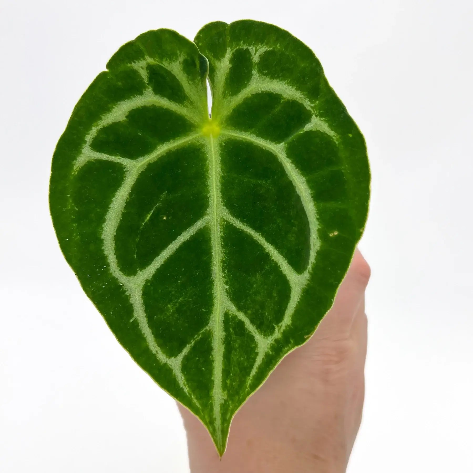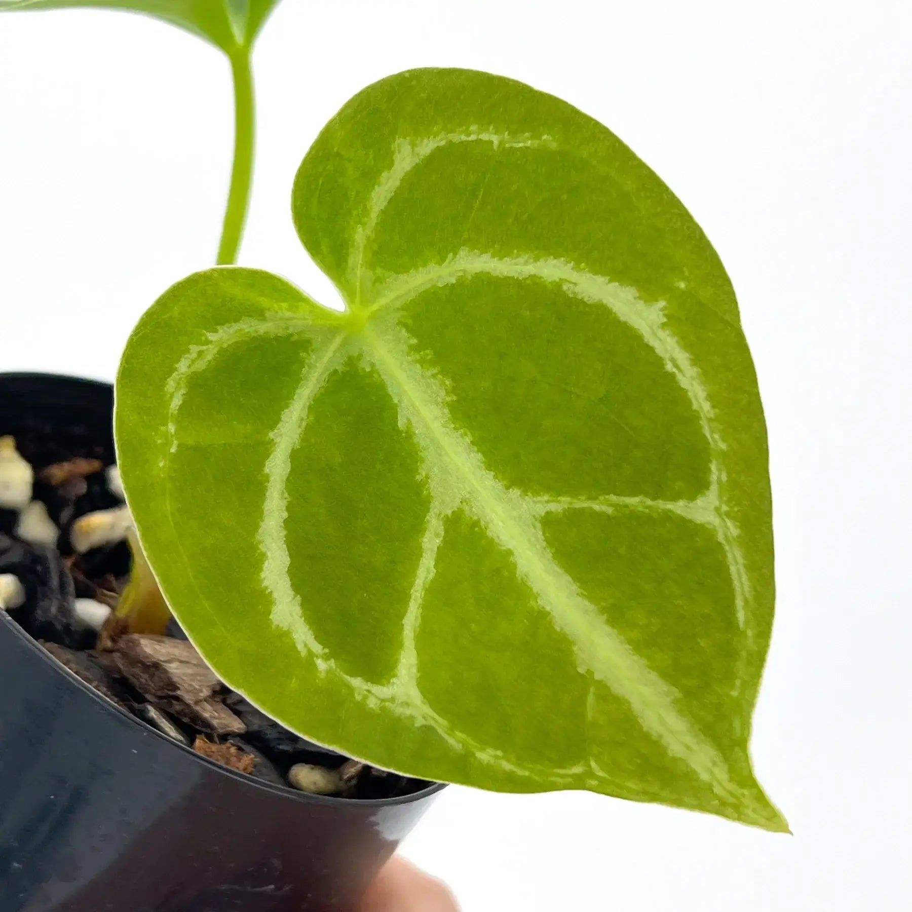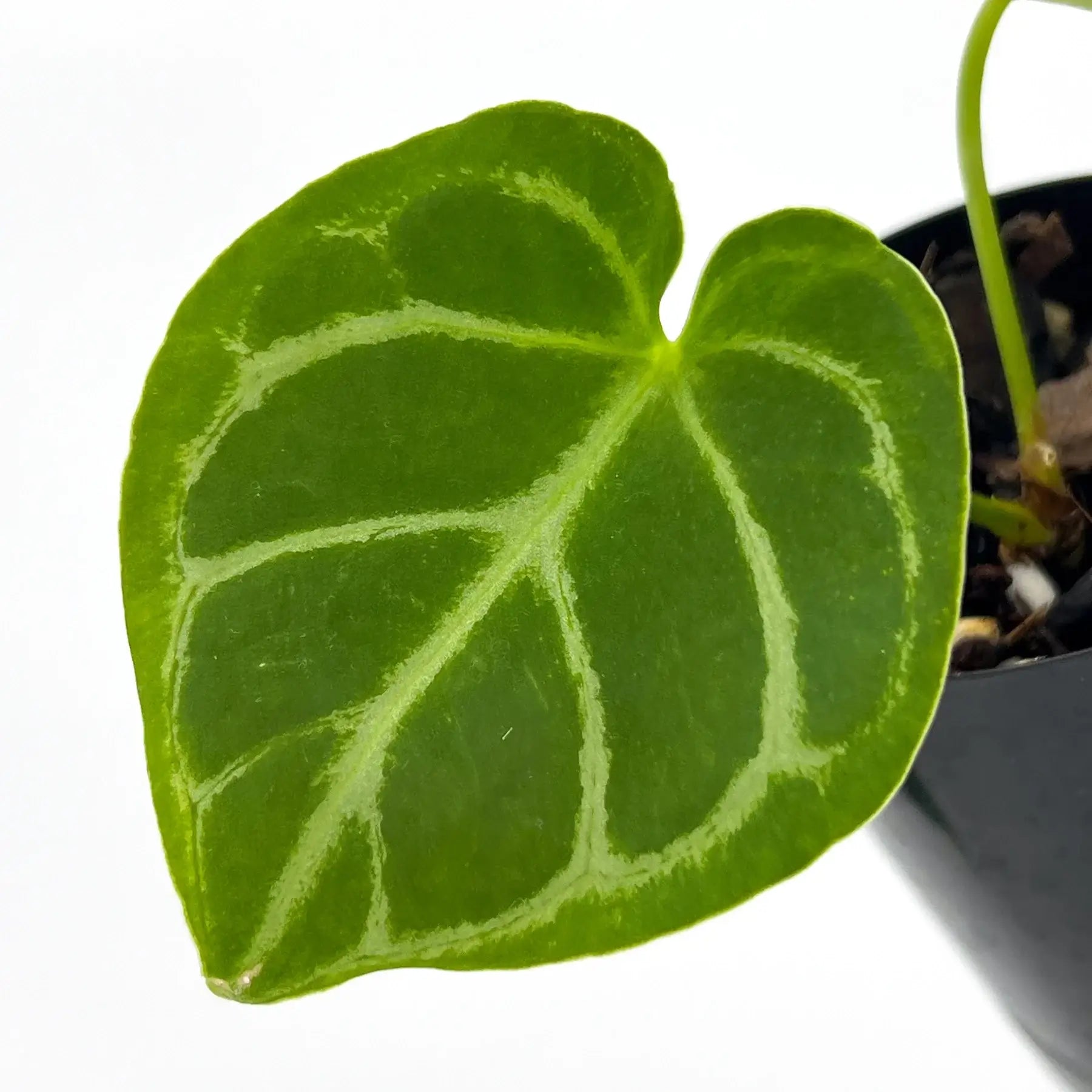 Anthurium Forgetii x Crystallinum is a stunning hybrid combining the velvety texture of Anthurium Forgetii with the bold, silvery venation of Anthurium Crystallinum. Its foliage is oval-shaped with a slightly elongated form, featuring prominent white veins that contrast beautifully against the dark green leaves. Known for its compact growth habit, this hybrid thrives in bright, indirect light and high humidity, making it ideal for collectors seeking a striking centrepiece. With proper care, this hybrid will reward you with lush, velvety foliage and long-lasting beauty.