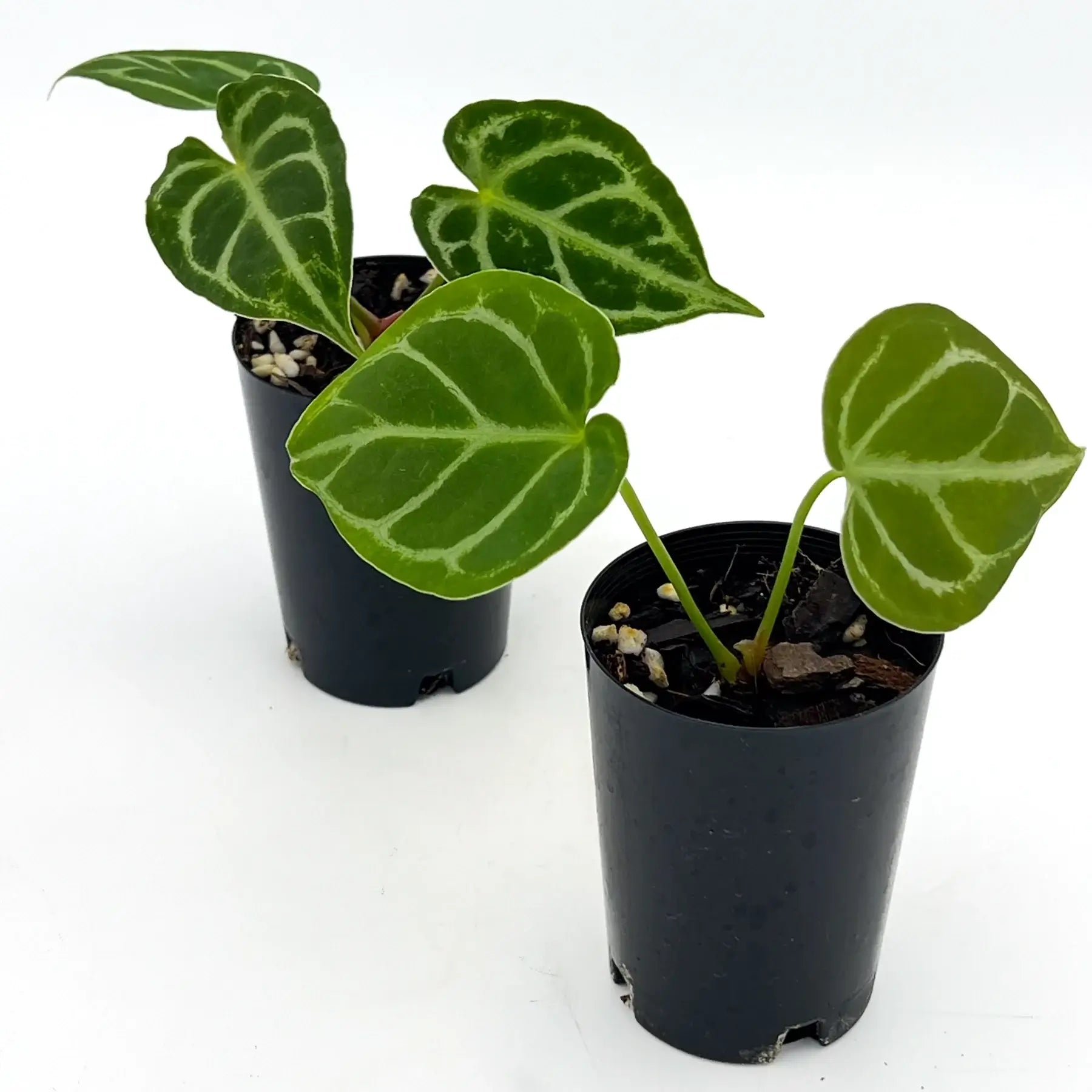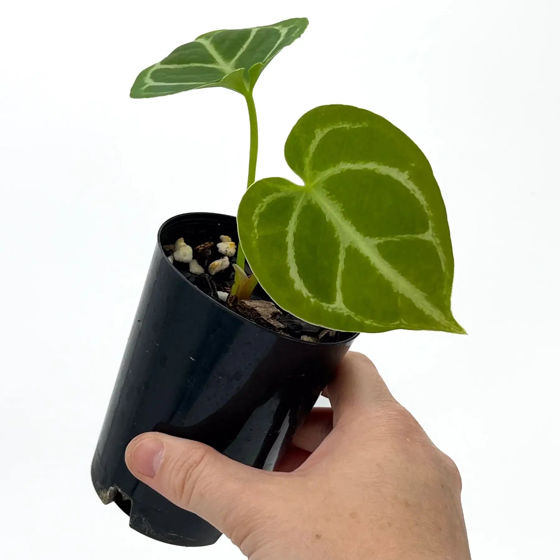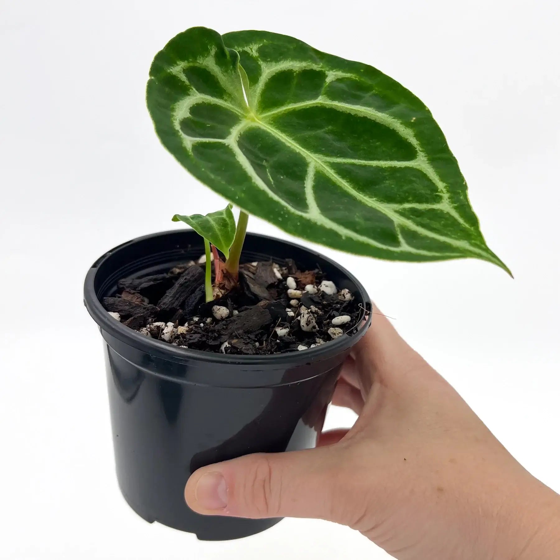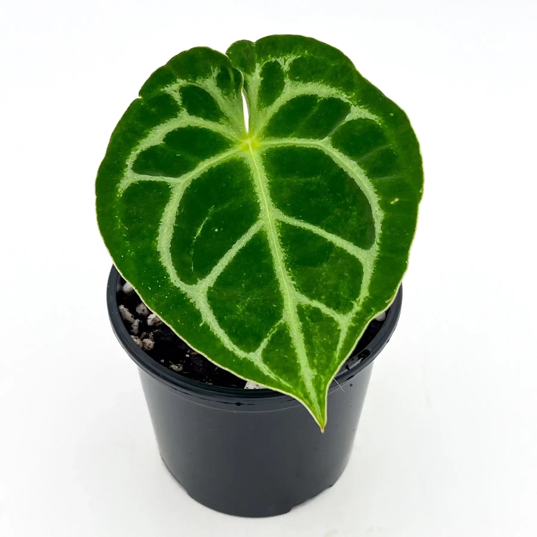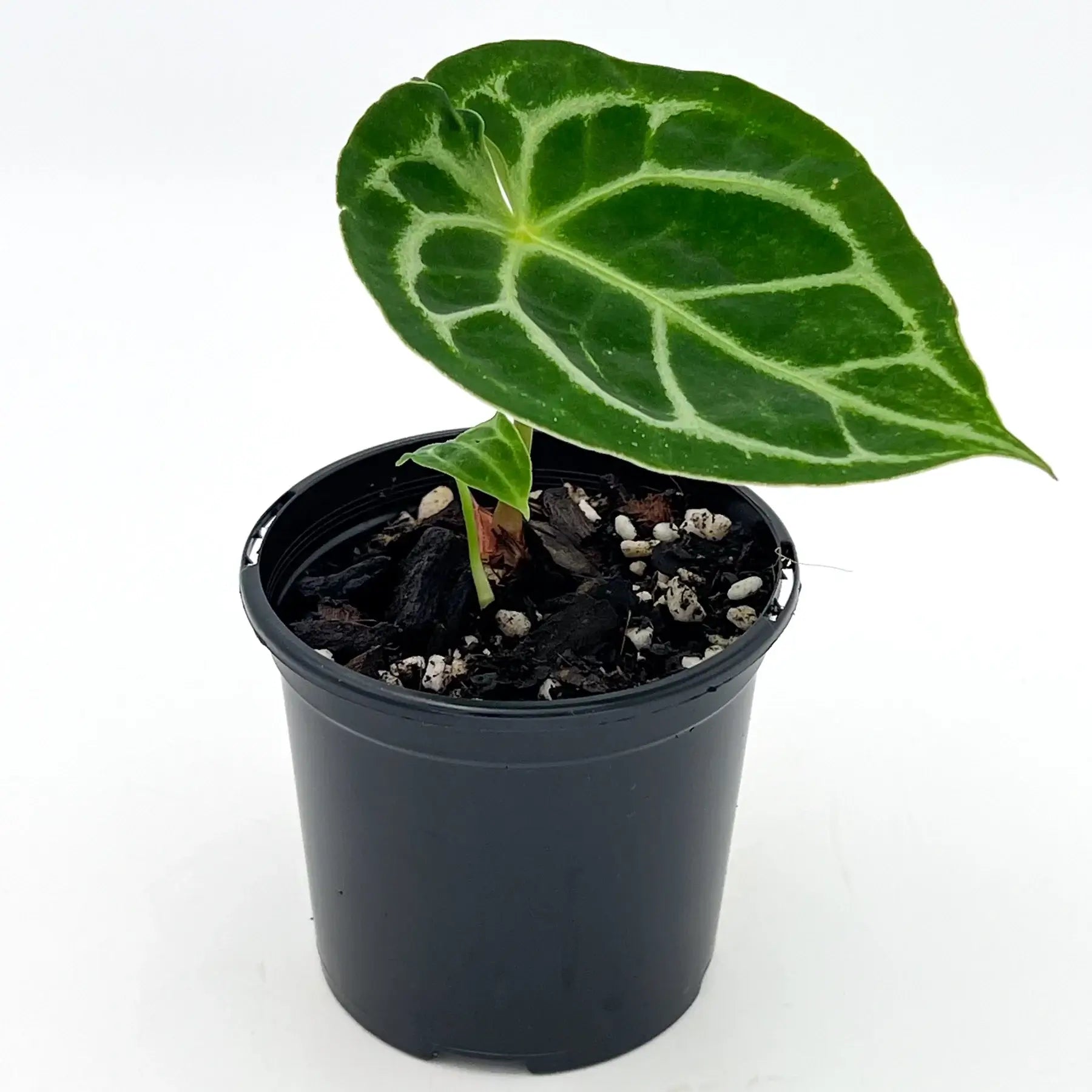Anthurium Forgetii x Crystallinum is a stunning hybrid combining the velvety texture of Anthurium Forgetii with the bold, silvery venation of Anthurium Crystallinum. Its foliage is oval-shaped with a slightly elongated form, featuring prominent white veins that contrast beautifully against the dark green leaves. Known for its compact growth habit, this hybrid thrives in bright, indirect light and high humidity, making it ideal for collectors seeking a striking centrepiece. With proper care, this hybrid will reward you with lush, velvety foliage and long-lasting beauty.