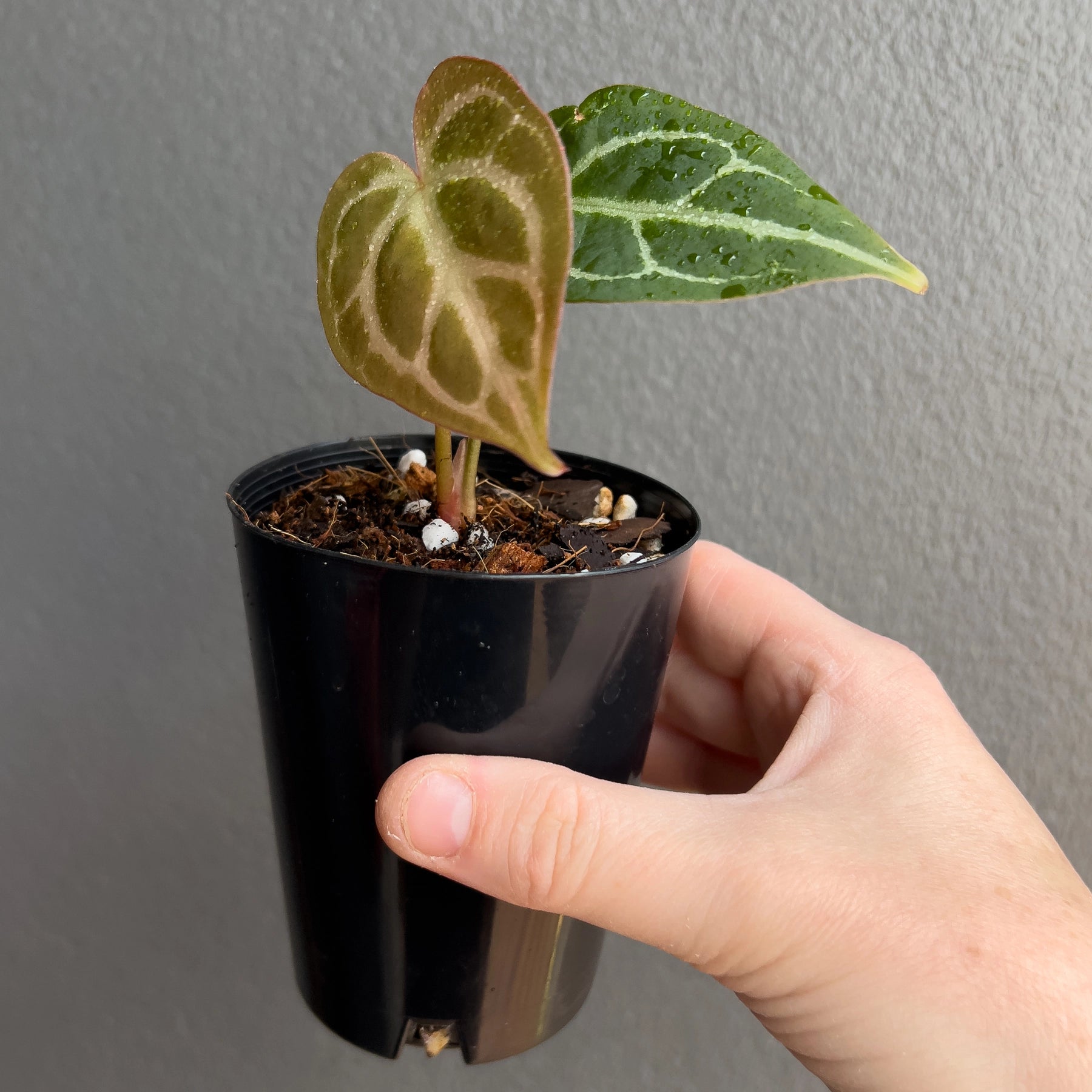 These Anthurium magnificum x forgetii S1 are seed-grown hybrids with the potential to develop even more striking foliage as they mature. Early leaves have been typically oval to slightly elongated with subtle velvety texture and venation starting to show. As the plant grows, expect more pronounced characteristics from either parent such as the strong, structured form of magnificum or the softer, dark tones of forgetii. Leaf size, texture, and vein contrast are expected to intensify with time under stable humidity, warmth, and bright indirect light.