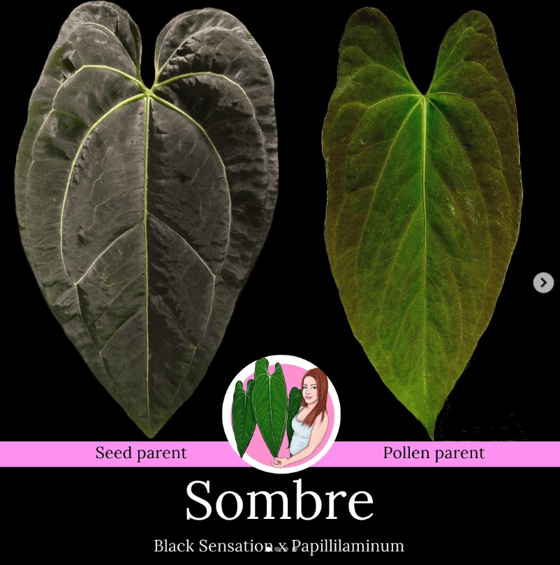 The Black Sensation parent is an original clone from @jsplantpickers, valued for its dark velvet foliage, elegant shape, and striking veining. It is paired with a pure Papillilaminum selected for vibrant foliage, dark emergent leaves with neon veins, and a slight red tone to the abaxials as they harden.