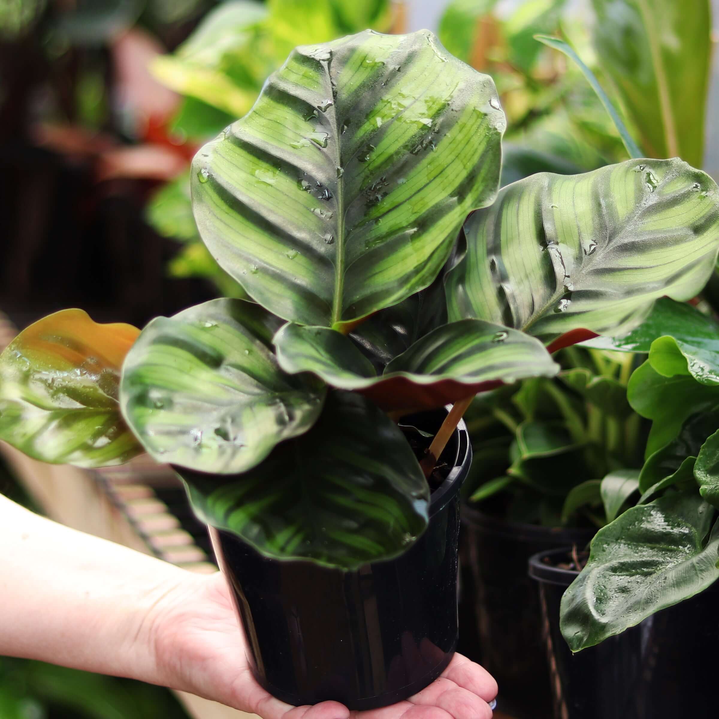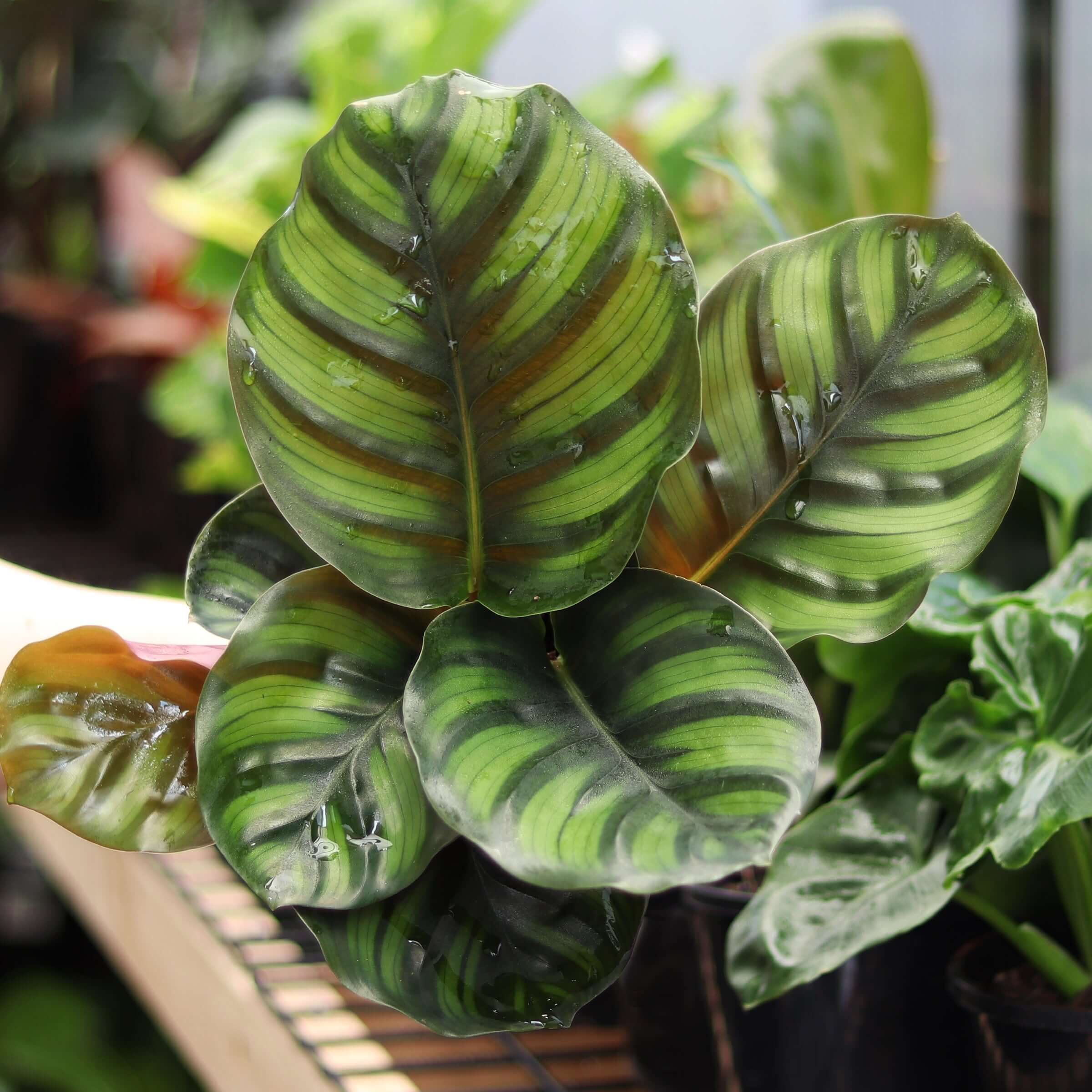 The Calathea Fasciata is a large round-leaved indoor plant with a distinctive dark green stripe pattern to the leaf with a purple underside.