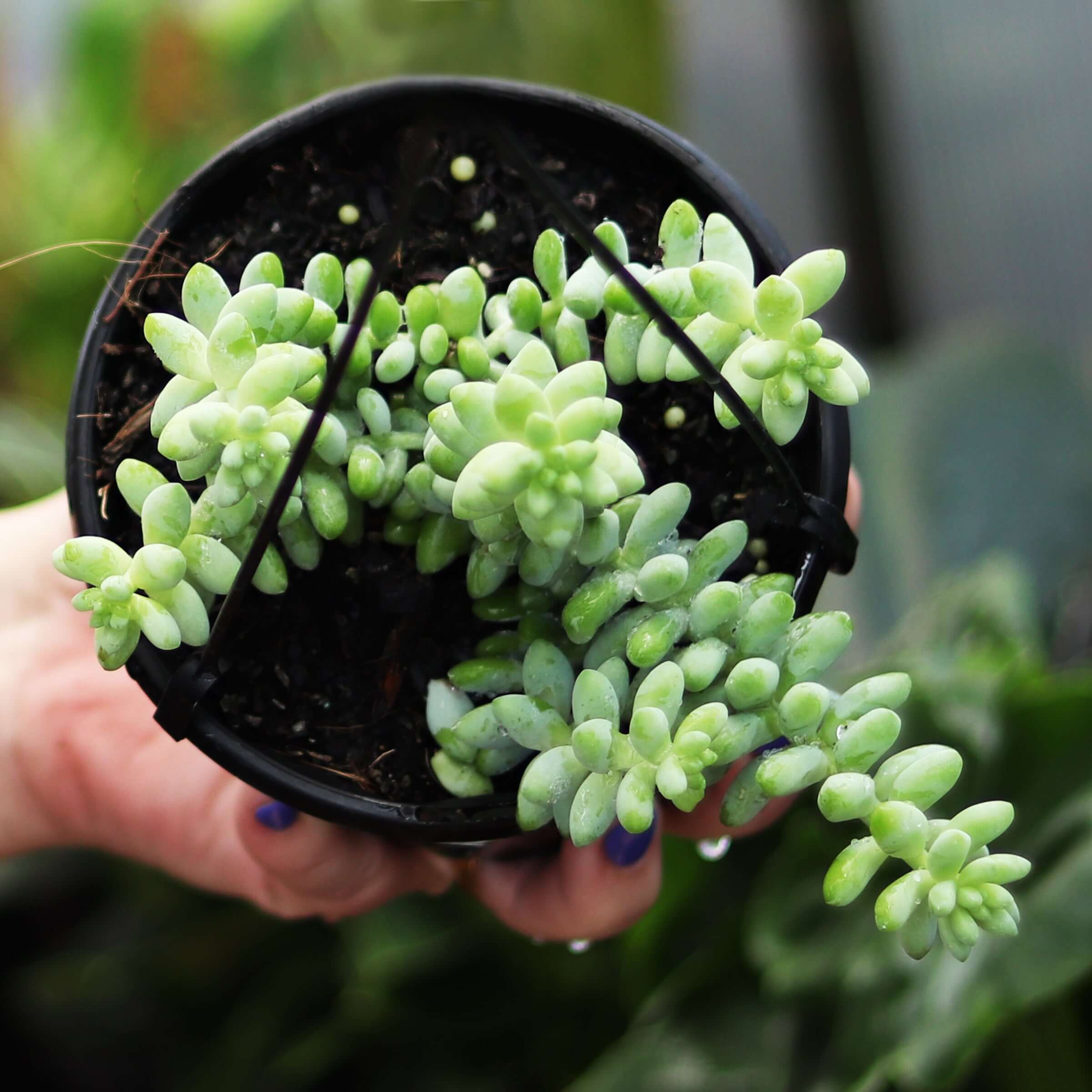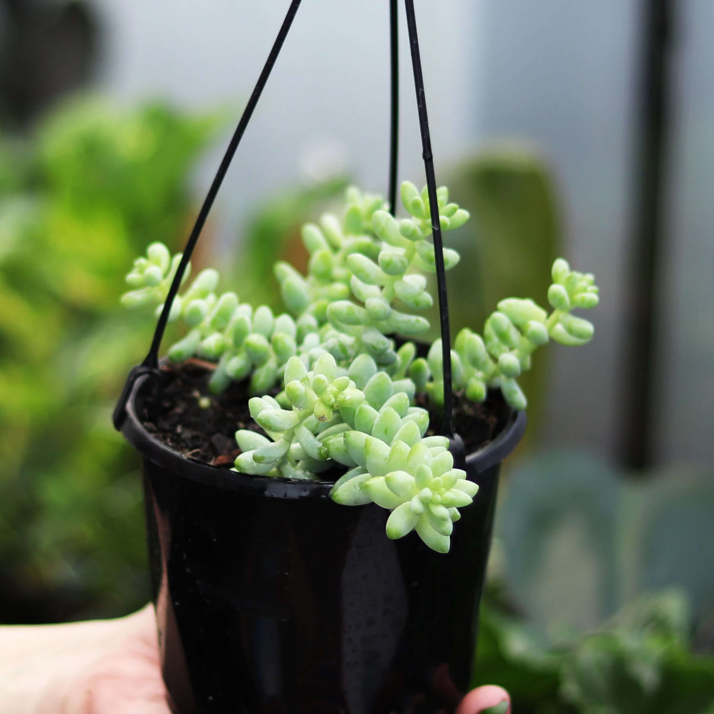 Donkey's tail (Sedum morganianum) is a trailing succulent that loves being in a hanging basket. Its stems can grow to 60 cm long and are covered in plump blueish-green leaves.