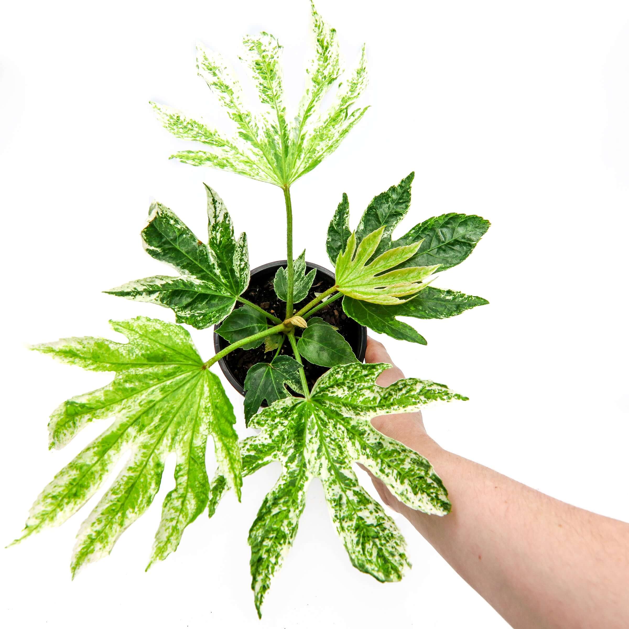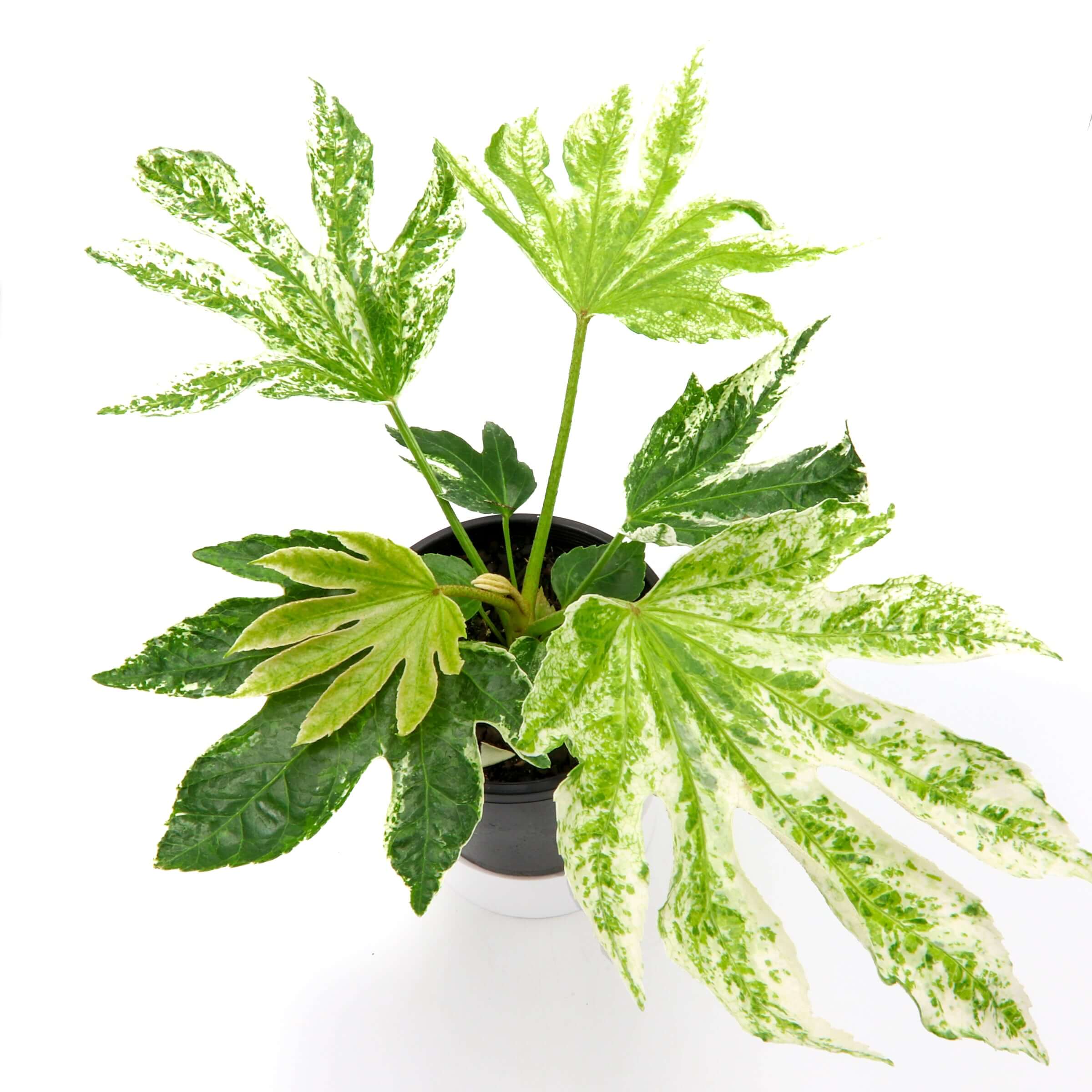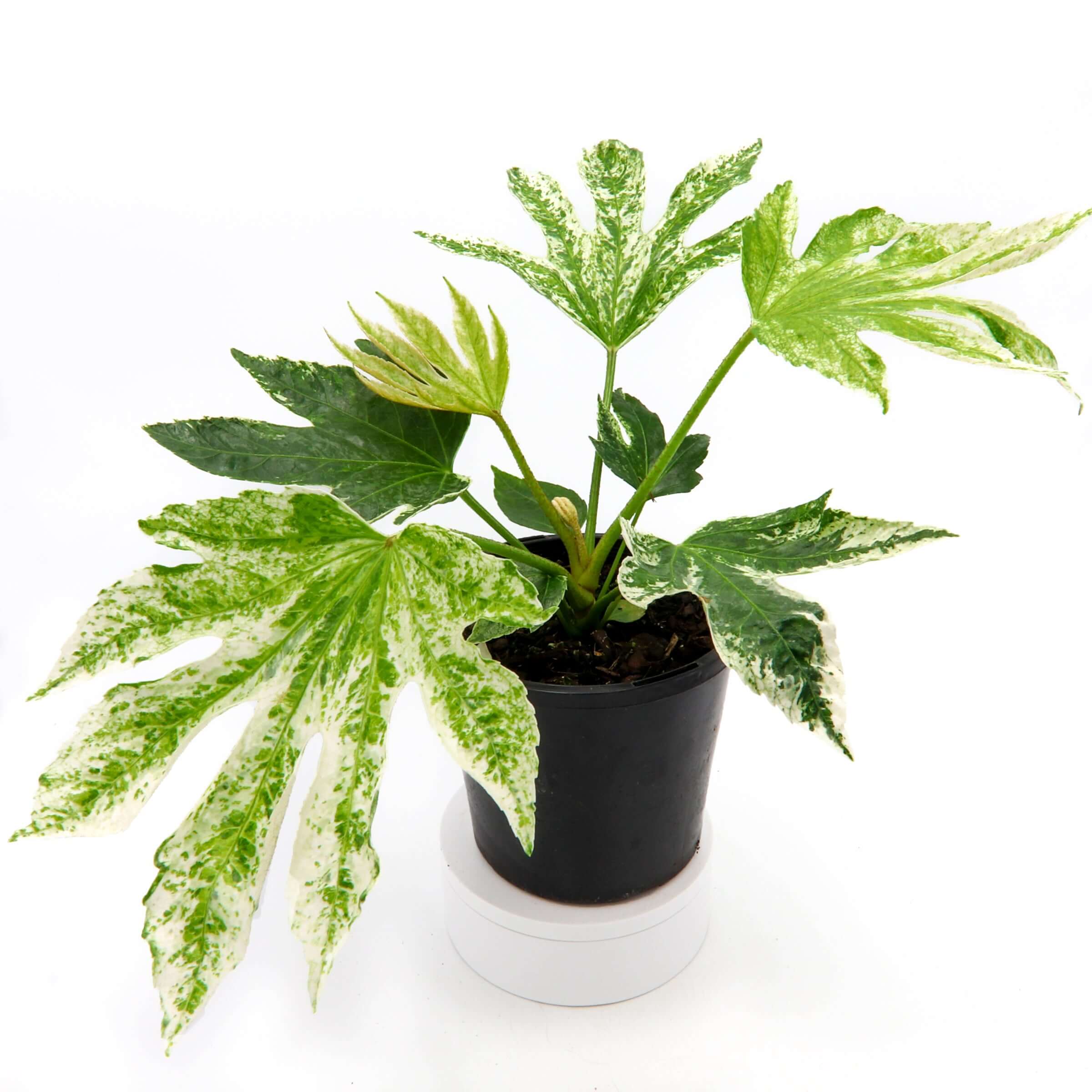 Fatsia Japonica 'Spider web' - Japanese aralia is a magnificent plant featuring large deeply lobed leaves that can grow to about 30cm in width. The leaves have gorgeous variegation of frosted white patterns like silver webbing that fade to a mature green as they age. This unusual variegation changes from leaf to leaf with the seasons giving each leaf a unique appearance. 'Spiders Web' is guaranteed to light up a dark corner.