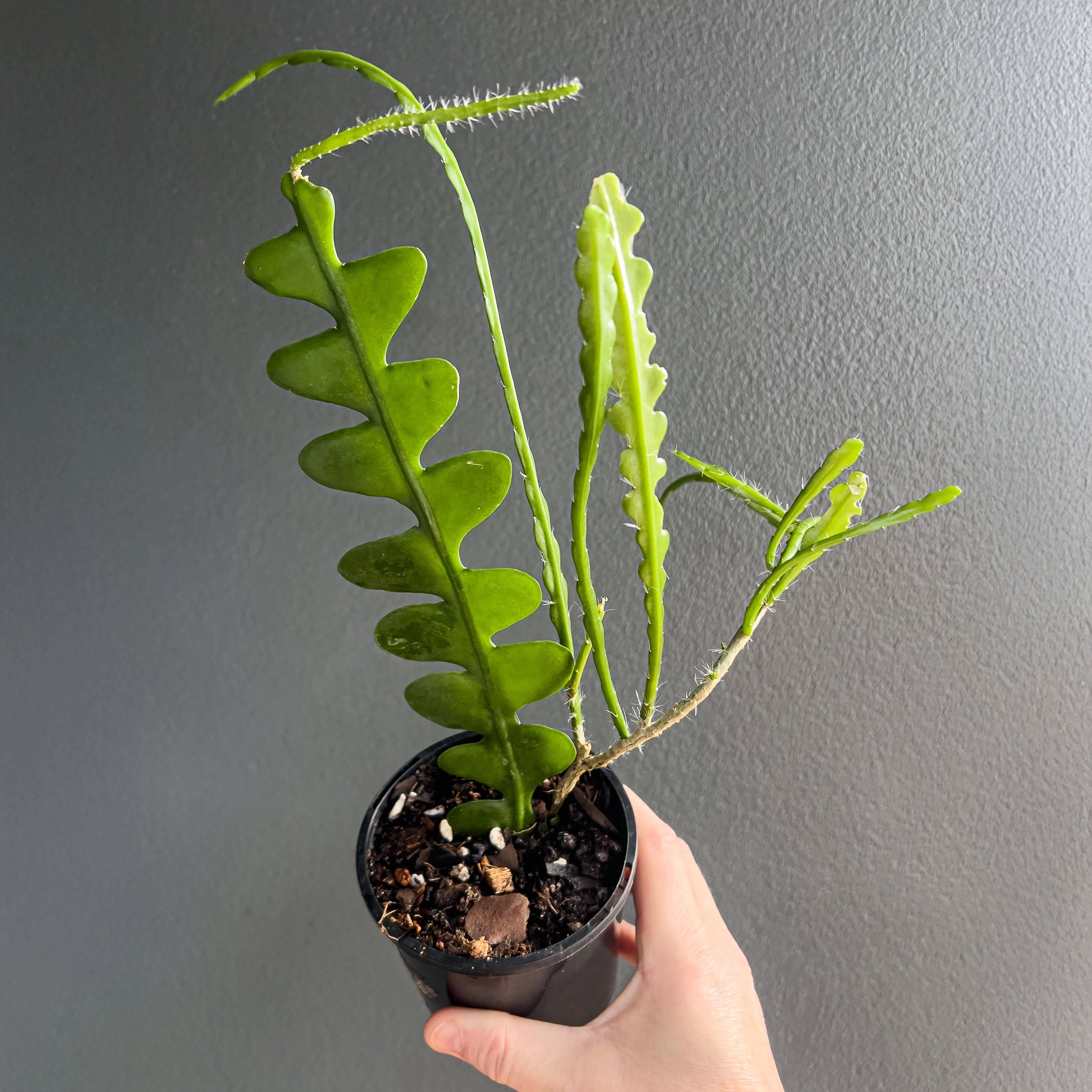 The Fishbone Cactus, also known as Epiphyllum anguliger, features long, flattened stems with unique zigzag edges, resembling a fish skeleton. Its stems are a vibrant green and can grow in a cascading pattern, making it ideal for hanging pots. In the right conditions, this cactus produces large, fragrant white or yellow flowers that bloom at night, creating a stunning contrast against the vivid green stems.