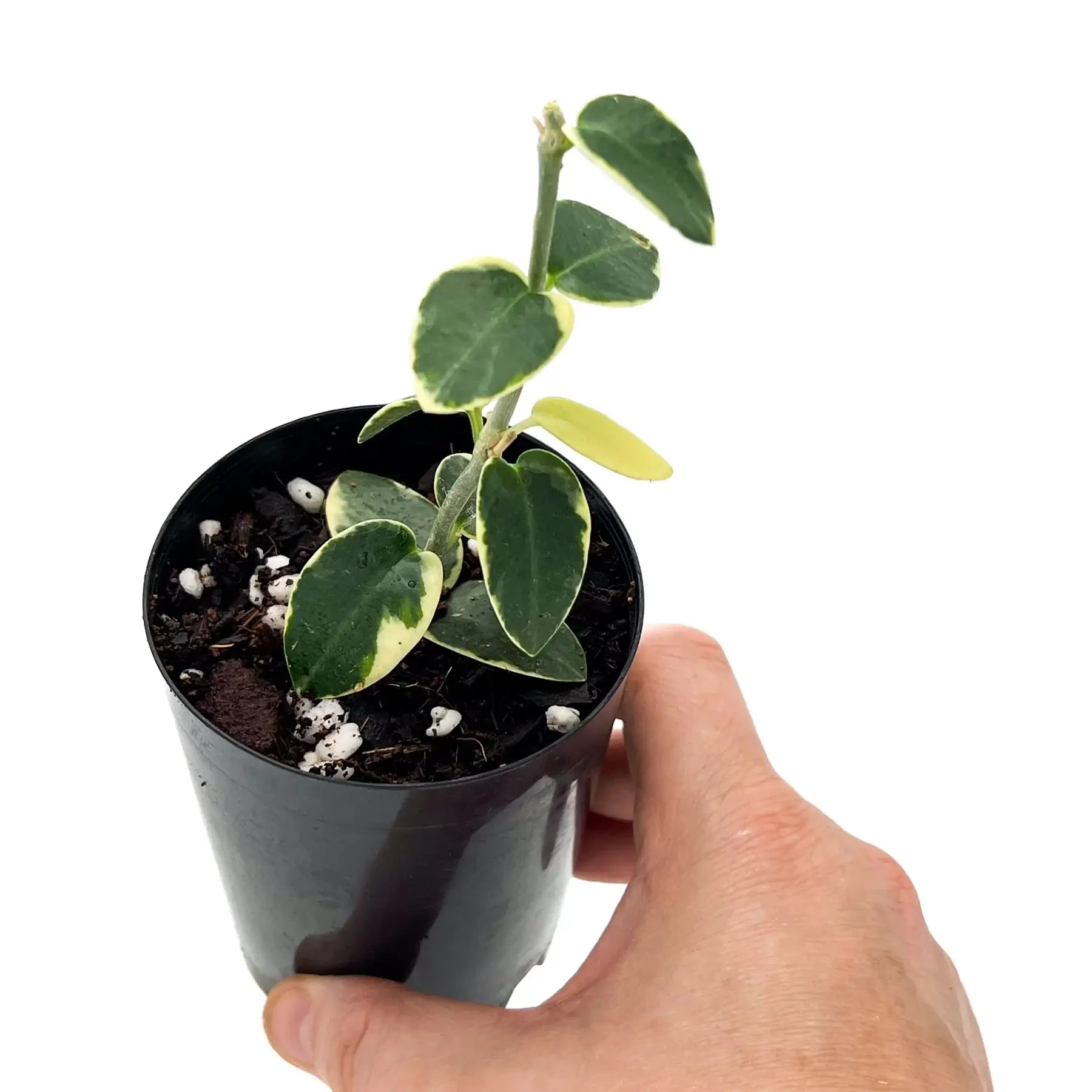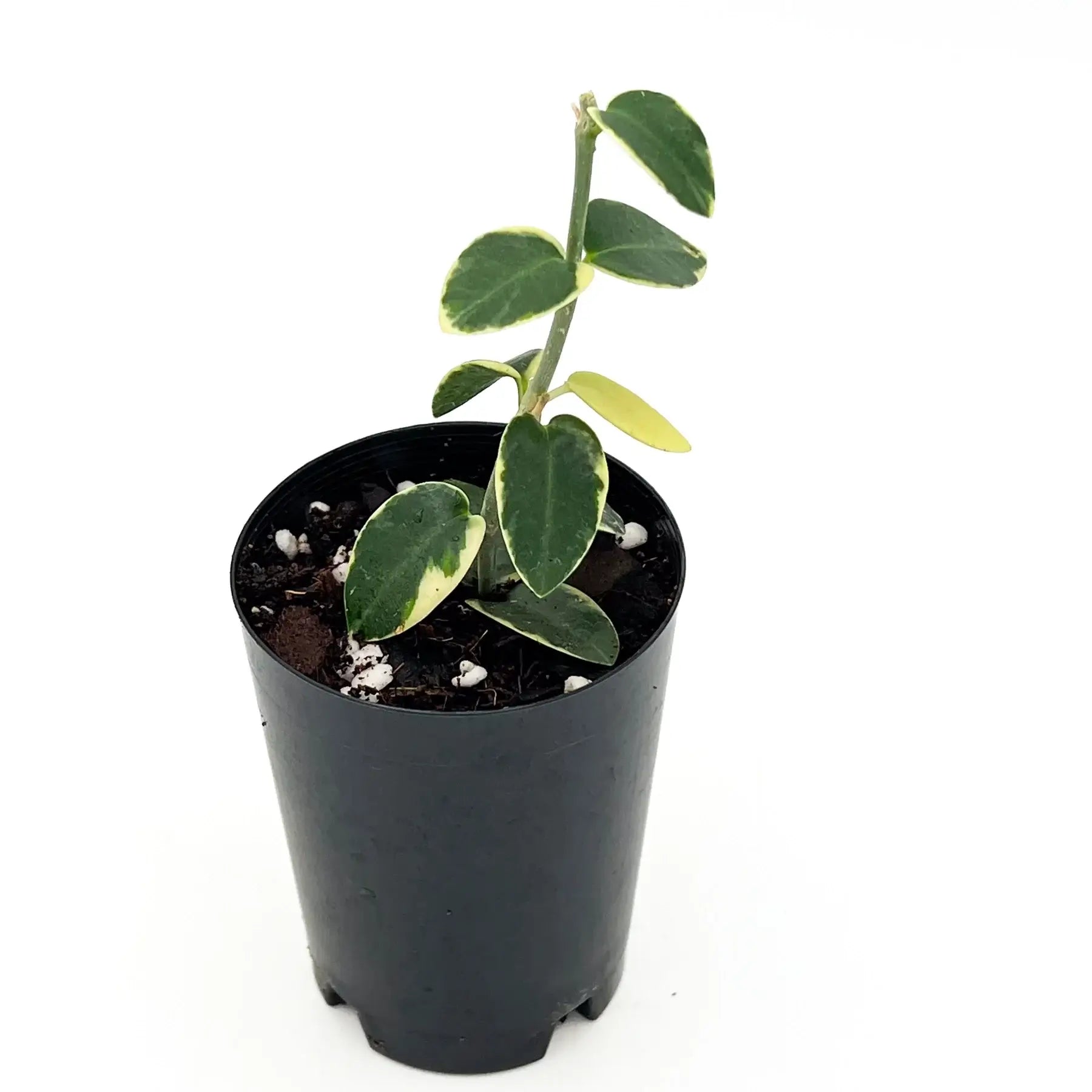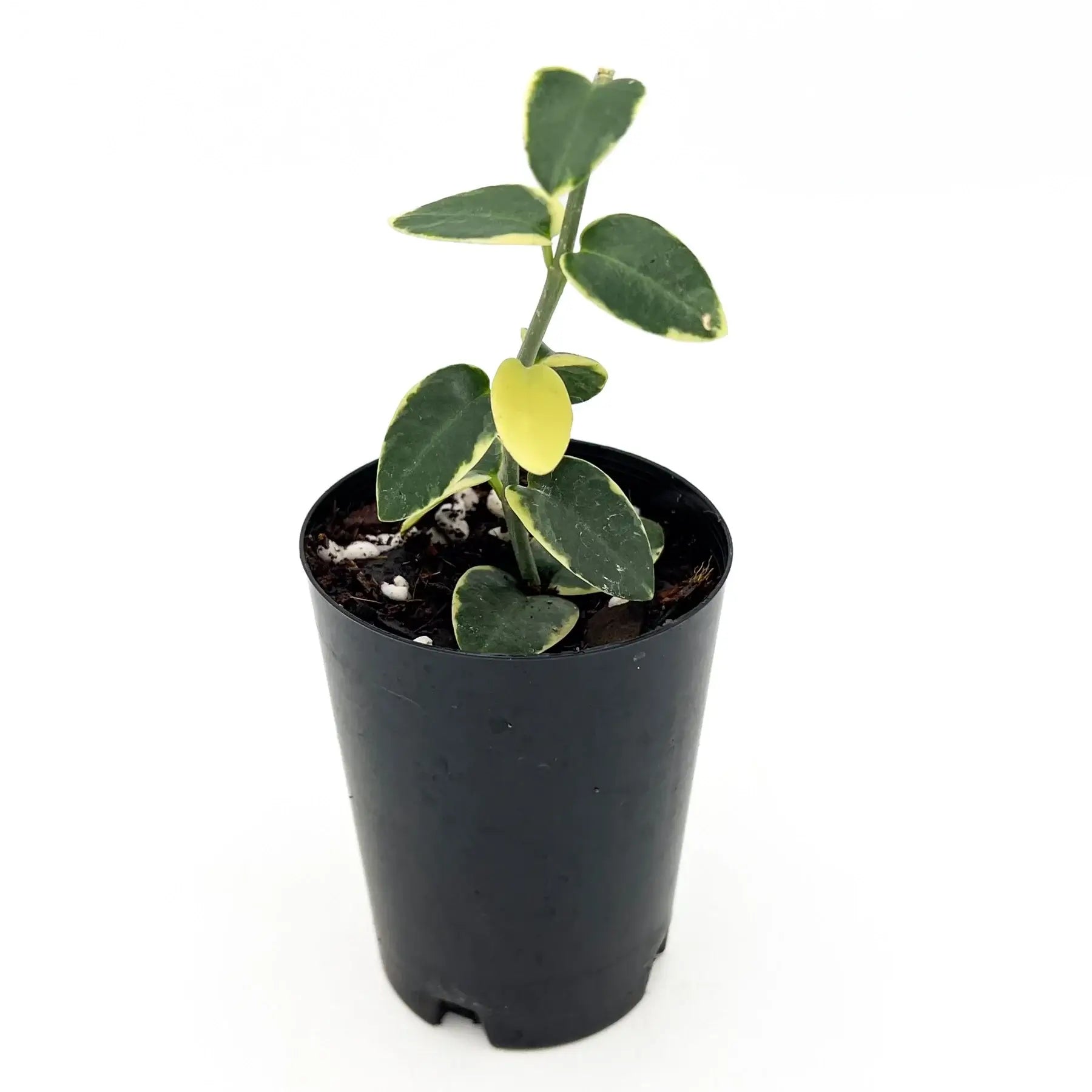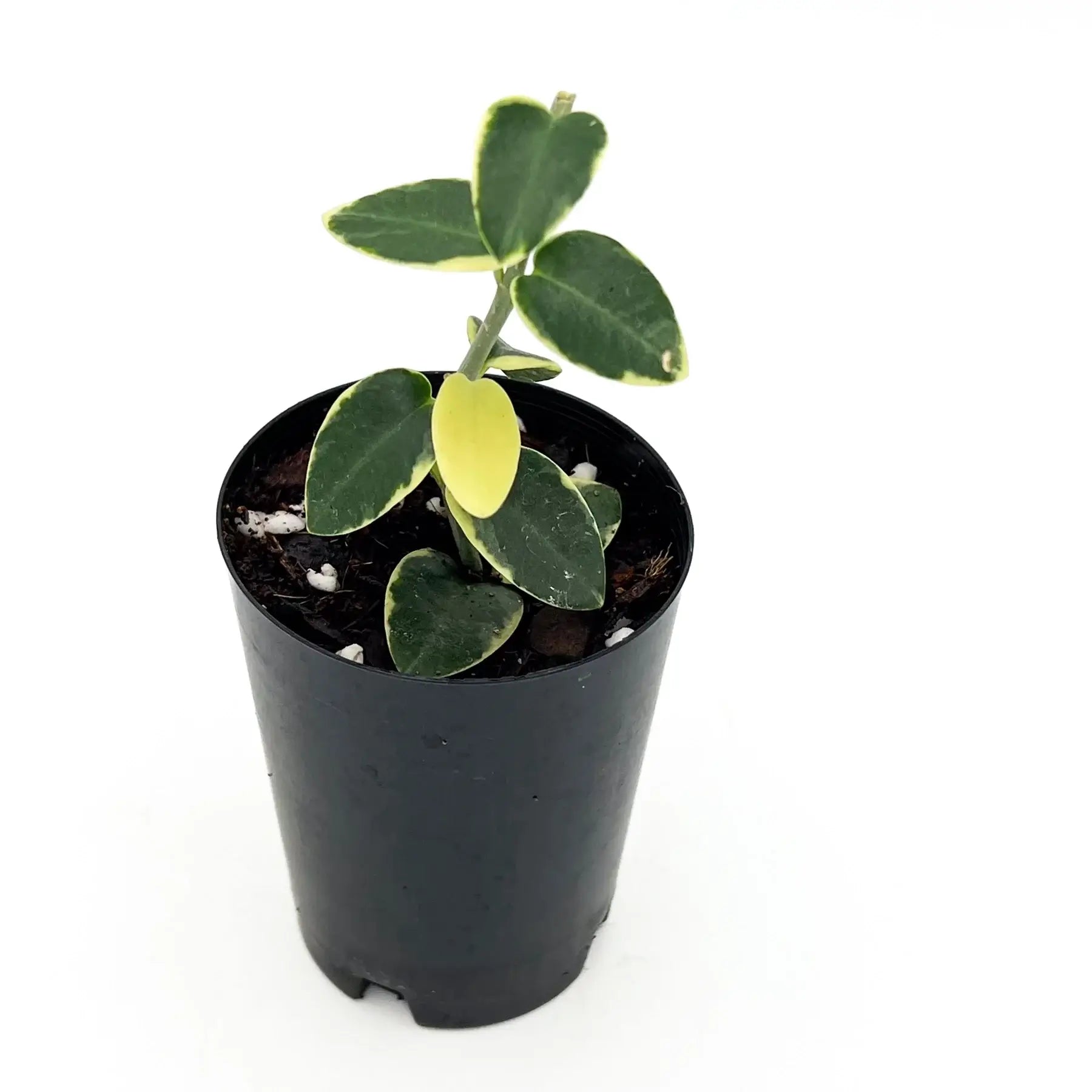 The Hoya Cummingiana Albo variegated is a compact, vining plant with green leaves with variegated white edges. When sun-stressed, the outer edges of the leaves turn pink. The plant produces reflexed yellow-orange flowers up to 15 mm in size with a deep maroon corona. Each umbel can have up to 10 flowers, which have a pleasant citrus/coconut fragrance and last up to 7 days. It thrives in bright, indirect light.