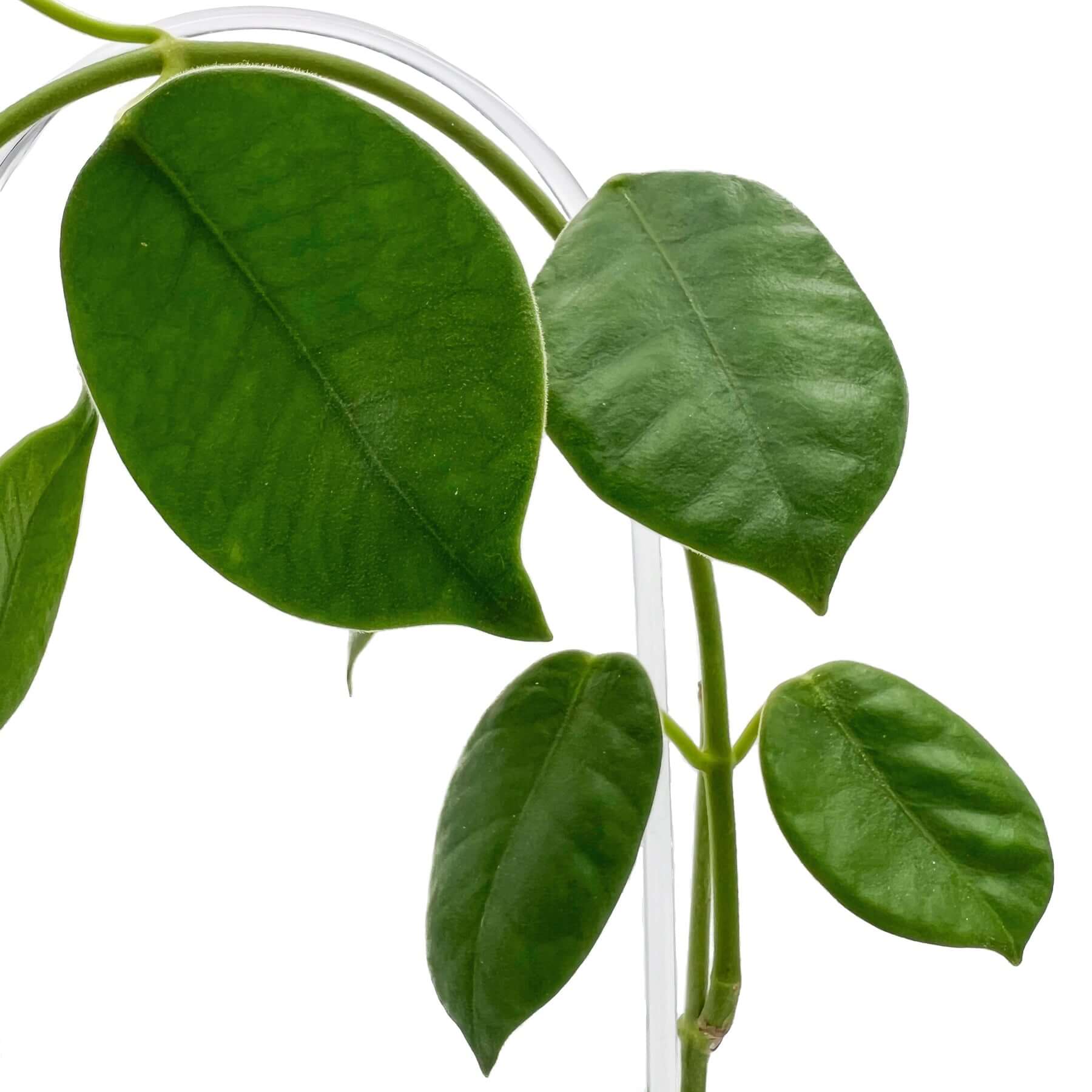 The Hoya gigas is a Hoya with thick leaves and deep burgundy flowers. It likes warm weather, but it can handle a little bit of cold for a short time. It is a harder to find variety of Hoya. The leaves are a medium green colour and feel furry on the bottom. Each leaf is about eight centimetres long and four centimetres wide. The Hoya gigas flowers are shaped like a cup and have a deep burgundy colour all over. You can grow this plant on a ladder or in a basket.