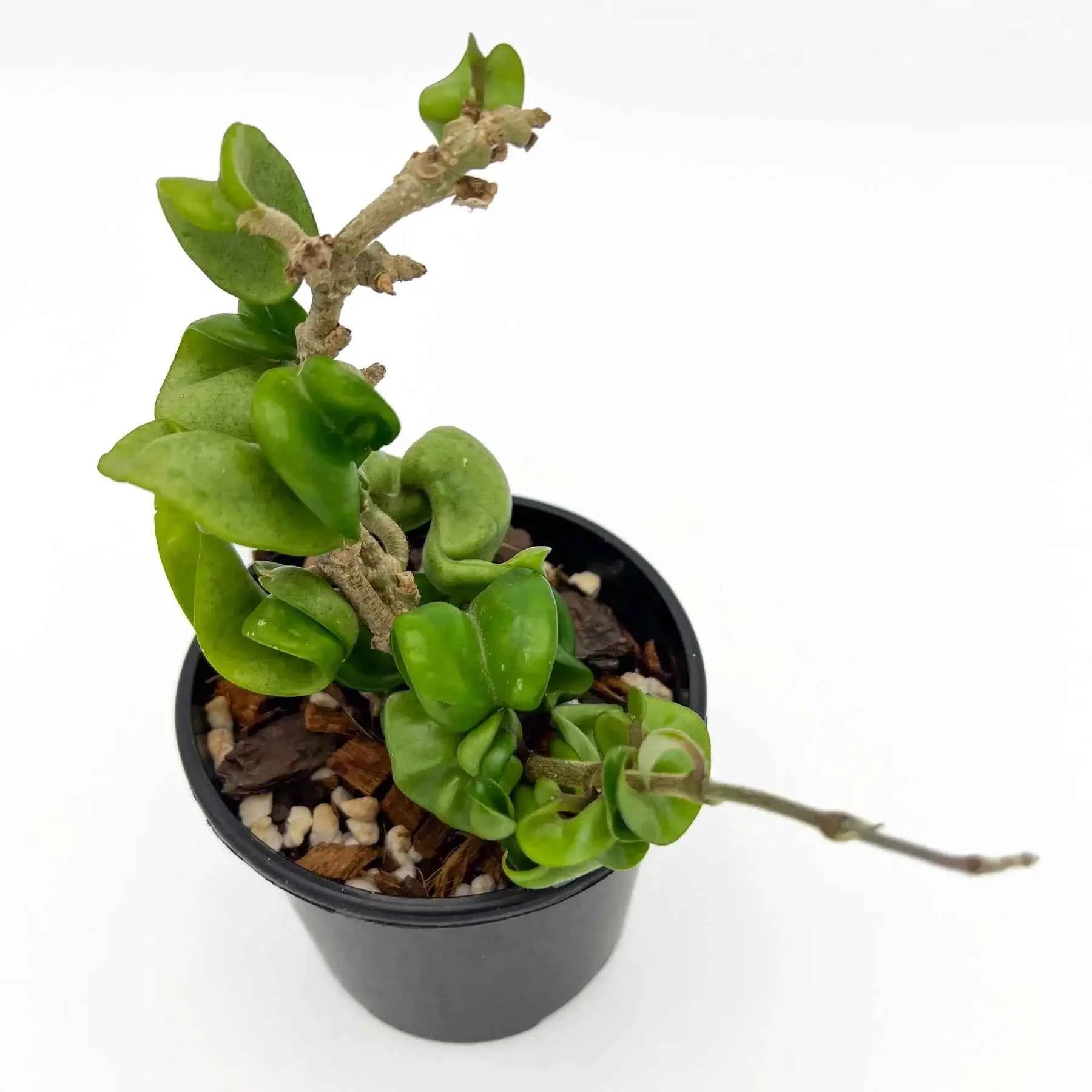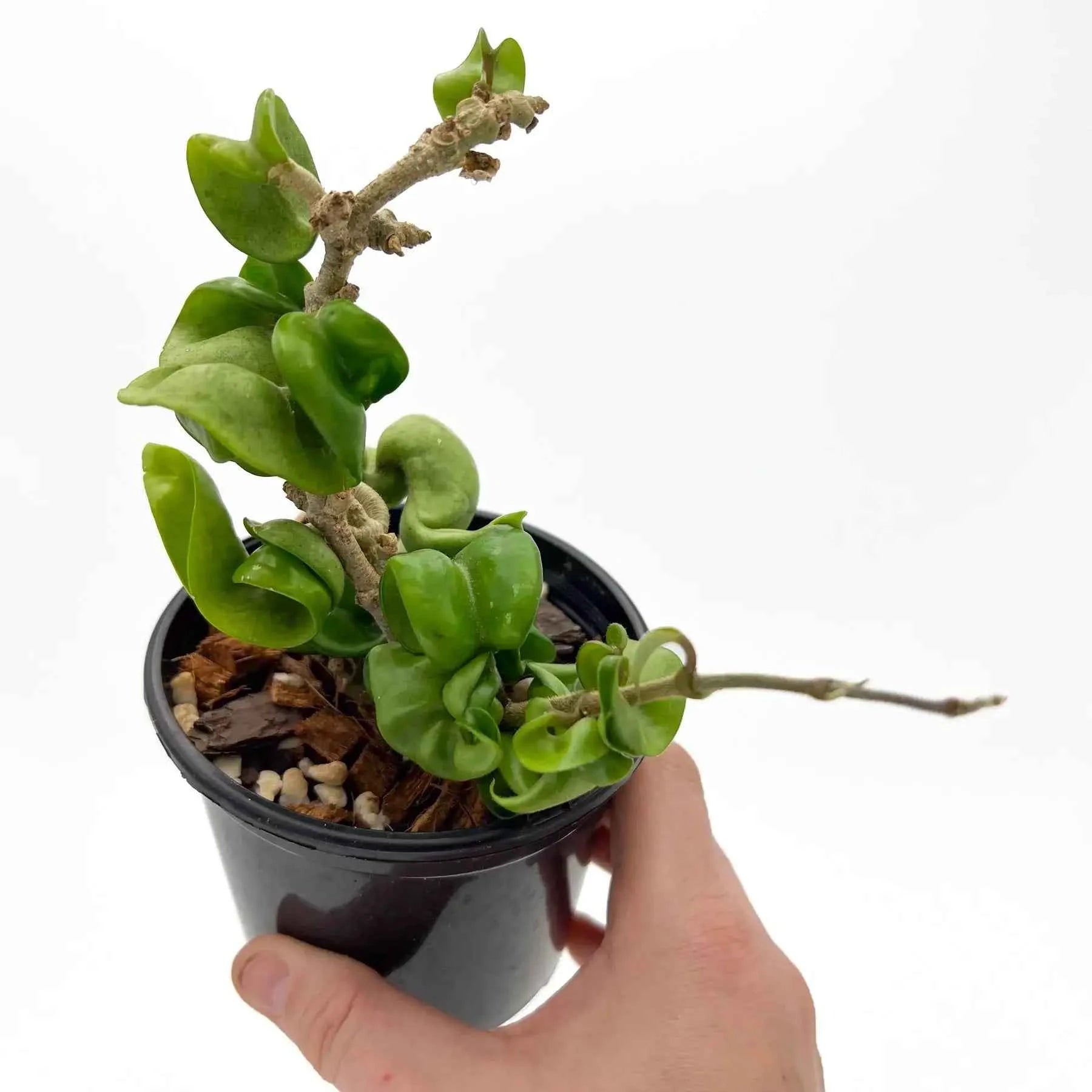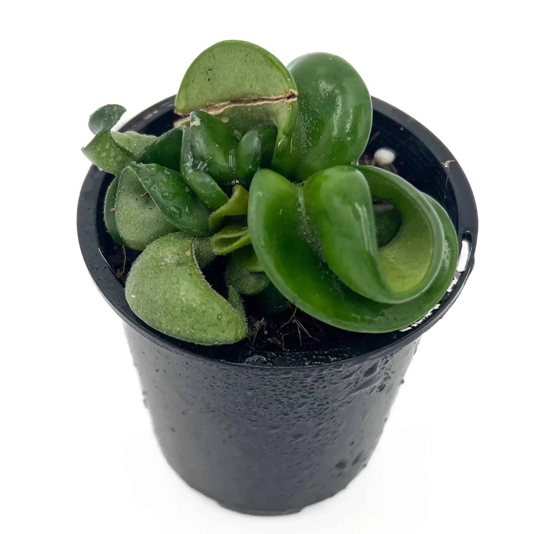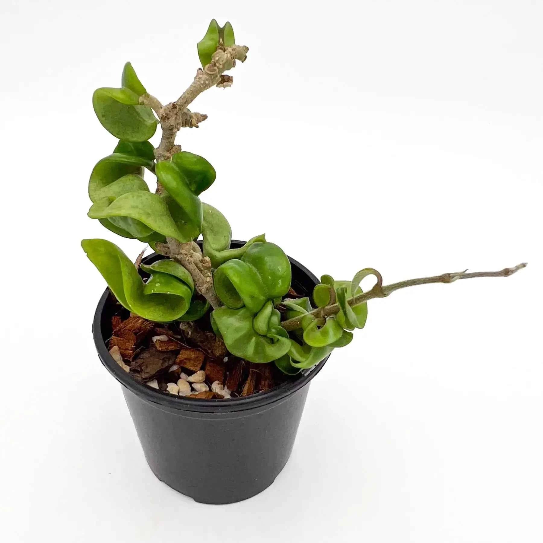 Hoya compacta Indian Rope is a draping rope-like vine with thick, twisted, curly, cupped, solid green leaves. It produces clusters of pale pink, star-shaped flowers with a red-centred white corona, and its fragrance is Light and resembles chocolate, especially at night. The Hoya compacta Indian Rope is quite popular as a houseplant and is relatively easy to care for.