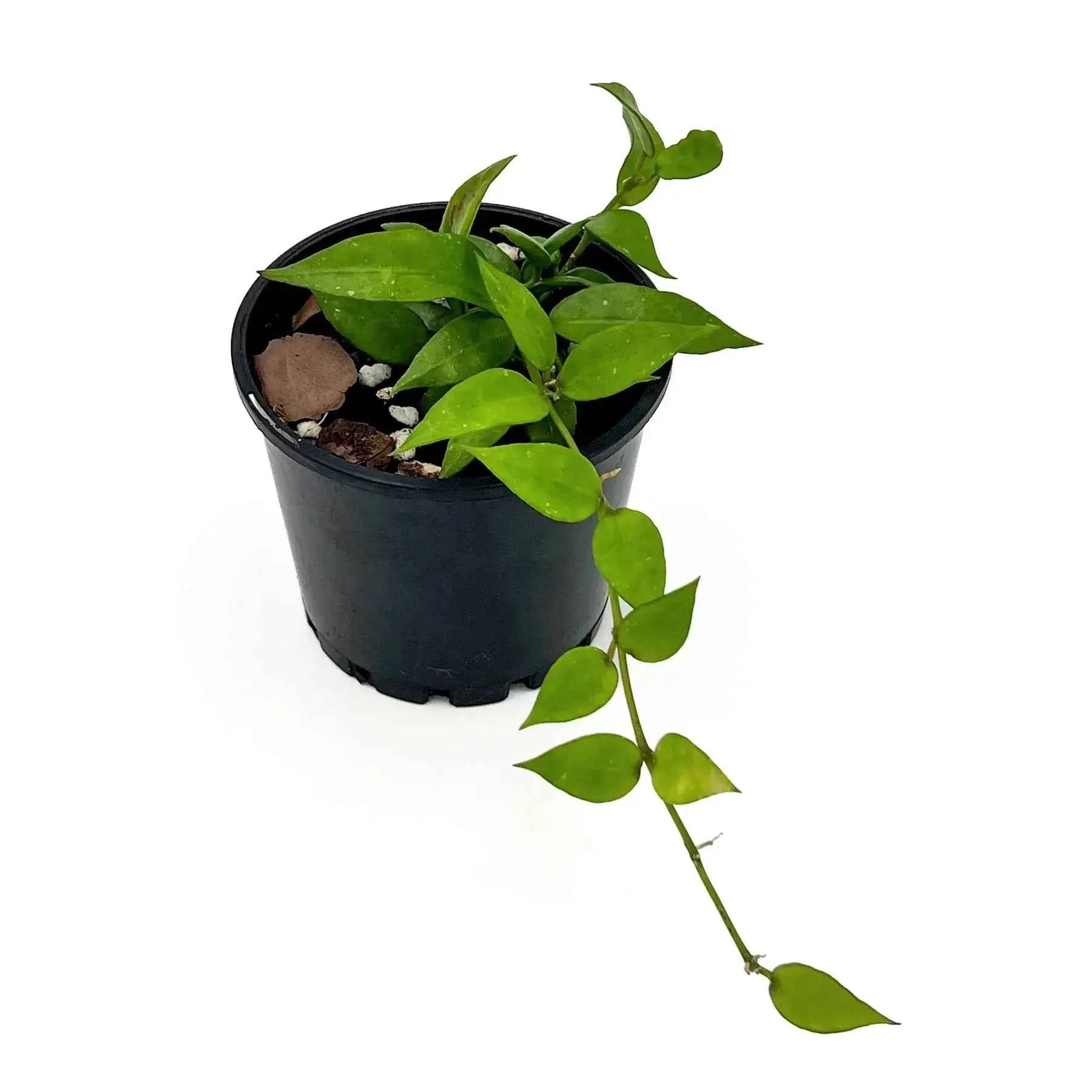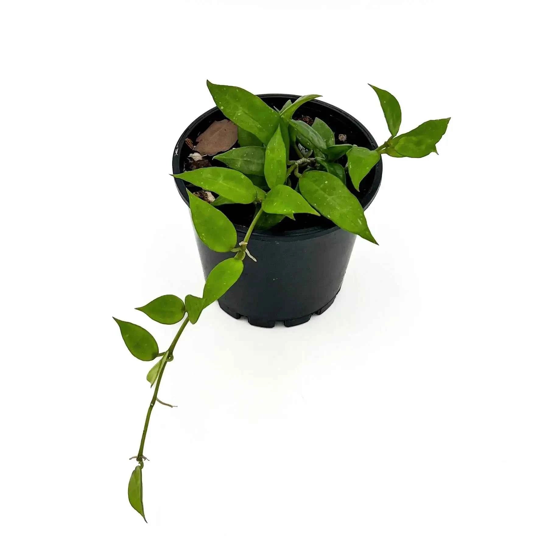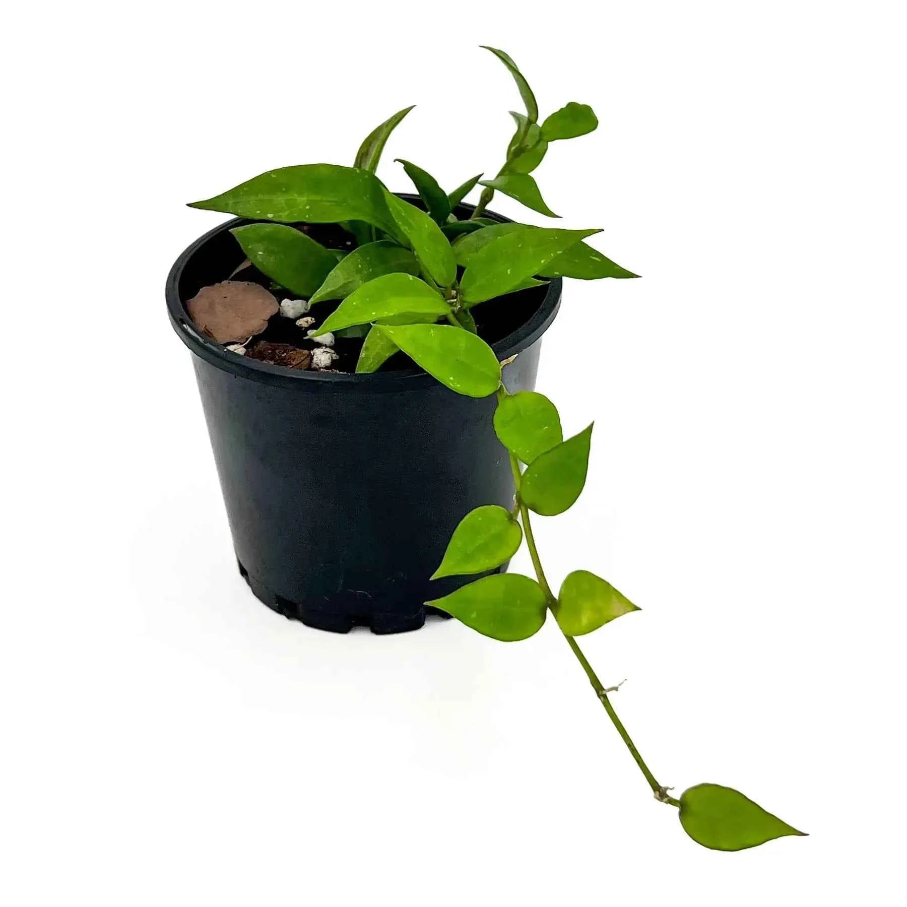 Hoya lacunosa features glossy, elliptical leaves with prominent veins and a waxy texture. The leaves are typically small to medium-sized, and the plant produces clusters of fragrant, creamy-white fuzzy flowers with a lemon yellow corona. This cascading beauty is a popular choice for indoor spaces, known for its resilience and charming aesthetic and perfect for hanging planters.